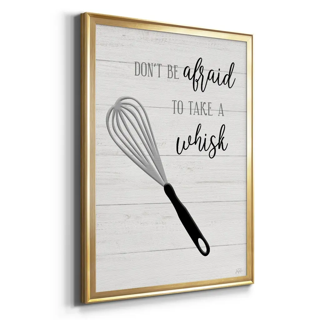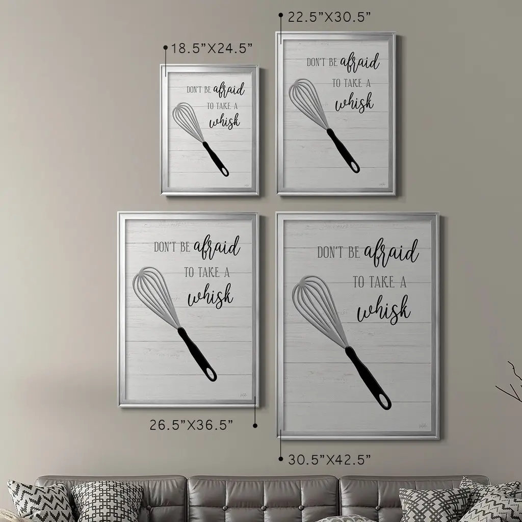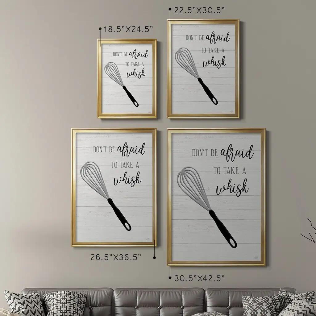 Take A Whisk Premium Framed Print - Ready to Hang A Premium Framed Print created to last. Framed in distressed wood and available in an array of sizes and colors Featuring a beveled a solid wood stretcher bar, each piece comes ready to hand 4 SIZES AVAILABLE 30.5''X42.5'' - Overall Size 26.5'X36.5'' - Overall Size 22.5''x30.5'' - Overall Size 18.5''x24.5'' - Overall Size Each piece is made to order. Each piece comes with hanging hardware. Made in the USA Ready to Hang