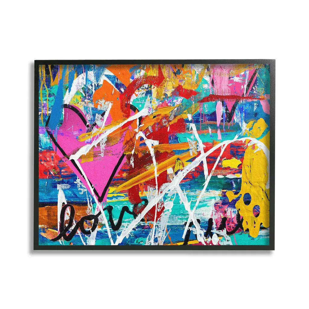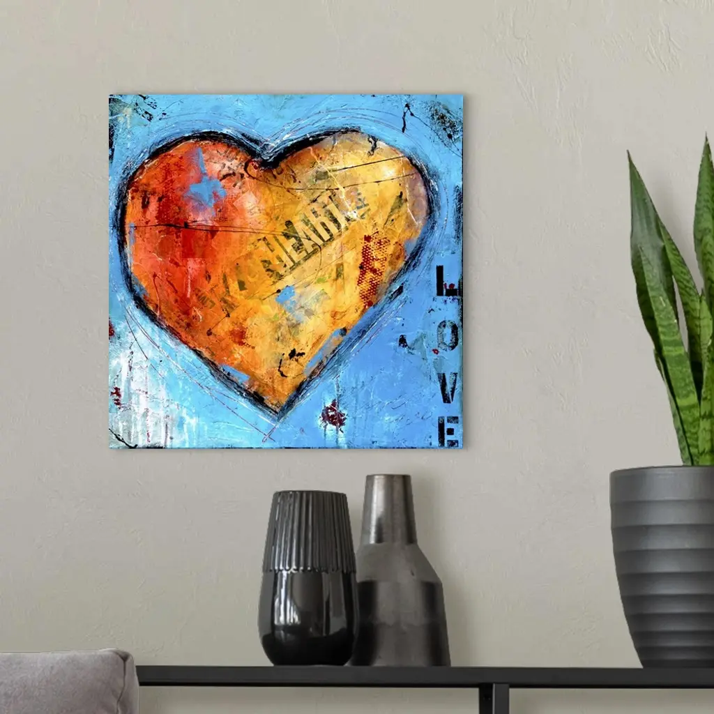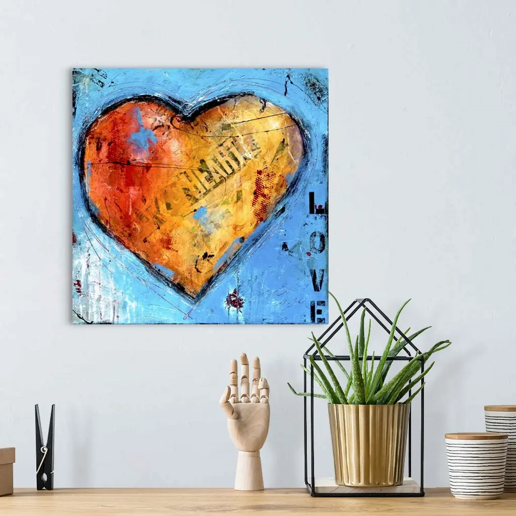 Contemporary artwork of a large orange heart with found lettering on blue.