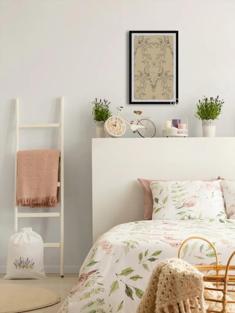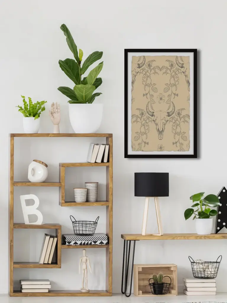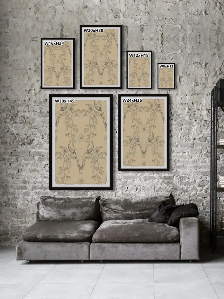 This detailed drawing print features a symmetrical collection of drawings made up of flowers, a bull''s head, and plants. Proudly printed in the USA, this piece is printed on high quality archive paper and professionally hand-framed. With wall-mounting hooks included, this artful accent is ready to hang up as soon as it reaches your front door.- Top quality Giclee print on high resolution Archive Paper- Hand cut deckled edges- High quality durable non-warping frame- Finished under shatter resistant plexiglass- Arrives ready to hang- Includes a certificate of authenticity- Printed in the USA