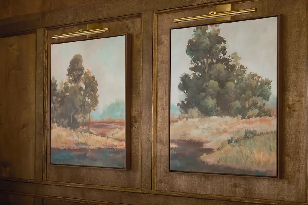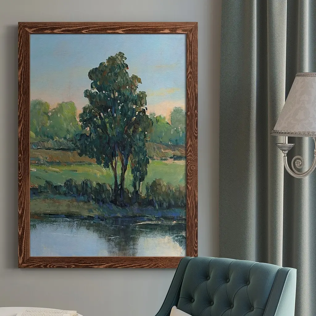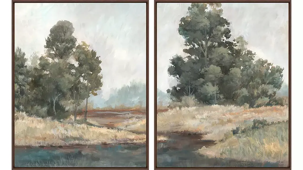 Our Taking a Scenic Route canvases depict tranquil and serene landscapes. The composition of neutrals, greens and blues captures the essence of the great outdoors. Complemented by a natural wood finished frame, this piece is available in two different versions. Hang one by itself to make a solitary style statement or pair both together for a complete look at serene scenery. Please select your style before adding to cart.