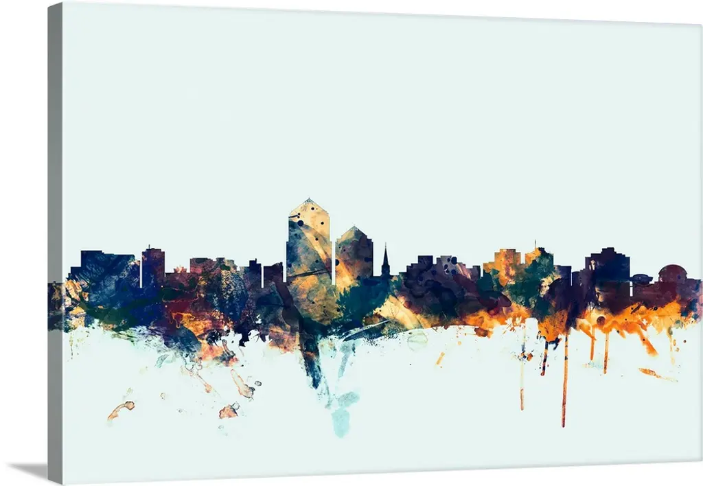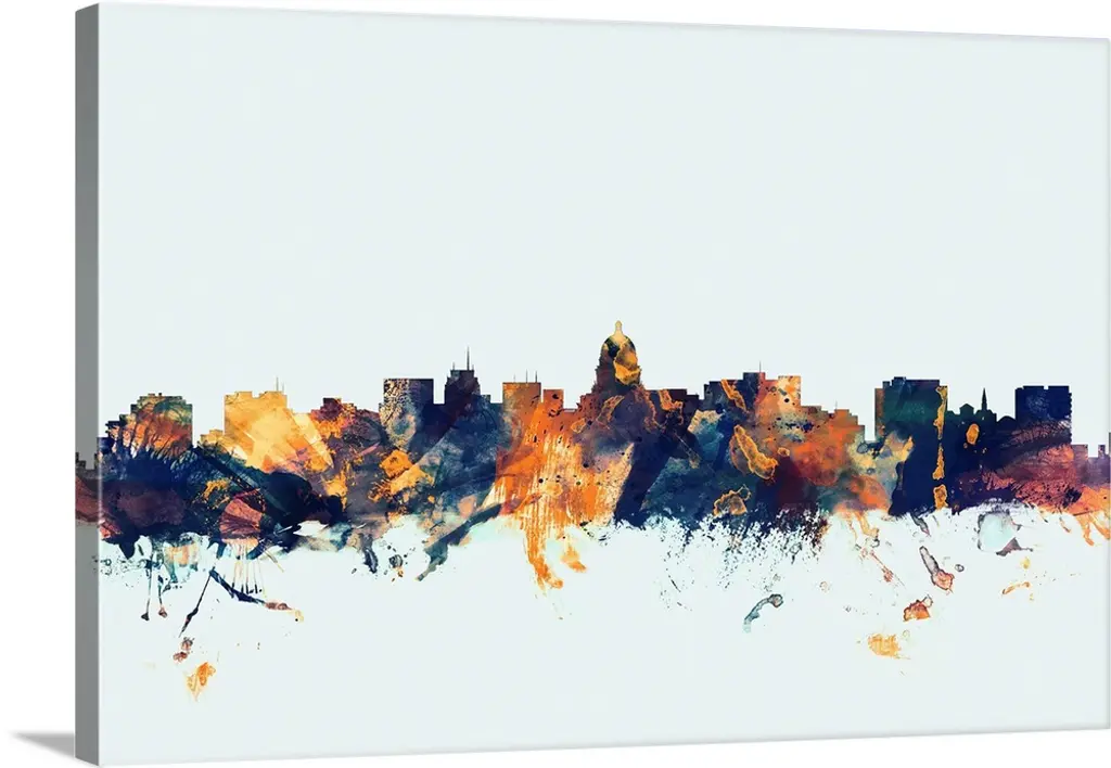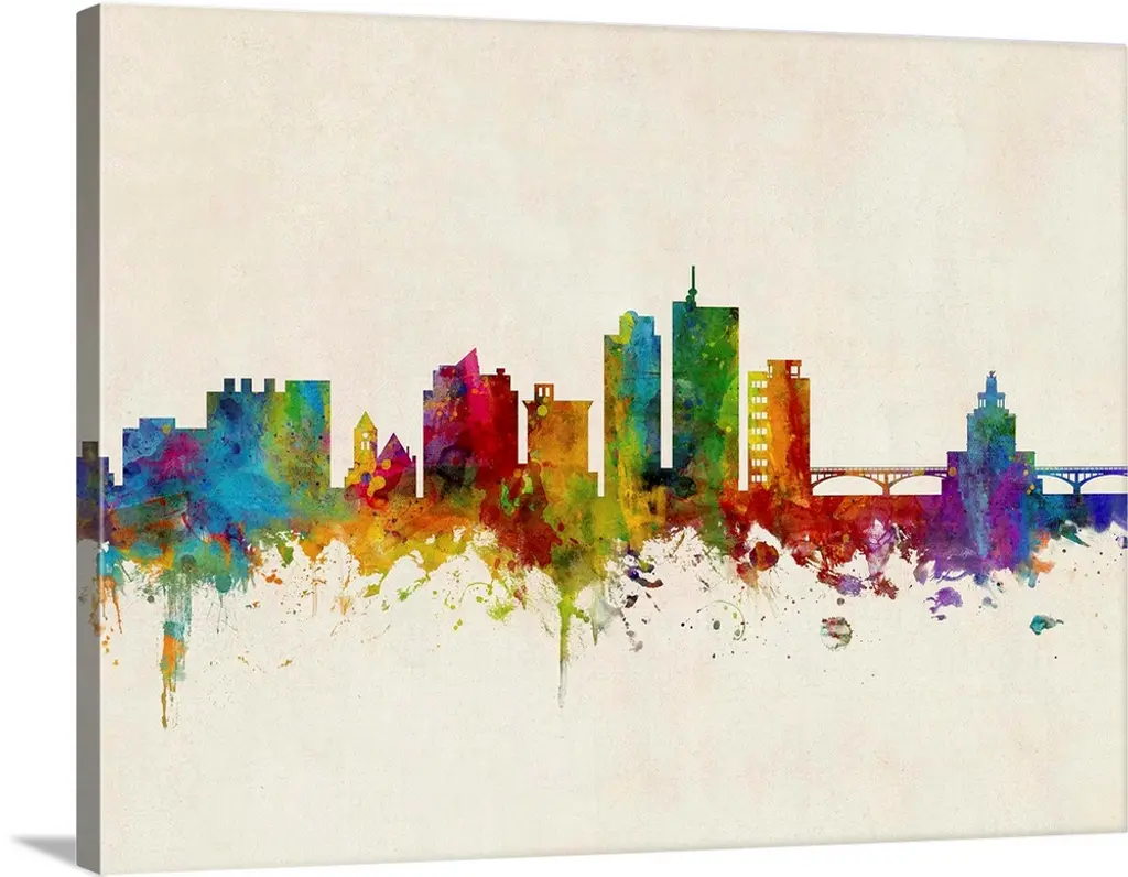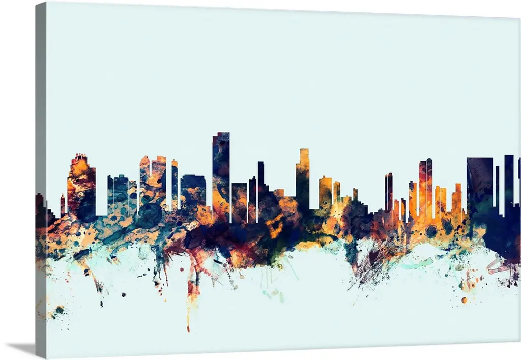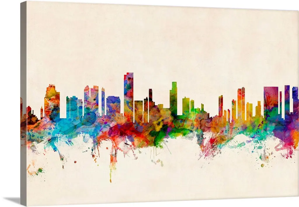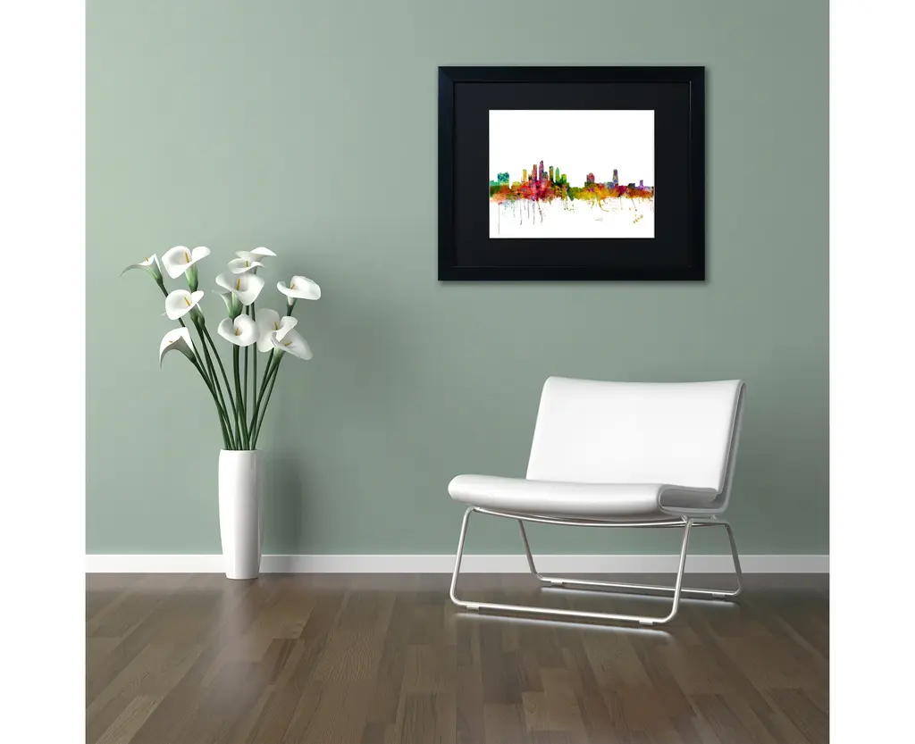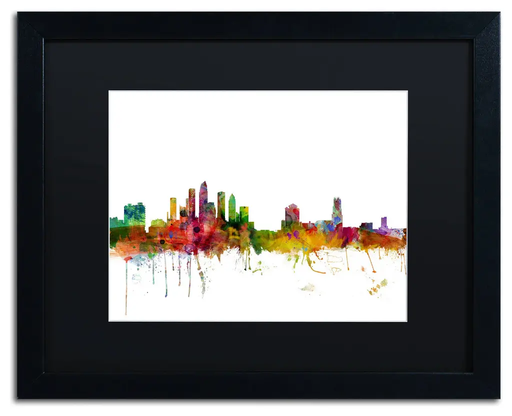 Title: Tampa, Florida SkylineArtist: Michael TompsettProduct Type: Matted Framed Canvas ArtSize: 16" x 20"Matte Color: BlackFrame Color: BlackMade in the USA.Art and design were always Michael's favorite subjects at school. He was fortunate to land a job as a graphic designer at one of London's most prestigious publishing companies. After 12 years Michael Topsett made the decision to pursue a full-time career creating his own work. The freedom and time to be able to focus solely on his own projects has been a wonderful experience. Athrough Michael likes to experiment with different styles and subjects, hi main focus is on map art. He enjoys looking for unique and interesting ways to depict something which is very familiar. Maps are visual representations of the world we live in, a world which is incredibly diverse. Apart from maps, Tompsett creates urban landmark and cityscape designs.An 11" x 14" giclee print under acrilyic in an 16" x 20" Black Frame. Giclee (jee-clay) is an advanced printmaking process for creating museum quality fine art reproductions. This high quality print is matted using Black Matting and comes in a Black Frame. A clear acrylic facing is added to protect the print. The piece is fully assembled by professional framers and comes ready to hang.Materials:Canvas: 100% Cotton, Frame: MDF, Matte: Paper-Laminated 100% Wood Fiber Core, Facing: Acrylic