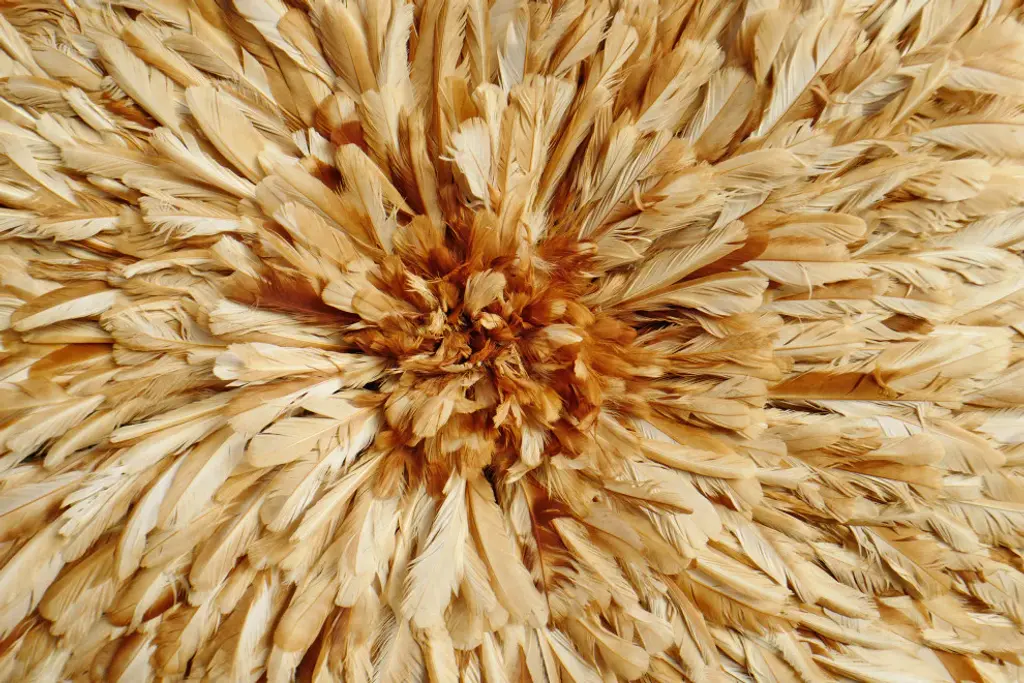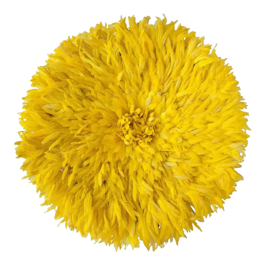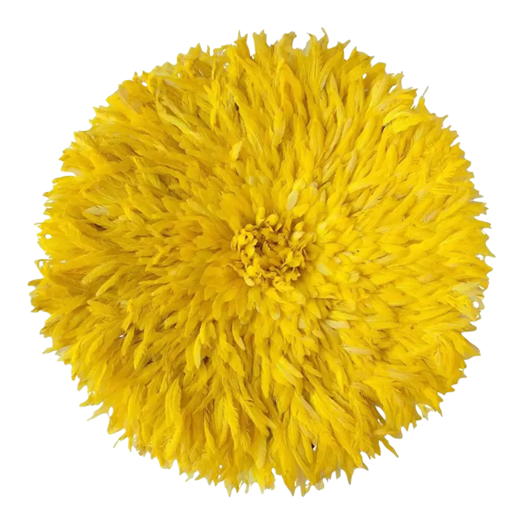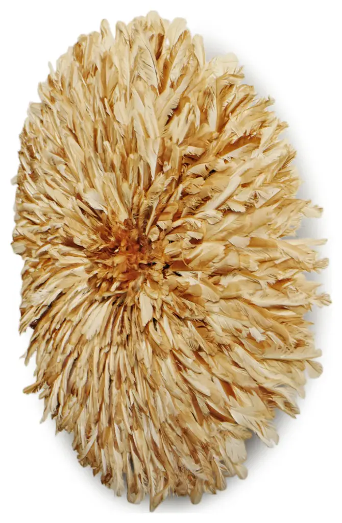 Beautiful hand crafted original JuJu hat wall art. These attractive natural bird feather art form were originally worn as a headdress by dignitaries, chiefs, and the royal families also wear these ceremonial hats as a symbol of prosperity and wealth. Created from woven natural or brightly colored dyed wild chicken feathers then tied to straps and pulled open into a stunning circular display. Each is unique. Sizes vary approx. 28" - 32" diameter.