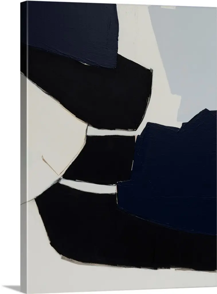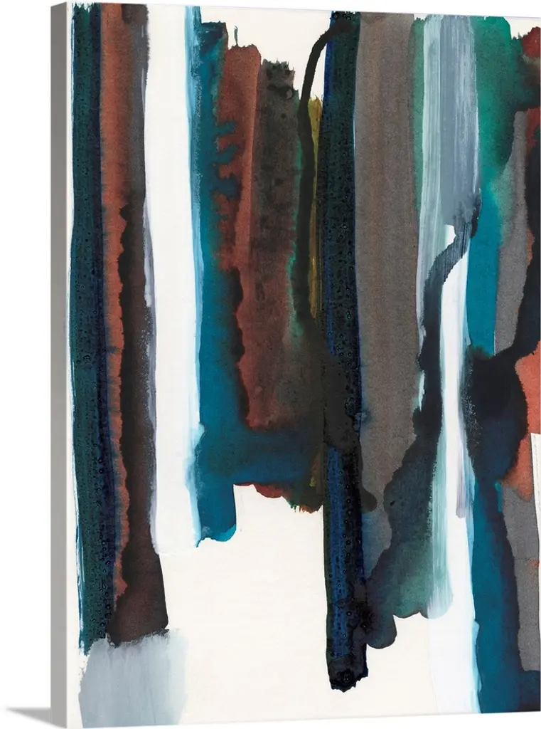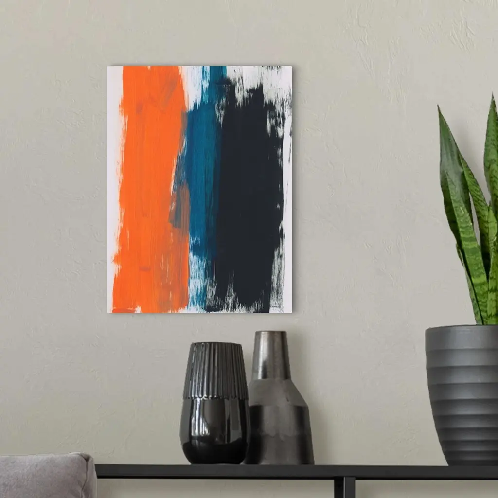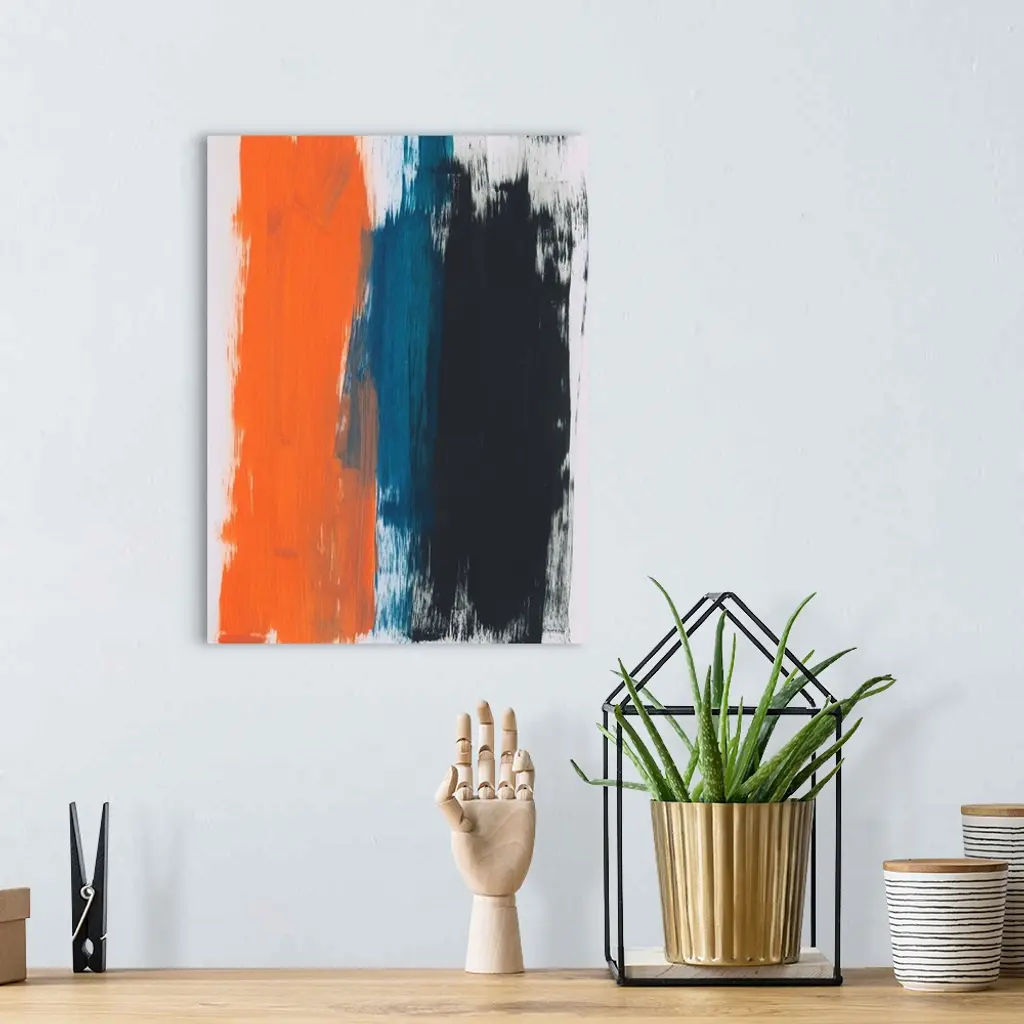 Abstract painting of bold vertical brush strokes in orange, blue and black on a light gray background.