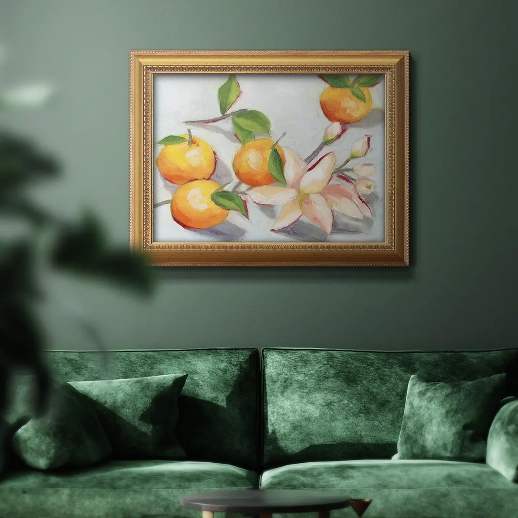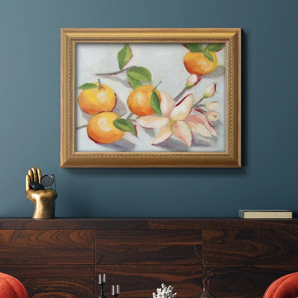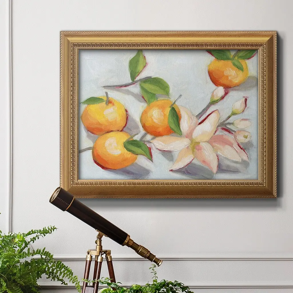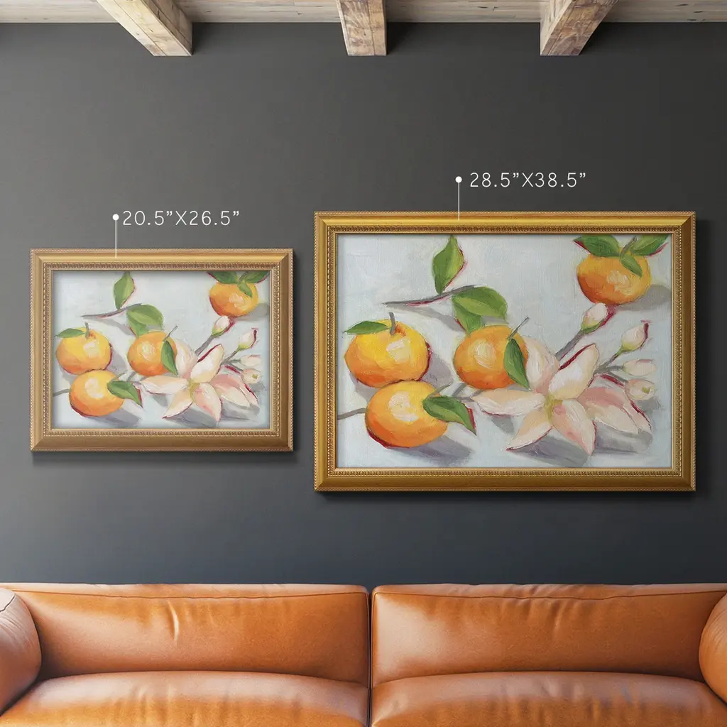 Tangerine Blossoms I Premium Framed Canvas- Ready to Hang A Premium Framed Canvas created to last. Framed in distressed wood and available in an array of sizes and colors Featuring a beveled a solid wood stretcher bar, each piece comes ready to hand 3 SIZES AVAILABLE 16''X20'' - Overall Size 18'X27'' - Overall Size 24''x36'' - Overall Size Each piece is made to order. Each piece comes with hanging hardware. Made in the USA Ready to Hang Giclee Paper Print Acrylic Glass Beveled Matt Board