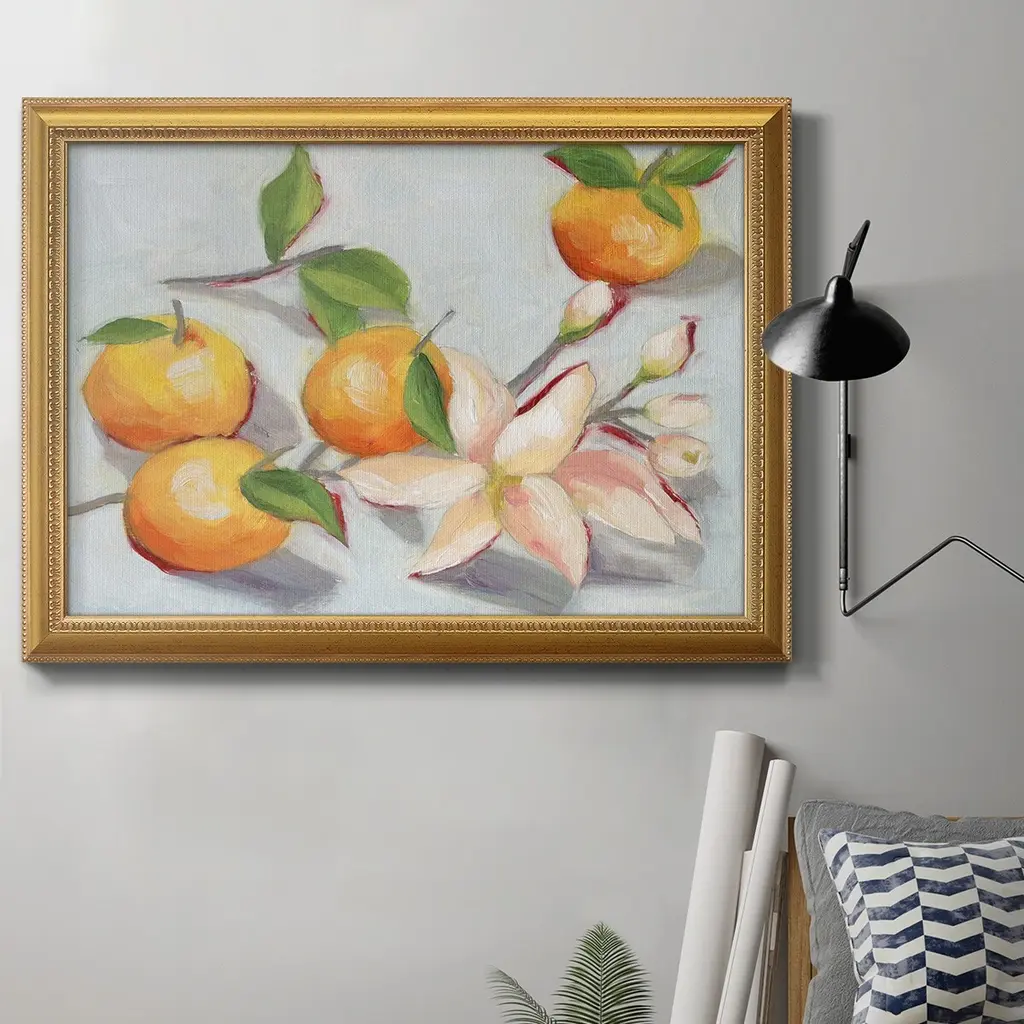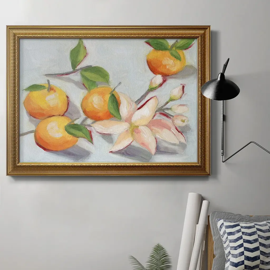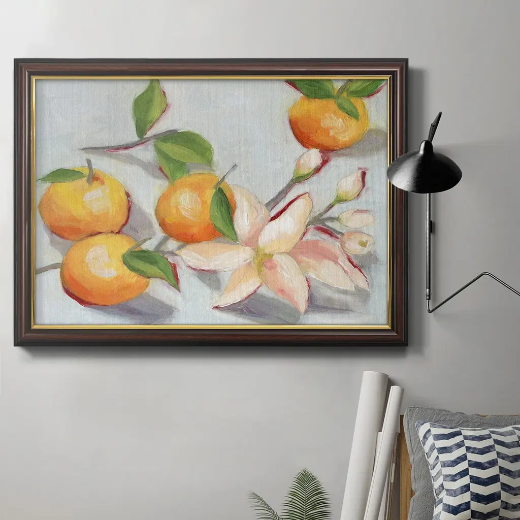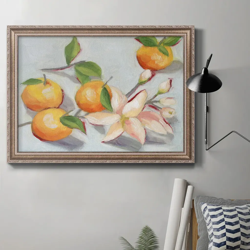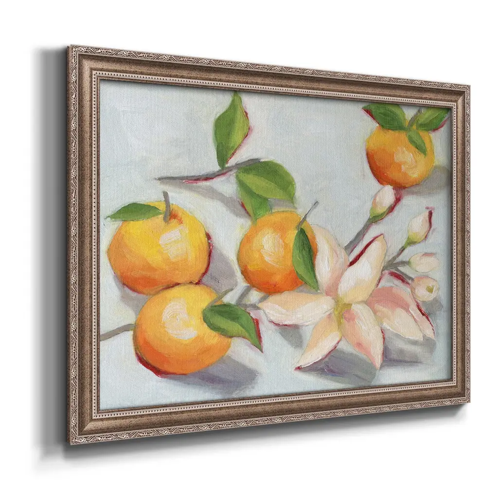 Tangerine Blossoms I Premium Framed Canvas- Ready to Hang A Premium Framed Canvas created to last. Framed in distressed wood and available in an array of sizes and colors Featuring a beveled a solid wood stretcher bar, each piece comes ready to hand 3 SIZES AVAILABLE 16''X20'' - Overall Size 18'X27'' - Overall Size 24''x36'' - Overall Size Each piece is made to order. Each piece comes with hanging hardware. Made in the USA Ready to Hang Giclee Paper Print Acrylic Glass Beveled Matt Board