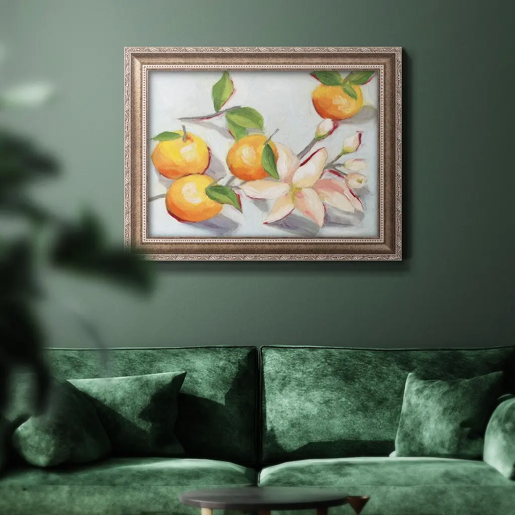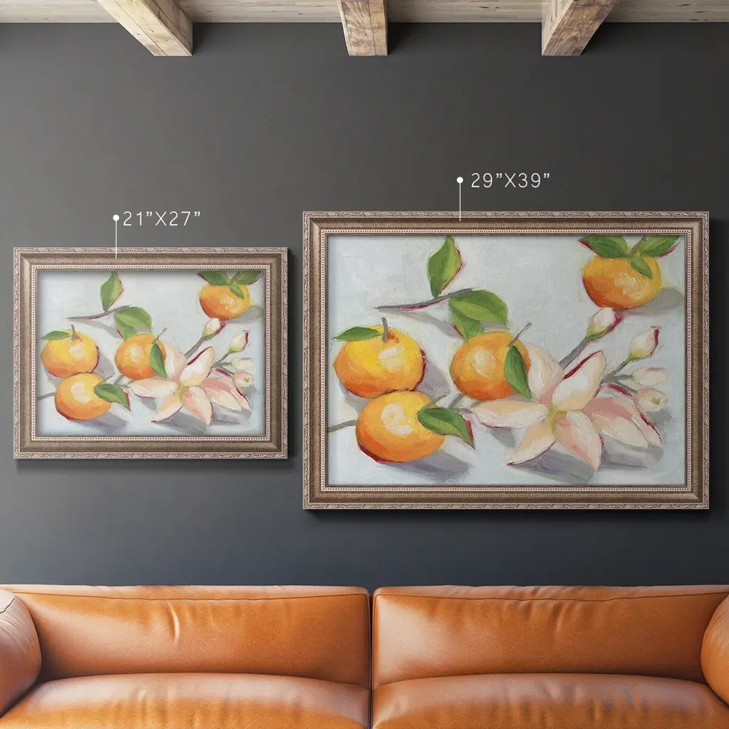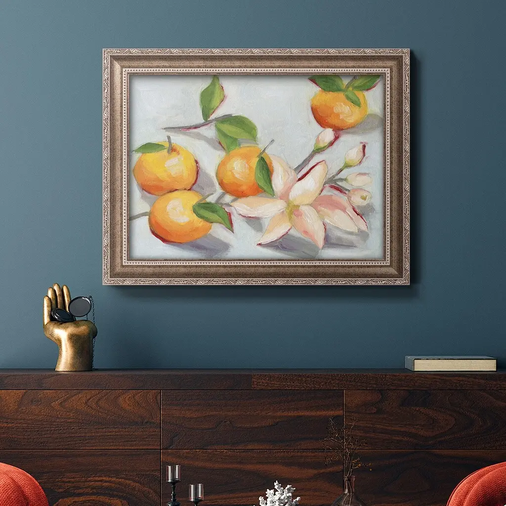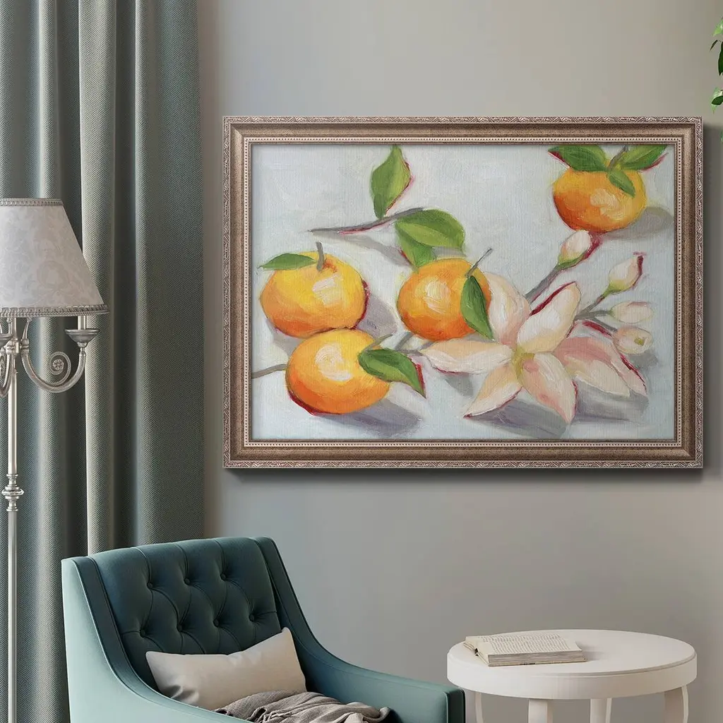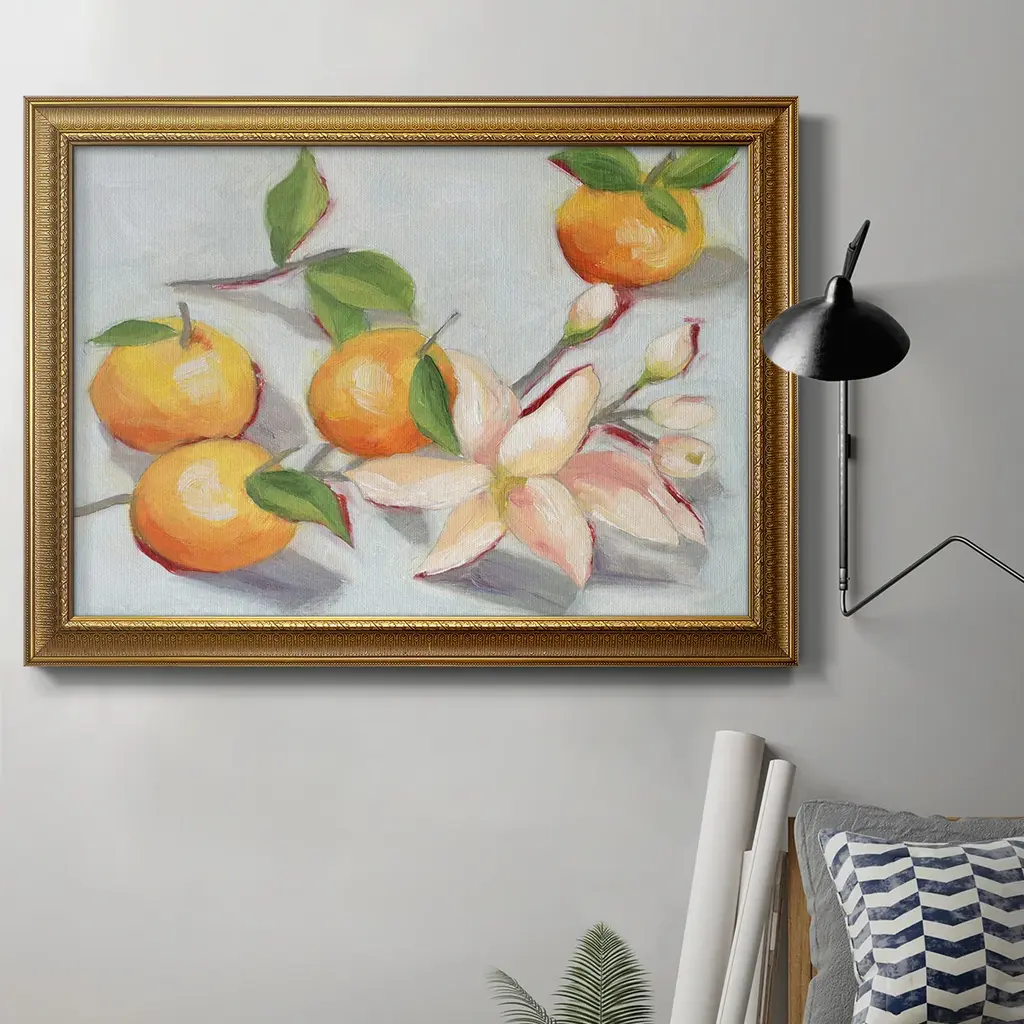 Tangerine Blossoms I Premium Framed Canvas- Ready to Hang A Premium Framed Canvas created to last. Framed in distressed wood and available in an array of sizes and colors Featuring a beveled a solid wood stretcher bar, each piece comes ready to hand 3 SIZES AVAILABLE 16''X20'' - Overall Size 18'X27'' - Overall Size 24''x36'' - Overall Size Each piece is made to order. Each piece comes with hanging hardware. Made in the USA Ready to Hang Giclee Paper Print Acrylic Glass Beveled Matt Board