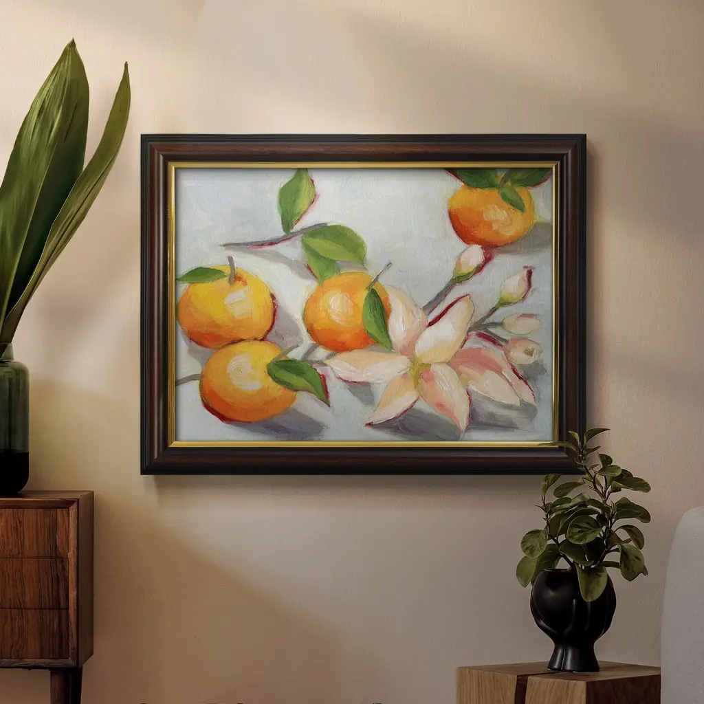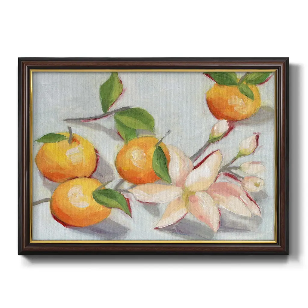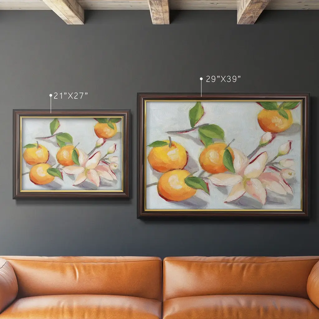 Tangerine Blossoms I Premium Framed Canvas- Ready to Hang A Premium Framed Canvas created to last. Framed in distressed wood and available in an array of sizes and colors Featuring a beveled a solid wood stretcher bar, each piece comes ready to hand 3 SIZES AVAILABLE 16''X20'' - Overall Size 18'X27'' - Overall Size 24''x36'' - Overall Size Each piece is made to order. Each piece comes with hanging hardware. Made in the USA Ready to Hang Giclee Paper Print Acrylic Glass Beveled Matt Board
