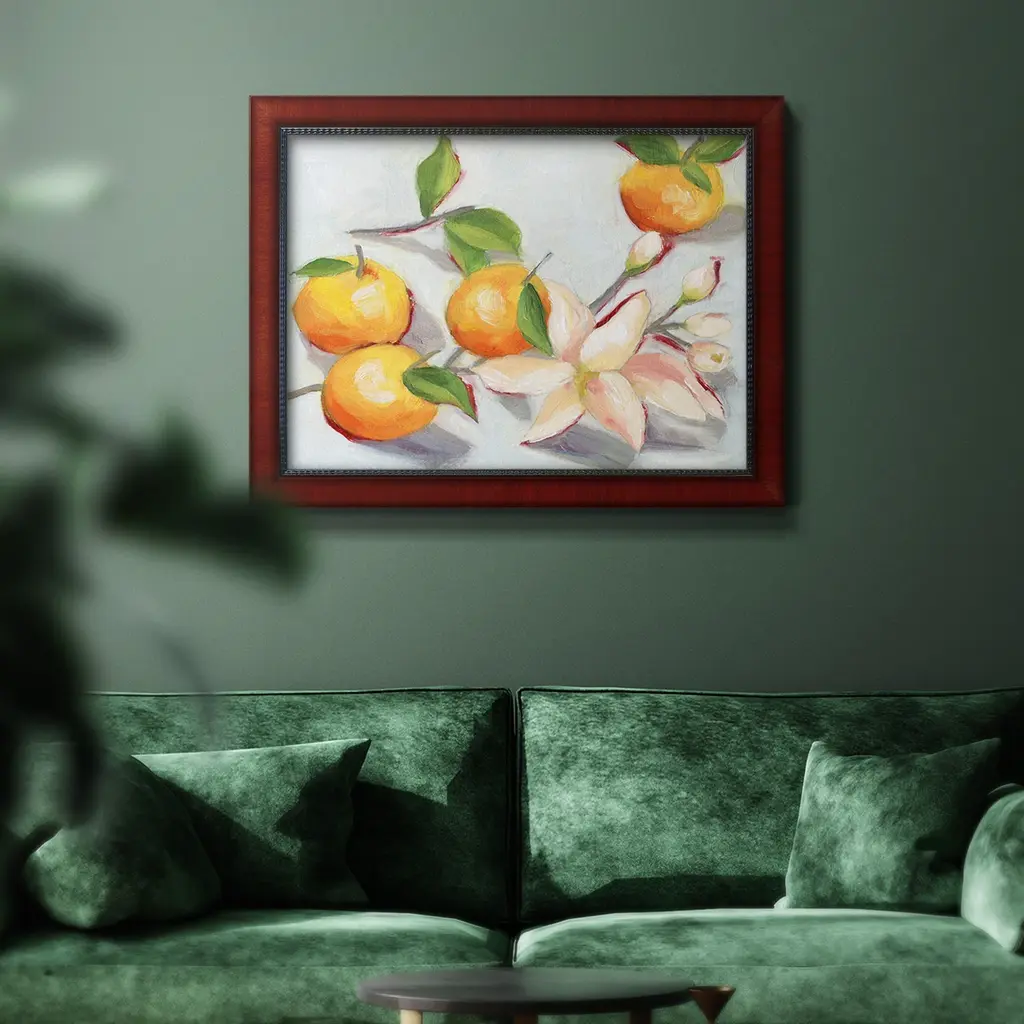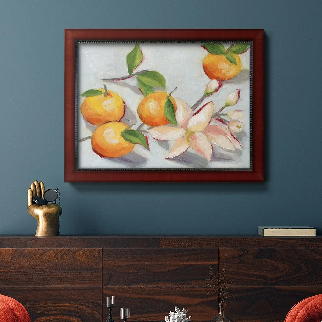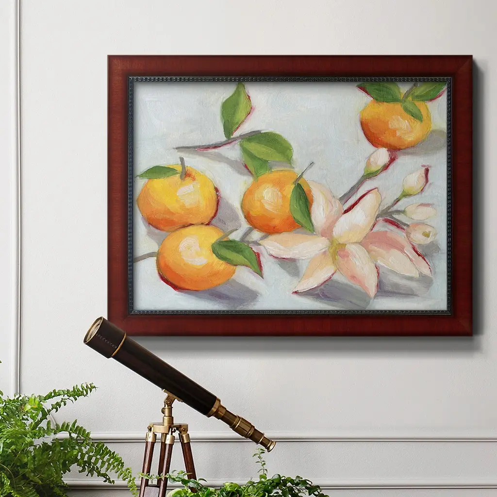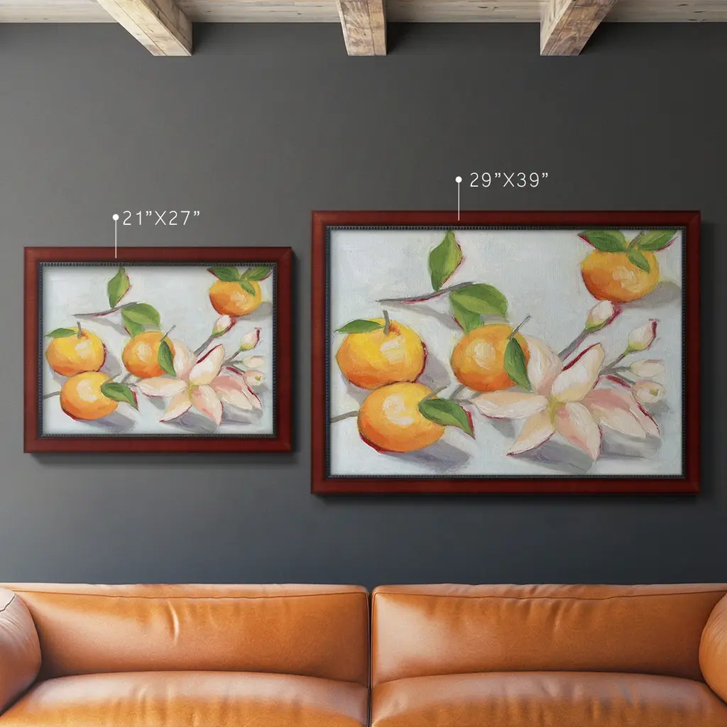 Tangerine Blossoms I Premium Framed Canvas- Ready to Hang A Premium Framed Canvas created to last. Framed in distressed wood and available in an array of sizes and colors Featuring a beveled a solid wood stretcher bar, each piece comes ready to hand 3 SIZES AVAILABLE 16''X20'' - Overall Size 18'X27'' - Overall Size 24''x36'' - Overall Size Each piece is made to order. Each piece comes with hanging hardware. Made in the USA Ready to Hang Giclee Paper Print Acrylic Glass Beveled Matt Board