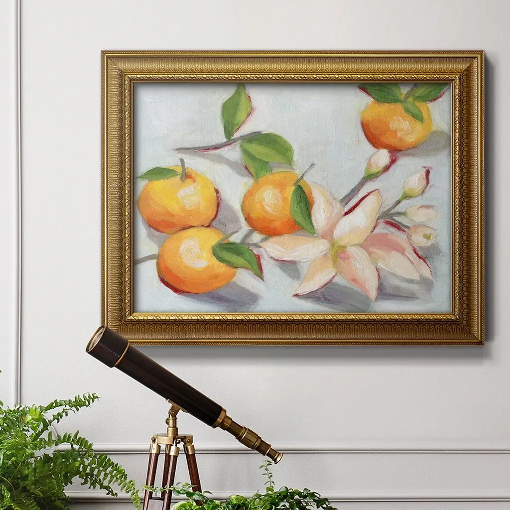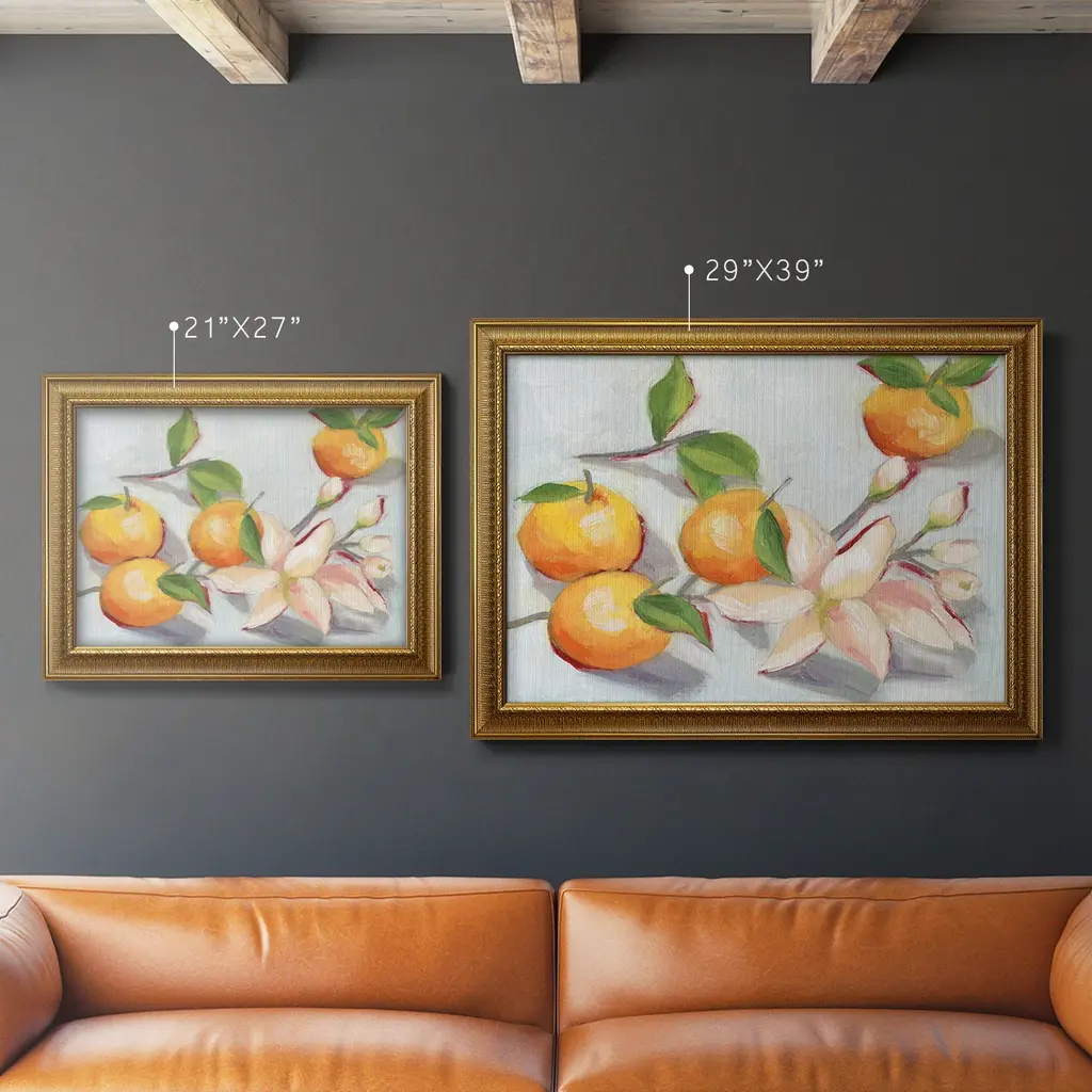 Tangerine Blossoms I Premium Framed Canvas- Ready to Hang A Premium Framed Canvas created to last. Framed in distressed wood and available in an array of sizes and colors Featuring a beveled a solid wood stretcher bar, each piece comes ready to hand 3 SIZES AVAILABLE 16''X20'' - Overall Size 18'X27'' - Overall Size 24''x36'' - Overall Size Each piece is made to order. Each piece comes with hanging hardware. Made in the USA Ready to Hang Giclee Paper Print Acrylic Glass Beveled Matt Board