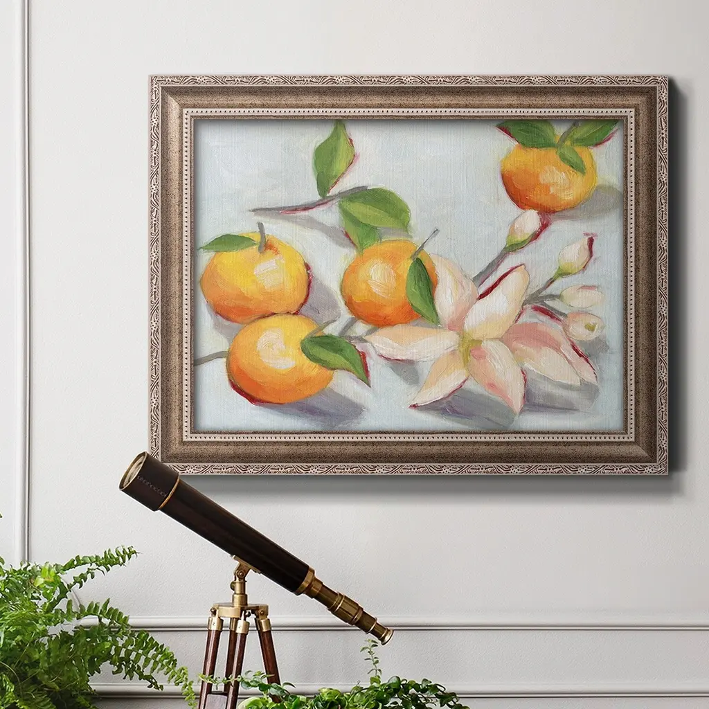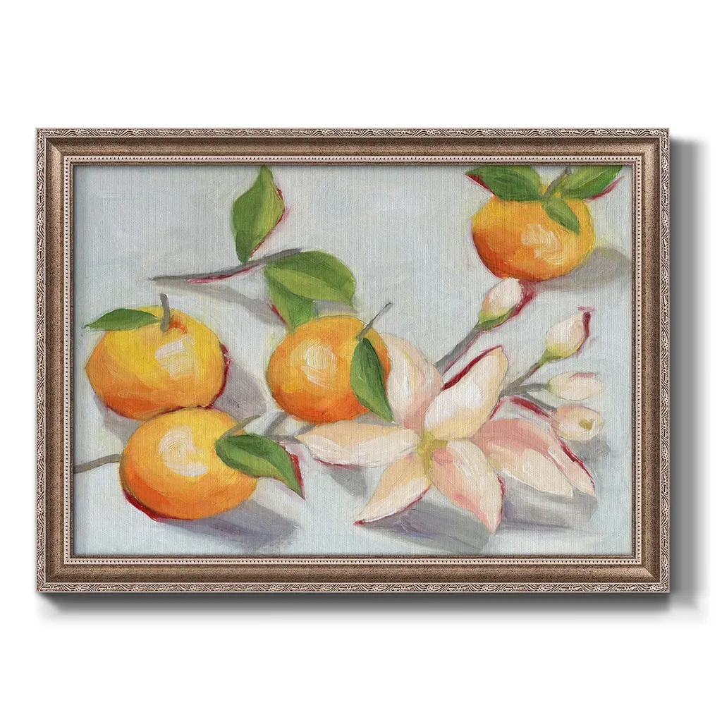 Tangerine Blossoms I Premium Framed Canvas- Ready to Hang A Premium Framed Canvas created to last. Framed in distressed wood and available in an array of sizes and colors Featuring a beveled a solid wood stretcher bar, each piece comes ready to hand 3 SIZES AVAILABLE 16''X20'' - Overall Size 18'X27'' - Overall Size 24''x36'' - Overall Size Each piece is made to order. Each piece comes with hanging hardware. Made in the USA Ready to Hang Giclee Paper Print Acrylic Glass Beveled Matt Board