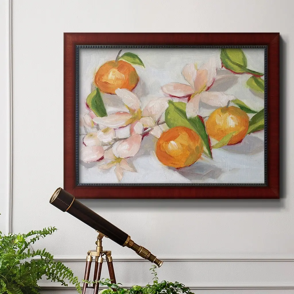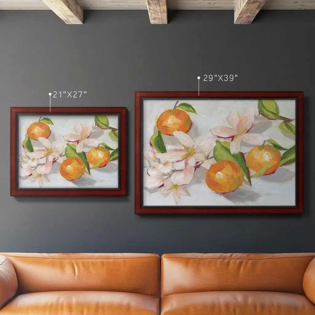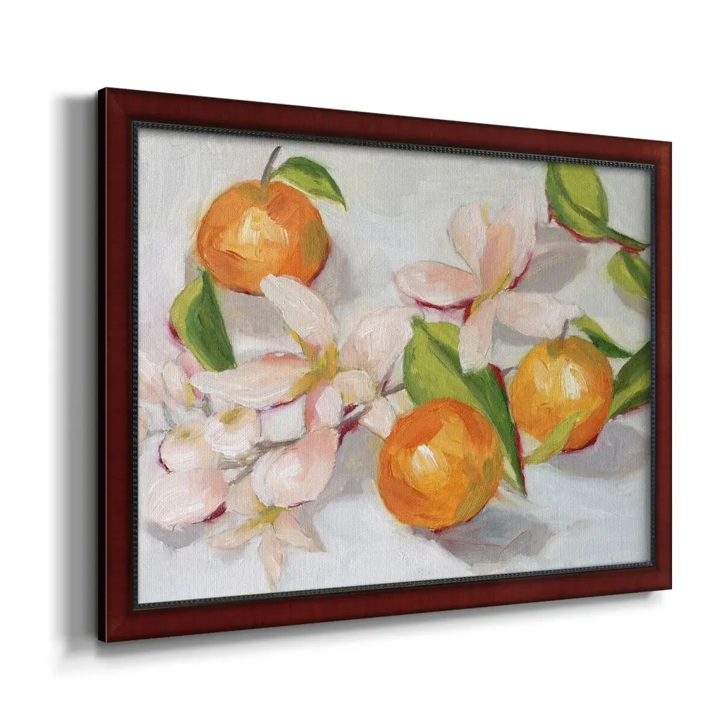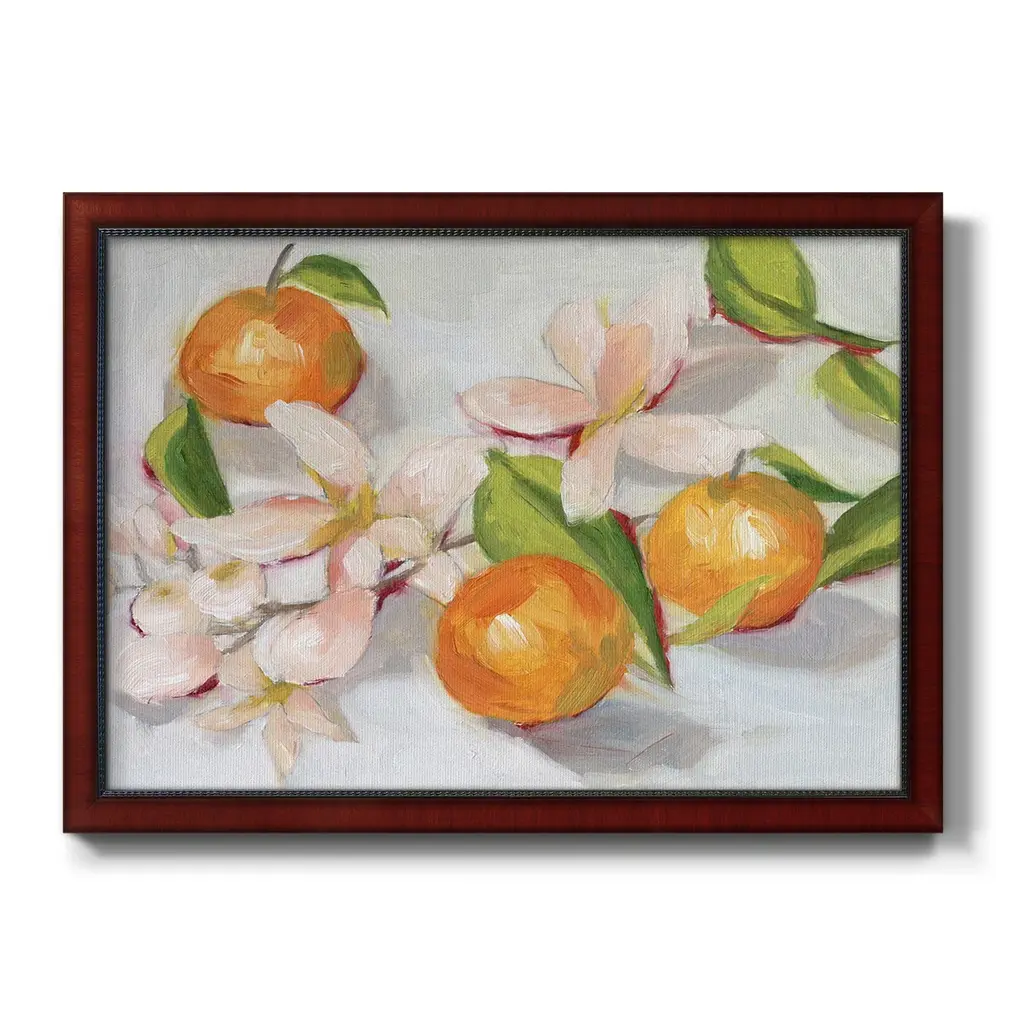 Tangerine Blossoms II Premium Framed Canvas- Ready to Hang A Premium Framed Canvas created to last. Framed in distressed wood and available in an array of sizes and colors Featuring a beveled a solid wood stretcher bar, each piece comes ready to hand 3 SIZES AVAILABLE 16''X20'' - Overall Size 18'X27'' - Overall Size 24''x36'' - Overall Size Each piece is made to order. Each piece comes with hanging hardware. Made in the USA Ready to Hang Giclee Paper Print Acrylic Glass Beveled Matt Board
