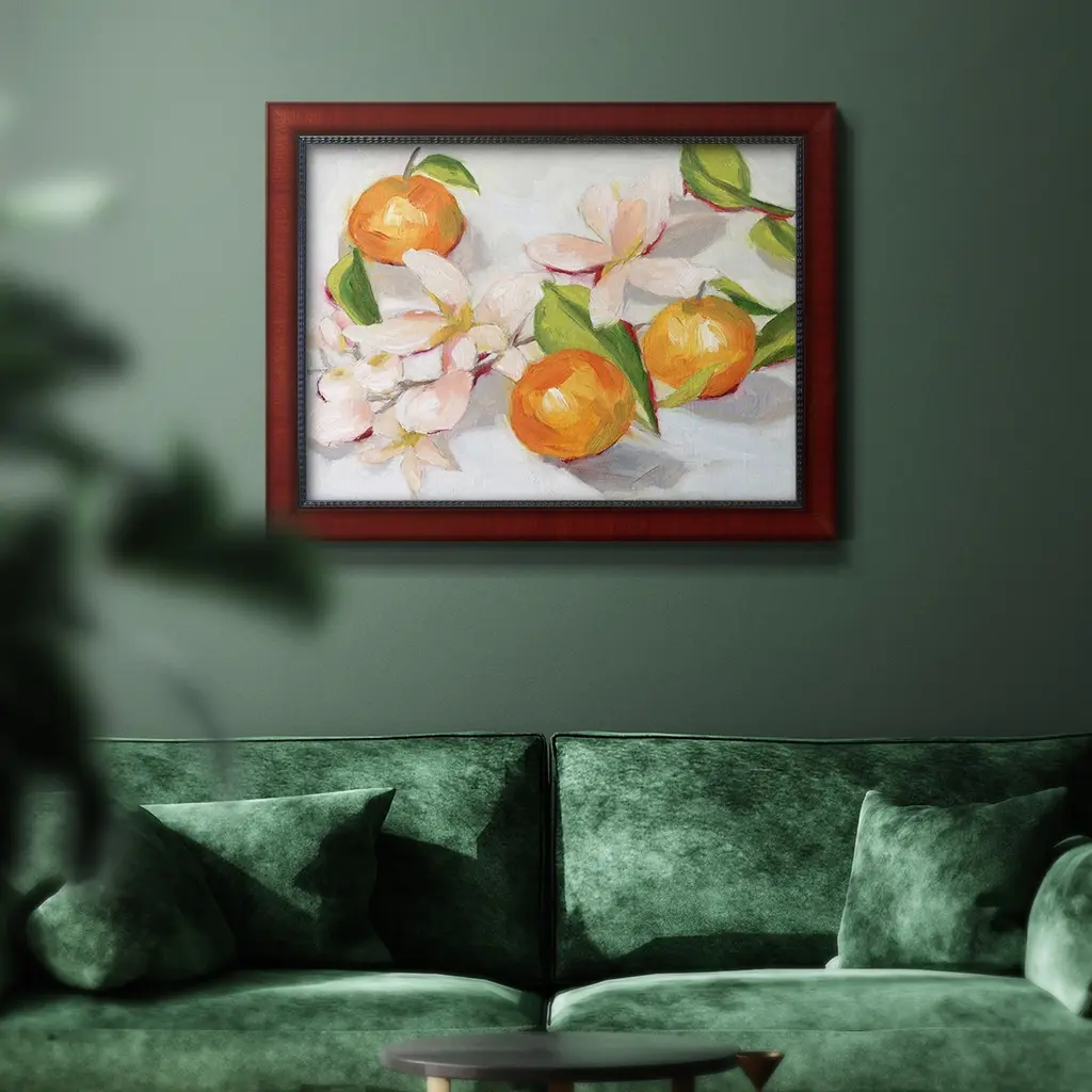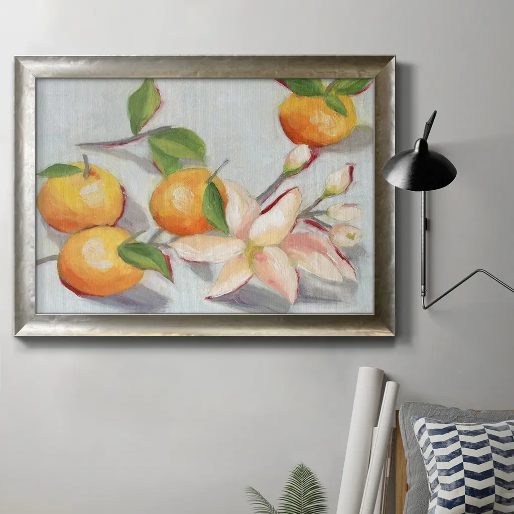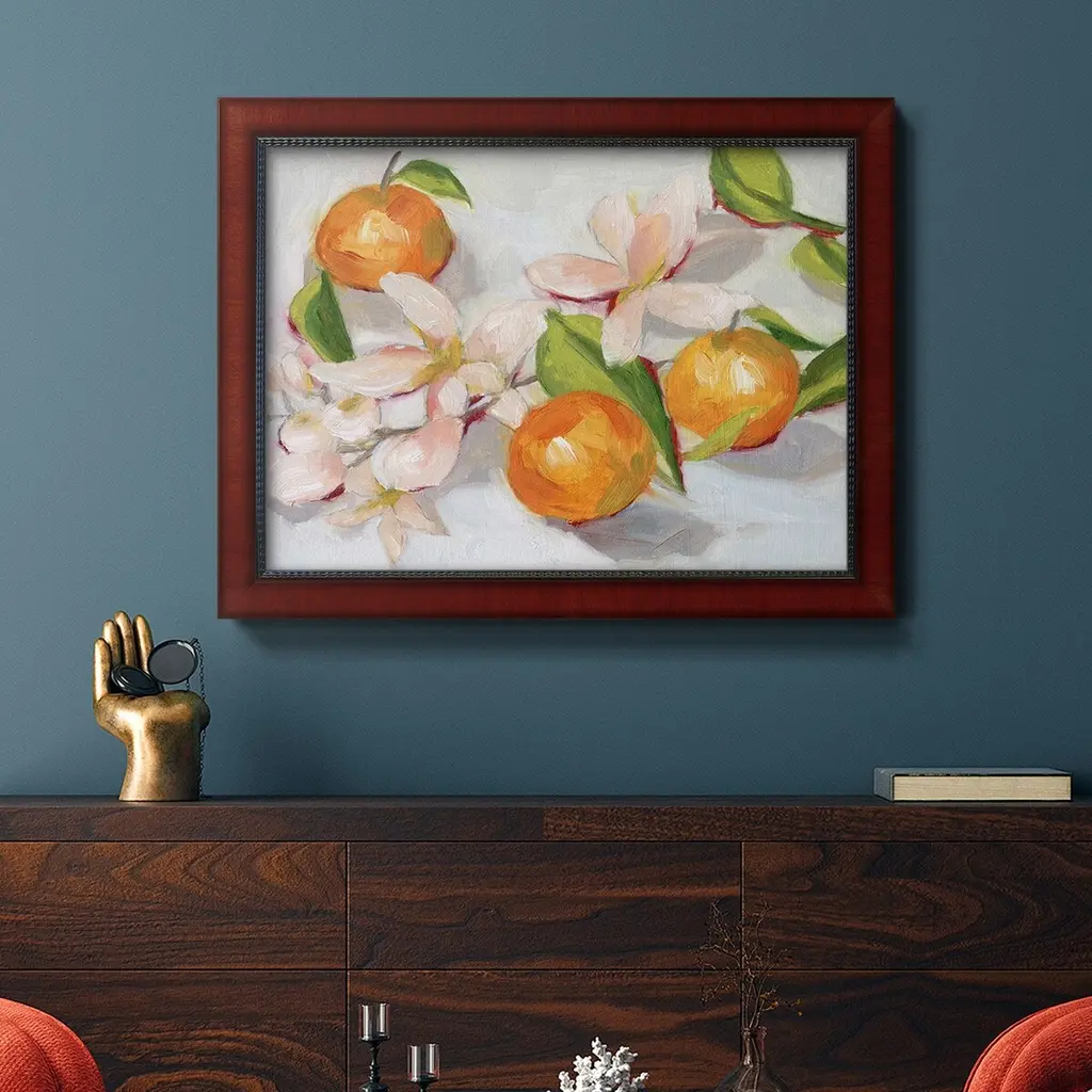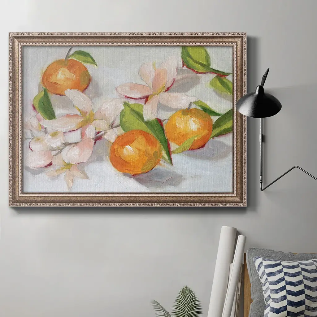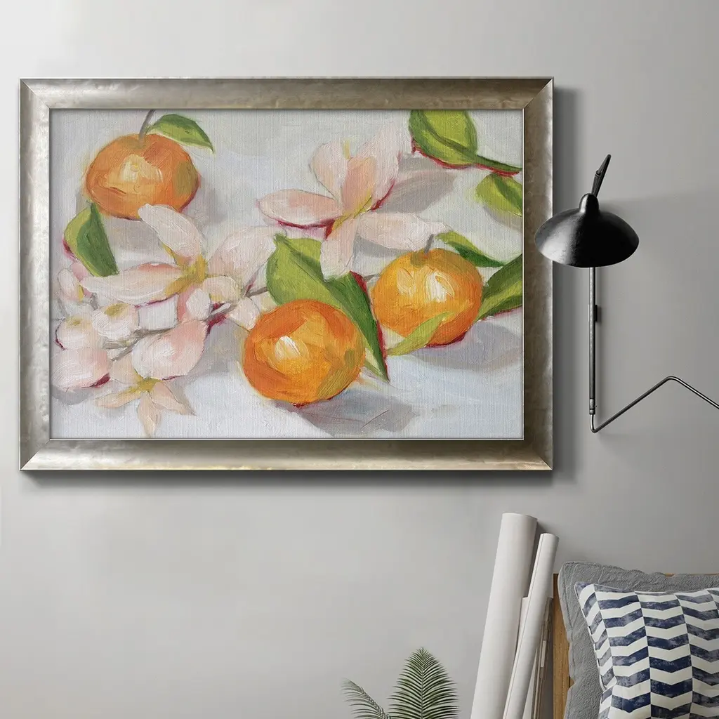 Tangerine Blossoms II Premium Framed Canvas- Ready to Hang A Premium Framed Canvas created to last. Framed in distressed wood and available in an array of sizes and colors Featuring a beveled a solid wood stretcher bar, each piece comes ready to hand 3 SIZES AVAILABLE 16''X20'' - Overall Size 18'X27'' - Overall Size 24''x36'' - Overall Size Each piece is made to order. Each piece comes with hanging hardware. Made in the USA Ready to Hang Giclee Paper Print Acrylic Glass Beveled Matt Board