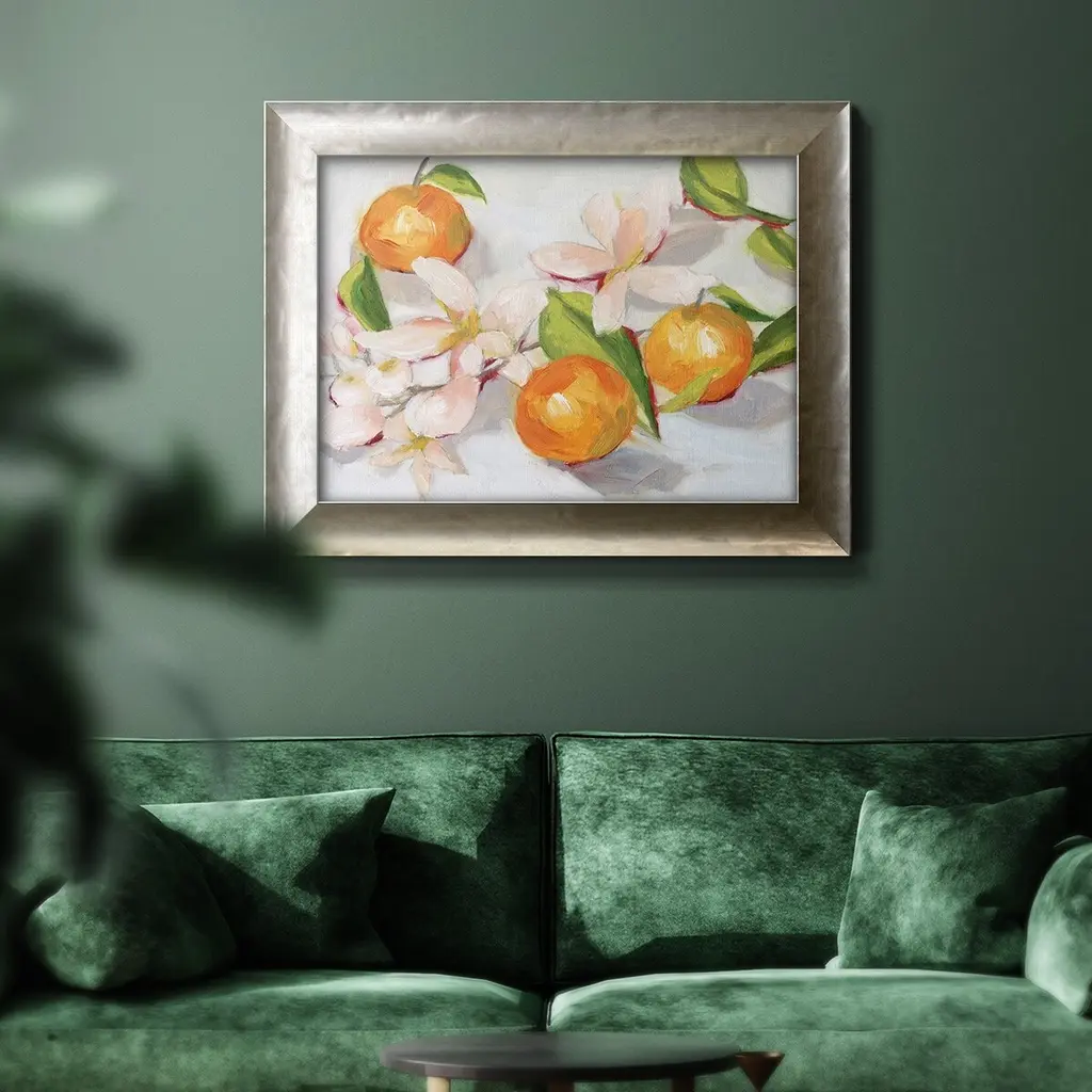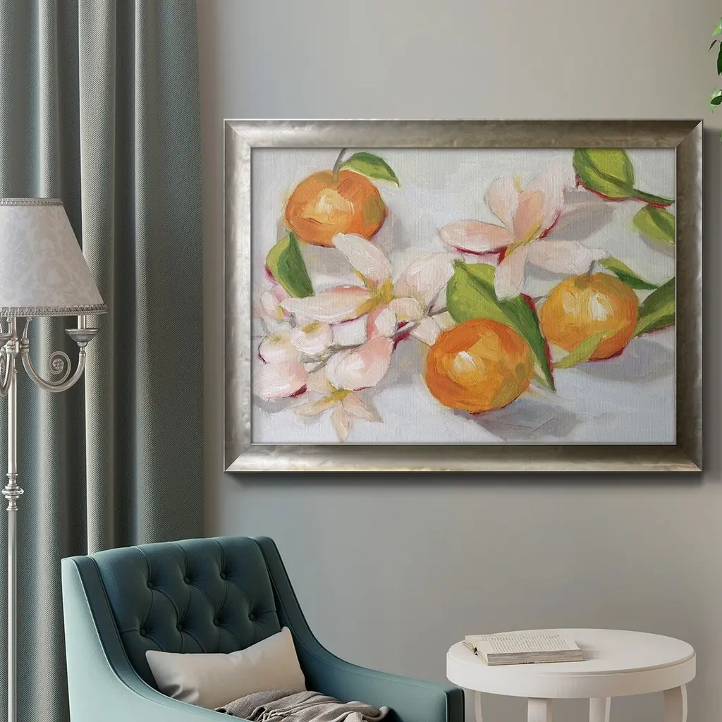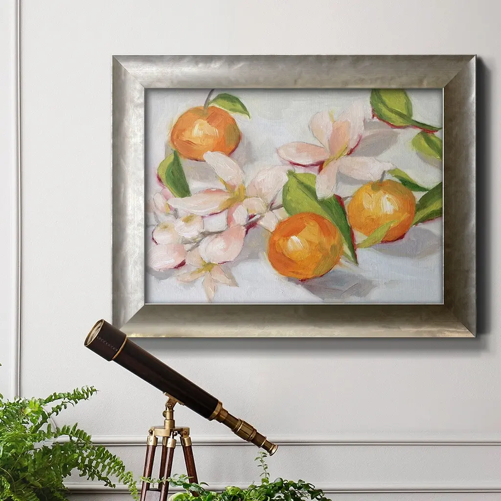 Tangerine Blossoms II Premium Framed Canvas- Ready to Hang A Premium Framed Canvas created to last. Framed in distressed wood and available in an array of sizes and colors Featuring a beveled a solid wood stretcher bar, each piece comes ready to hand 3 SIZES AVAILABLE 16''X20'' - Overall Size 18'X27'' - Overall Size 24''x36'' - Overall Size Each piece is made to order. Each piece comes with hanging hardware. Made in the USA Ready to Hang Giclee Paper Print Acrylic Glass Beveled Matt Board