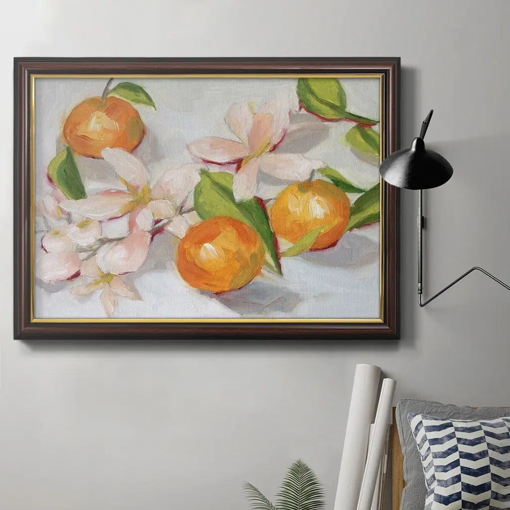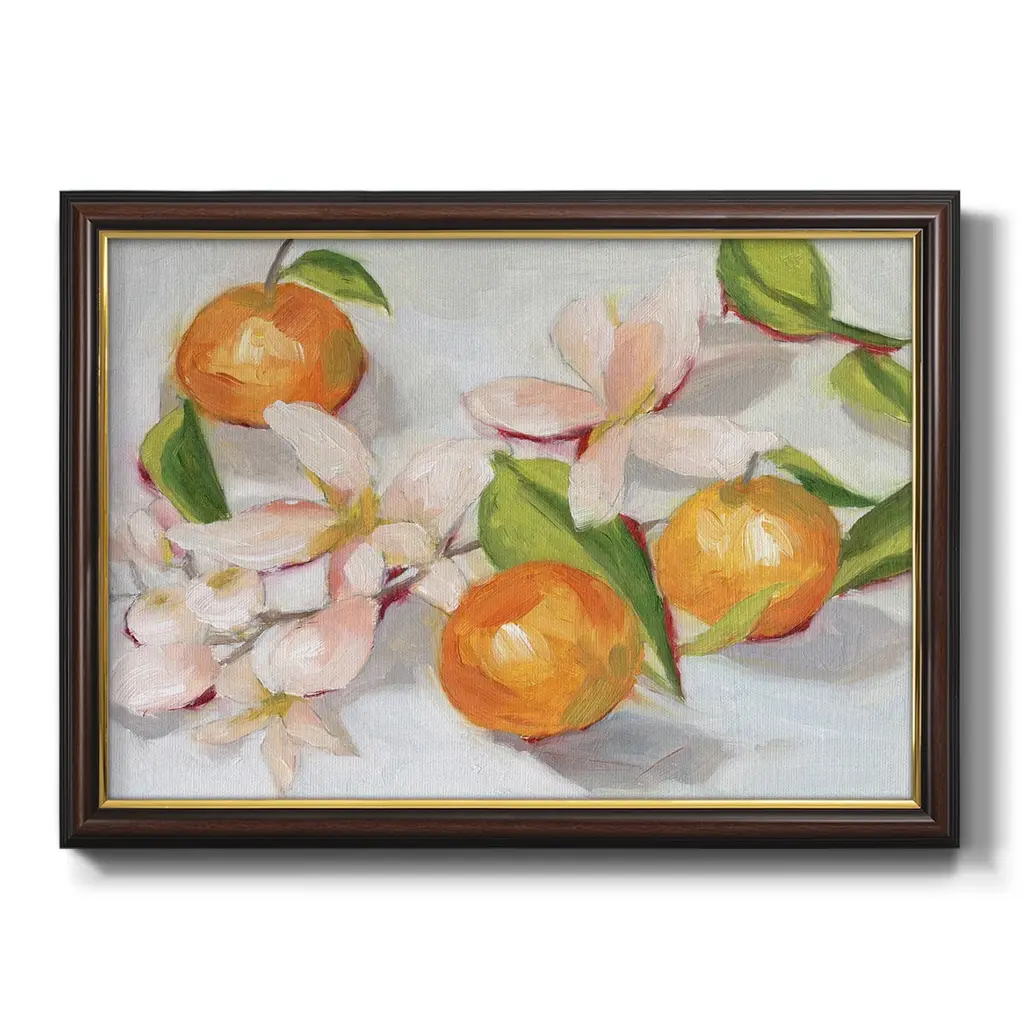 Tangerine Blossoms II Premium Framed Canvas- Ready to Hang A Premium Framed Canvas created to last. Framed in distressed wood and available in an array of sizes and colors Featuring a beveled a solid wood stretcher bar, each piece comes ready to hand 3 SIZES AVAILABLE 16''X20'' - Overall Size 18'X27'' - Overall Size 24''x36'' - Overall Size Each piece is made to order. Each piece comes with hanging hardware. Made in the USA Ready to Hang Giclee Paper Print Acrylic Glass Beveled Matt Board