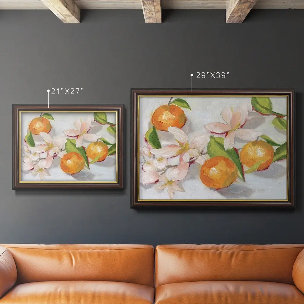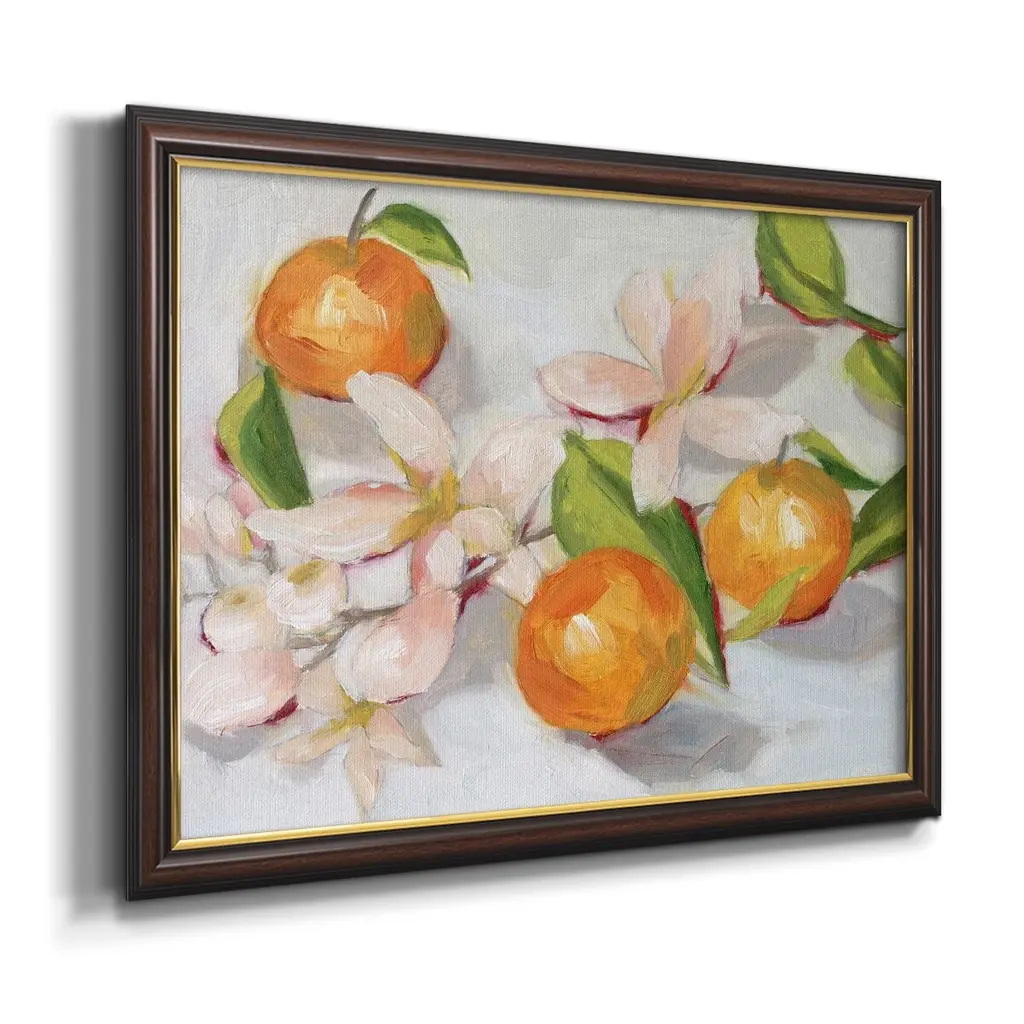 Tangerine Blossoms II Premium Framed Canvas- Ready to Hang A Premium Framed Canvas created to last. Framed in distressed wood and available in an array of sizes and colors Featuring a beveled a solid wood stretcher bar, each piece comes ready to hand 3 SIZES AVAILABLE 16''X20'' - Overall Size 18'X27'' - Overall Size 24''x36'' - Overall Size Each piece is made to order. Each piece comes with hanging hardware. Made in the USA Ready to Hang Giclee Paper Print Acrylic Glass Beveled Matt Board