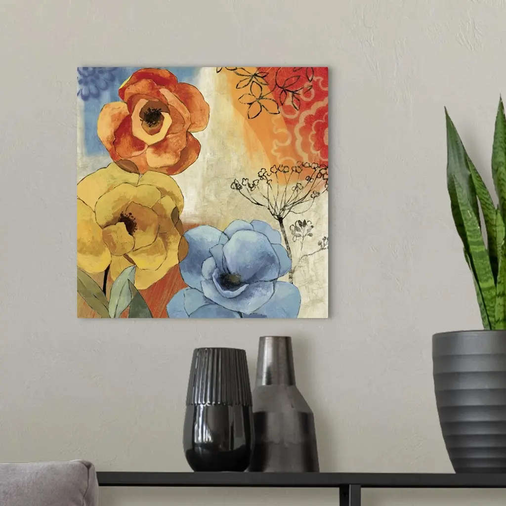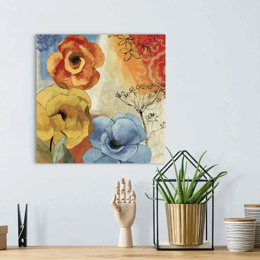 Contemporary home decor artwork of colorful flowers against a multi-colored background.