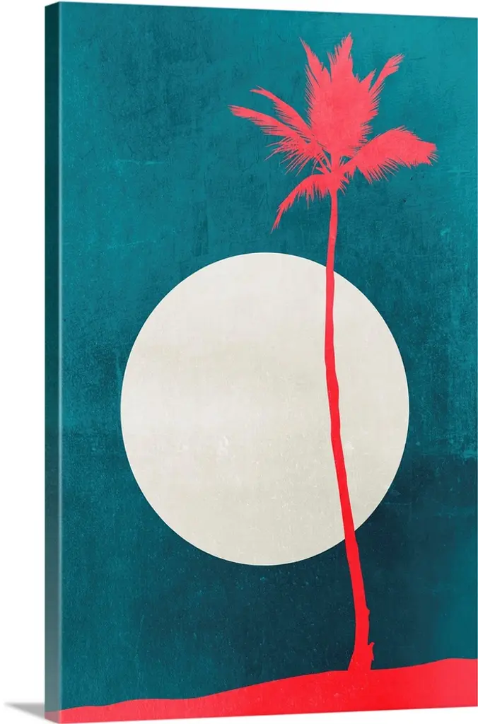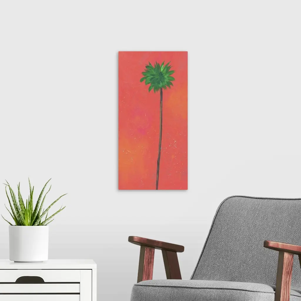 Contemporary artwork of a tall palm tree with a thin trunk against a red background.
