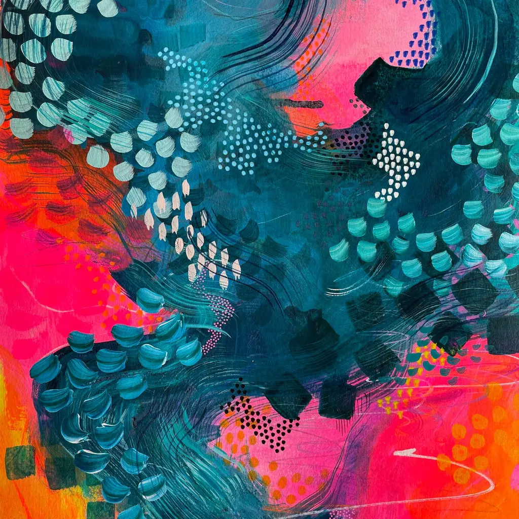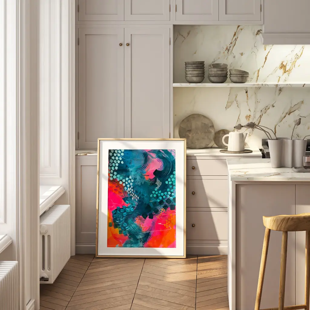 This vibrant contemporary abstract print features vibrant hues of blues, cobalts, teals and tangerine oranges to create a joyful and uplifting piece of art for any interior. Inspired by hot summer sunsets over the glistening Aegean Sea, this piece will instantly transport you to dining on a Greek beach at the water's edge, drenched in sunshine. Originally painted using acrylic paint, inks, oil pastels and pencil, this luxurious-quality fine art print beautifully captures every brushstroke and hand-crafted mark. Printed on heavyweight 316gsm cotton rag textured paper using archival-quality inks, this A3 giclée print will maintain its beautiful vibrancy for many years to come. Each print has a white border so it can easily fit into a standard-size frame. Print is sold unframed.
