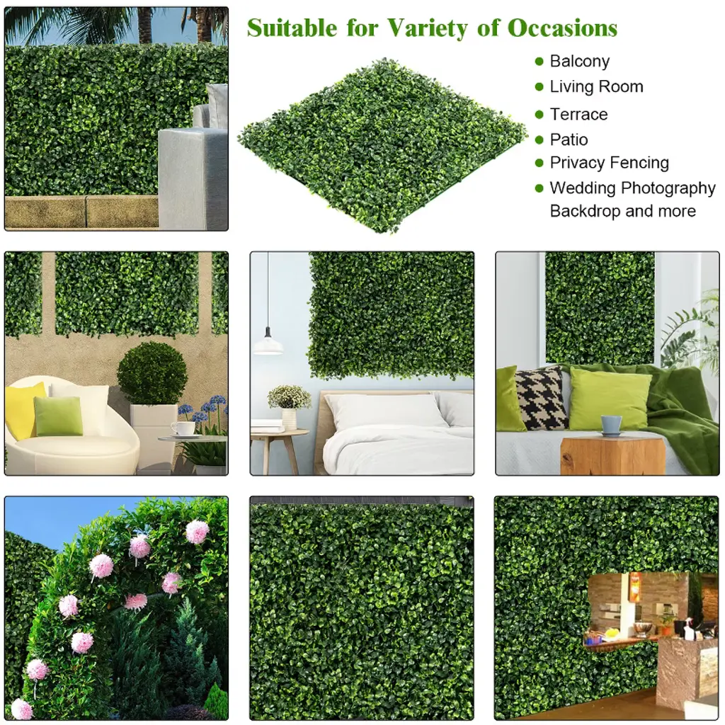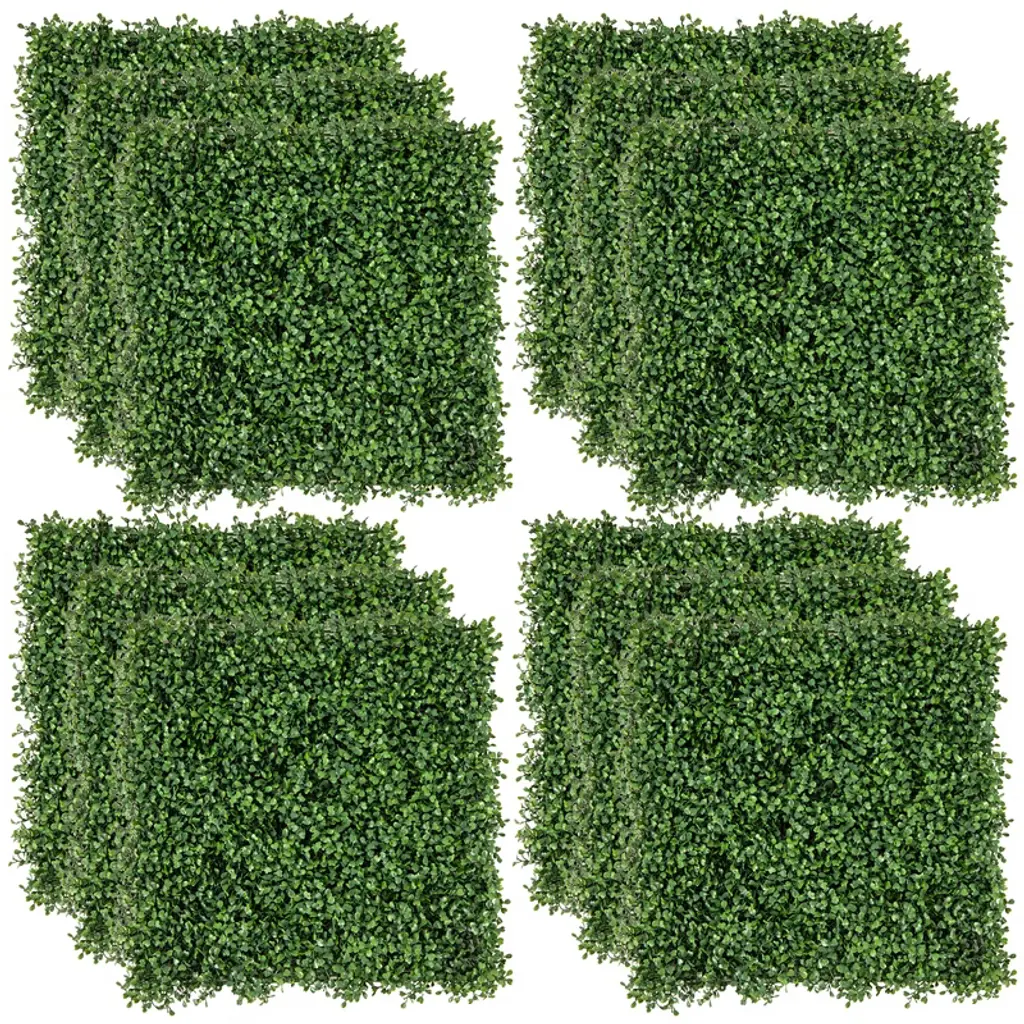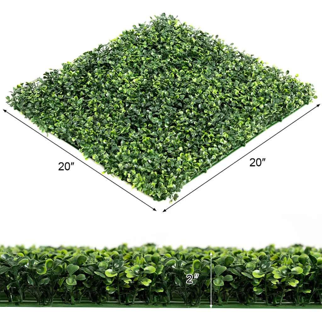 Our long-lasting and environment-friendly artificial boxwood wall panel is made of premium new PE material, which can be used for long time without withering or fading. There are 12 panels in all and each of which is 20" x 20" in size. They can provide you with 33 square feet of cover area in total. Also the artificial screen can act as a shelter for privacy. Because of the natural and grassy appearance, our wall panel is a perfect decoration to be used for beautifying and renovating your backyard fences, yards, gardens, courtyards, walkways and indoor rooms. This panel will provide you with a natural feeling!FeaturesPremium new PE material for durability SGS certified materials are absolutely safe Natural appearance can match perfectly with patio Perfect for backyard, gardens, walkways and indoor rooms Lightweight panels to provide comfortable using experience Easy to assemble and use Specifications: Color: Green Main material: New PE Net Weight: 15.4 lbs per box Overall Dimension: 20'' x 20'' (L x W) Thickness of each panel: 1.6'' Package includes: 12 X Artificial Boxwood Wall Panel 1 X Instruction