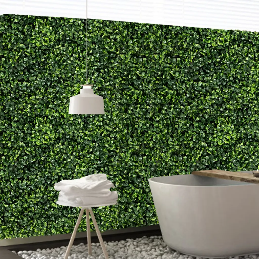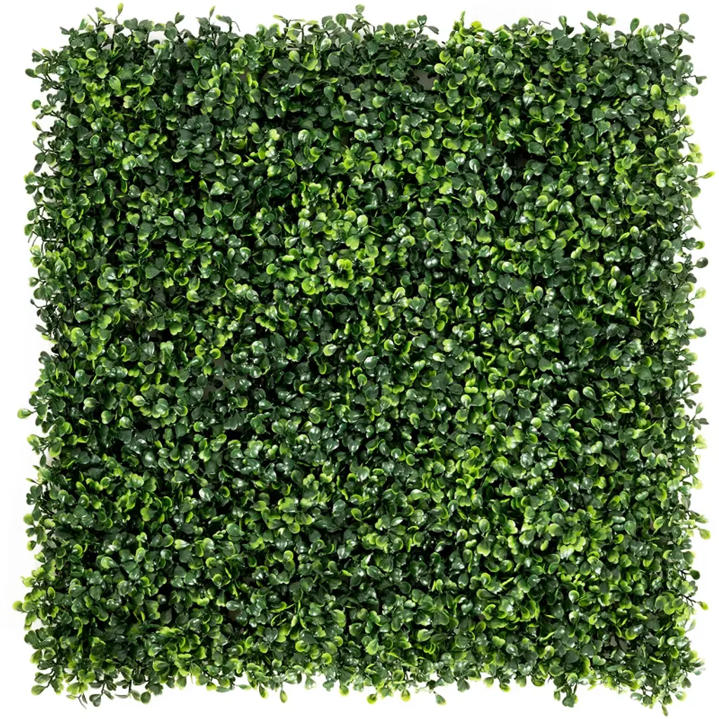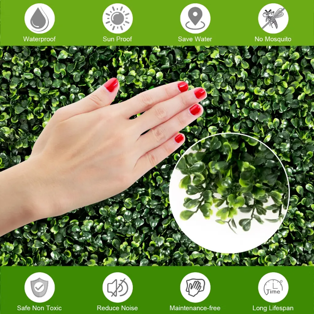 Our long-lasting and environment-friendly artificial boxwood wall panel is made of premium new PE material, which can be used for long time without withering or fading. There are 12 panels in all and each of which is 20" x 20" in size. They can provide you with 33 square feet of cover area in total. Also the artificial screen can act as a shelter for privacy. Because of the natural and grassy appearance, our wall panel is a perfect decoration to be used for beautifying and renovating your backyard fences, yards, gardens, courtyards, walkways and indoor rooms. This panel will provide you with a natural feeling!FeaturesPremium new PE material for durability SGS certified materials are absolutely safe Natural appearance can match perfectly with patio Perfect for backyard, gardens, walkways and indoor rooms Lightweight panels to provide comfortable using experience Easy to assemble and use Specifications: Color: Green Main material: New PE Net Weight: 15.4 lbs per box Overall Dimension: 20'' x 20'' (L x W) Thickness of each panel: 1.6'' Package includes: 12 X Artificial Boxwood Wall Panel 1 X Instruction