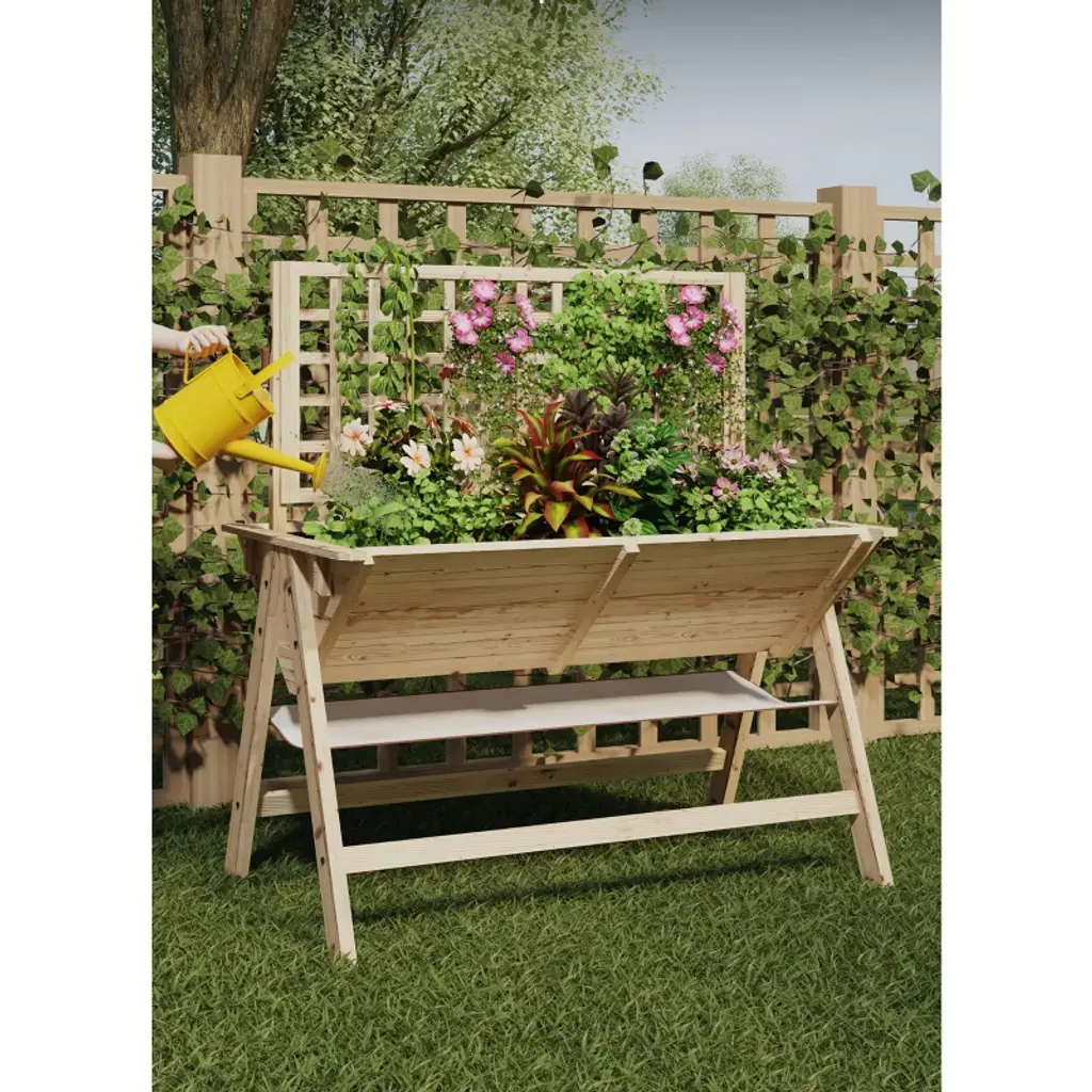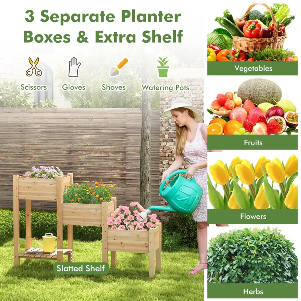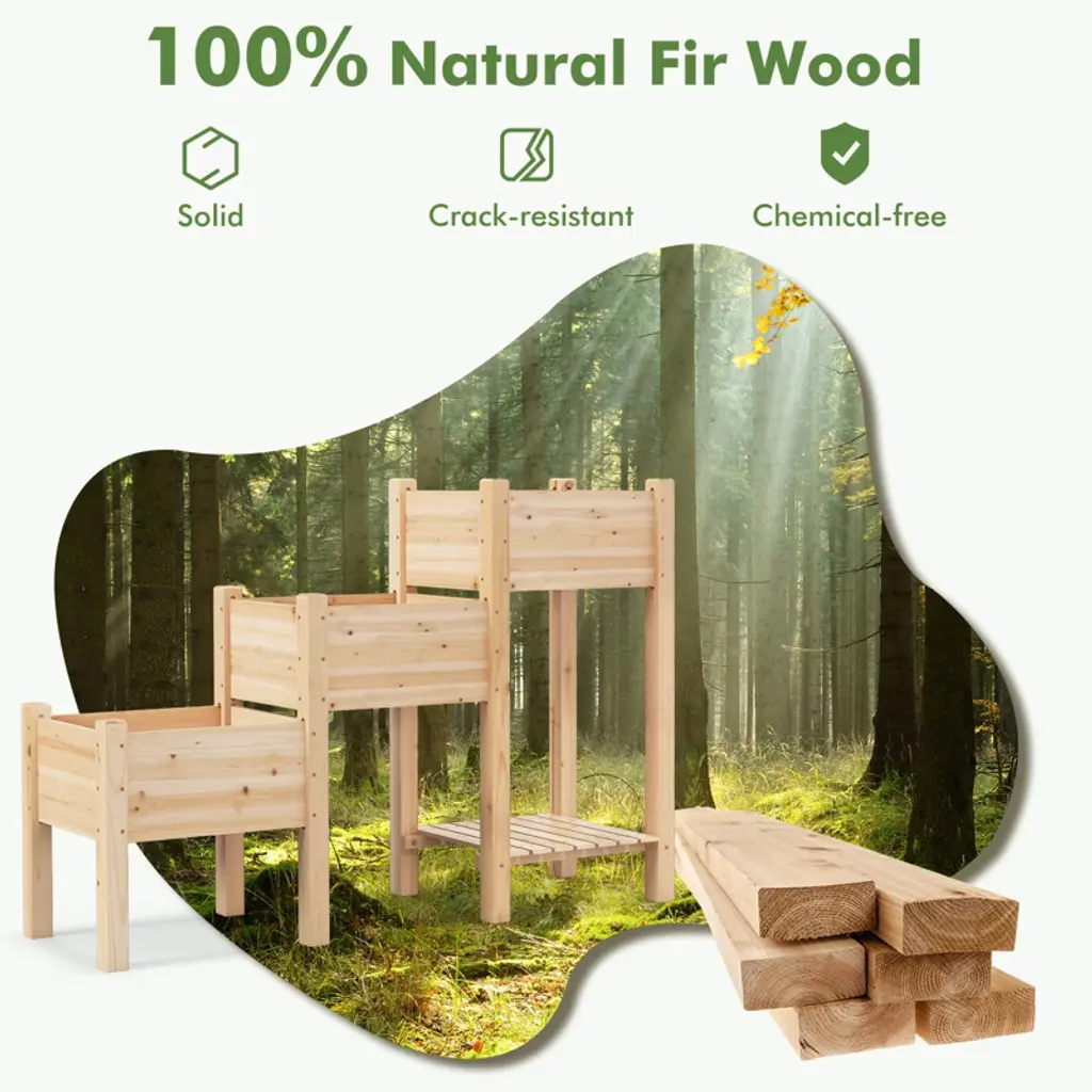 Experience the joys of nurturing with our remarkable 3-tier raised garden bed! Equipped with 3 separate planter boxes & extra shelf, the freestanding plant container will meet your growing and gardening needs! Furthermore, the wood garden planter features ergonomic height & excellent drainage. The wood planter with legs serves as a protective shield against the intrusion of small animals, while providing convenient access for watering, which is friendly for those with backache problems. The drainage holes can facilitate efficient drainage and allow plants to breathe freely. Crafted from high-quality fir wood, our elevated planter box guarantees unparalleled durability and resistance to cracking. With a surface free from painting, the elevated garden bed presents you with the unique opportunity to customize its appearance to reflect your style and add a pop of color to your space. Thanks to the 3-tier vertical design, the indoor outdoor elevated planter is a economical choice for limited spaces.Features100% natural fir wood is solid, chemical-free and not easy to crack3 planter boxes offer separate spaces for vegetables, fruits, flowers to thriveAdditional slatted shelf keeps your scissors, watering pot and shove in placeEach planter features 2 drainage holes to promote excessive water to drain outErgonomic height can avoid painful waists and prevent the damage of wild animalsInnovative tenon structure simplifies assemblySpace-saving design perfectly fits for backyard, garden, deckSpecifications: Color: Natural Material: Fir Wood Overall Dimensions: 64” x 17” x 41” (W x D x H) Height of Each Planter Box: 21”, 31”, 41” Interior Size of Each Planter Box: 20” x 15” x 7.5” (W x D x H) Size of the Bottom Shelf: 18” x 17” (W x D) Each Layer Weight Capacity: 66 lbs Net Weight: 36 lbs Package Includes: 1 x 3-Tier Raised Garden Bed 1 x User’s Manual