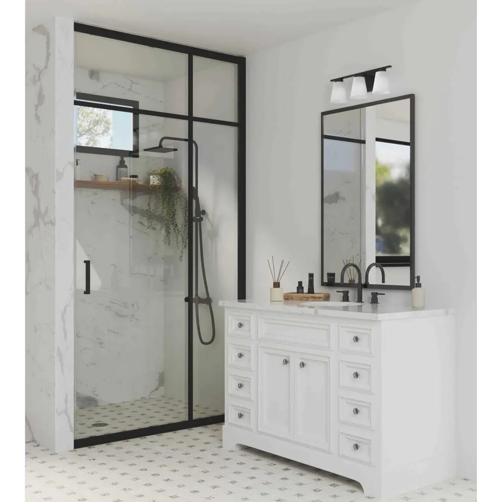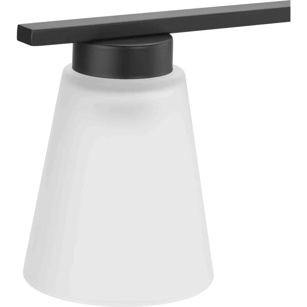 Fill your house with the lively Tanner family of fixtures. Strong lines accent the Matte Black frame in a simple balance of form and function, while soft etched glass shades complement the design.The versatile fixture can be mounted with the shades facing up or down to suit your preference.