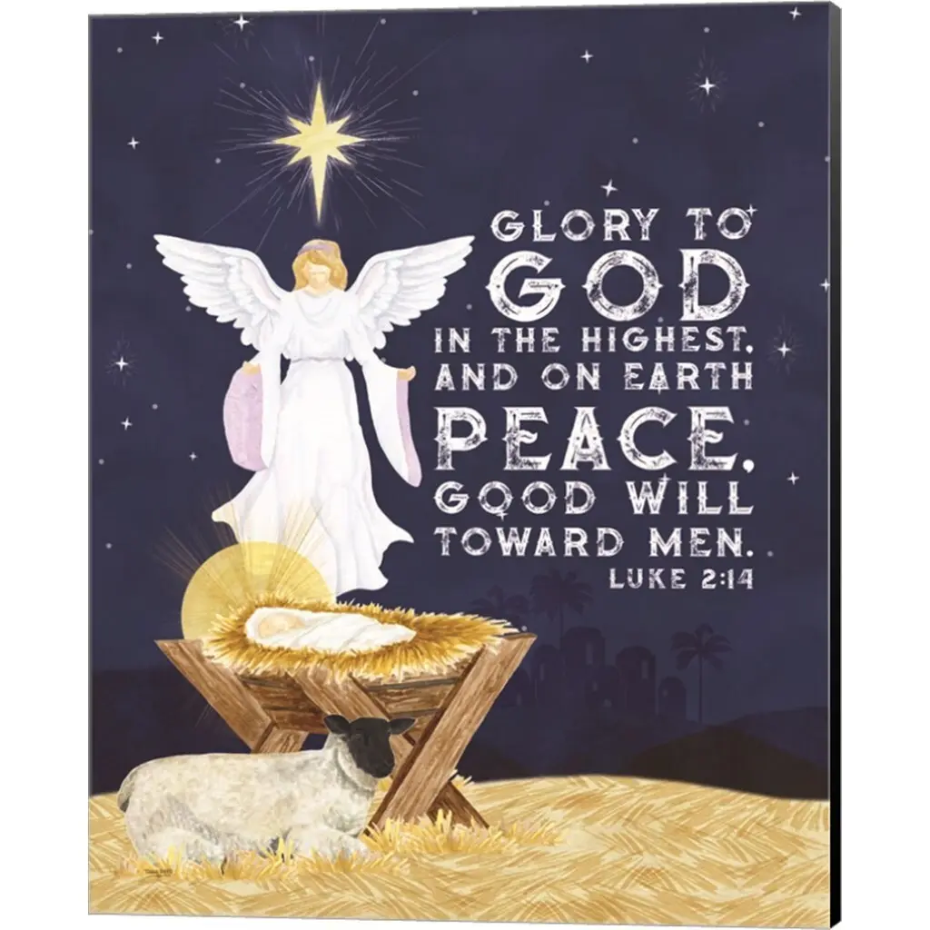 Come Let Us Adore Him Portrait V-Glory to God by Tara Reed is a high quality piece of canvas artwork. The finished size of this piece is 16" X 20", and it has a depth 0.75" with black painted sides. There is a UV protective coating over the entire image, and it is ready to hang on your wall with a Standard Drywall Screw (not included). 100% Satisfaction Guaranteed.