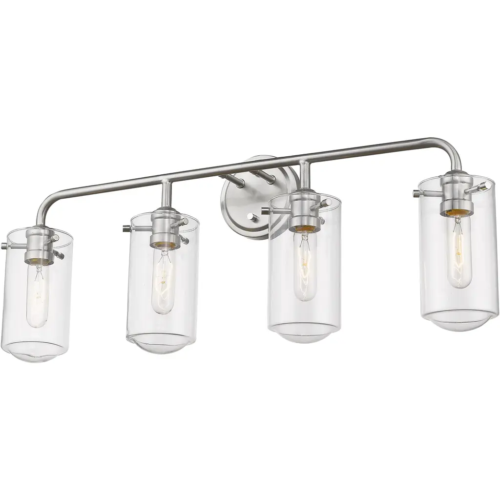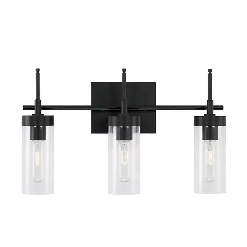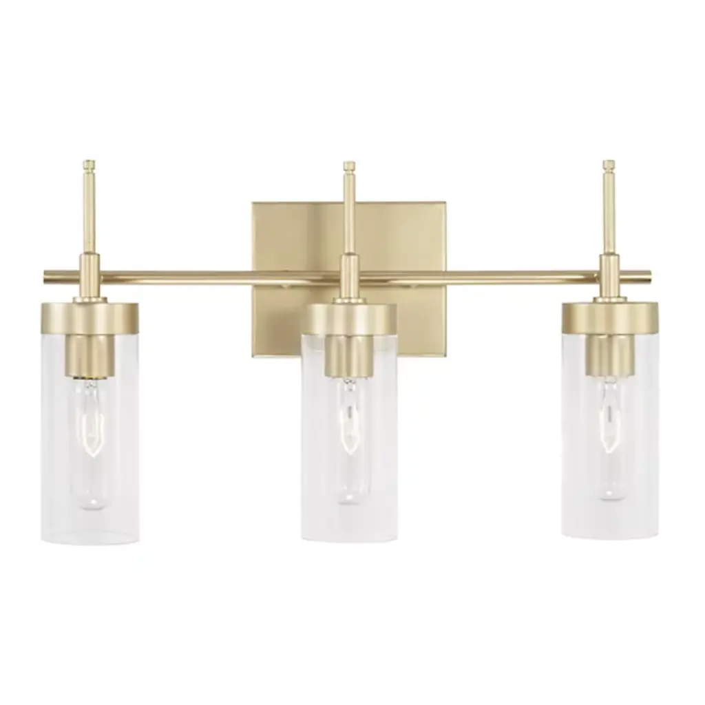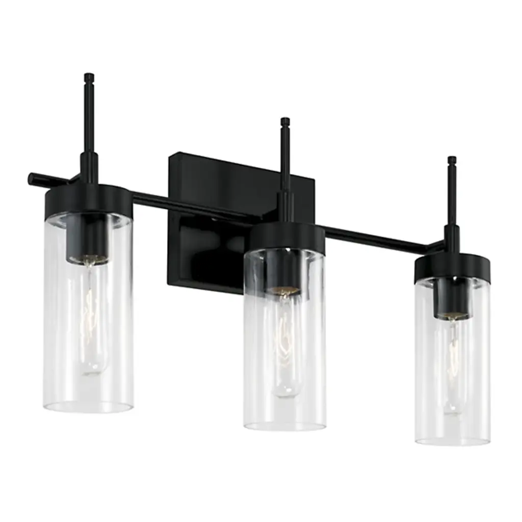 Inspire your home décor with the addition of the Tara Vanity Light by Alder & Ore. Elegantly combining clear glass and striking metal, this piece brings a heightened look to modern bathrooms and vanities. Incandescent bulbs are held inside cylindrical glass shades topped with slender stems and dropped evenly along a horizontal beam. Its light provides a clear and crisp glow that enhances the look of a room as it illuminates.