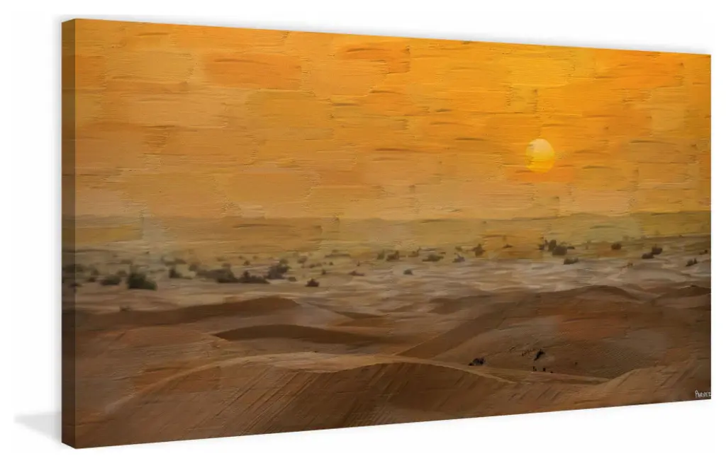 Striking and unique, the "Tarfaya" Print on Canvas by Parvez Taj will bring your walls to life. Printed on canvas, this 24 inch wide by 12 inch tall contemporary artwork will make a statement in any living room, dining room, or bedroom.- Fine art canvas print by Parvez Taj- Professionally hand stretched- Gallery wrapped in sustainable, non-warping wood- Arrives ready to hang- Made in the USA- Includes a certificate of authenticity- Artist signature on the front