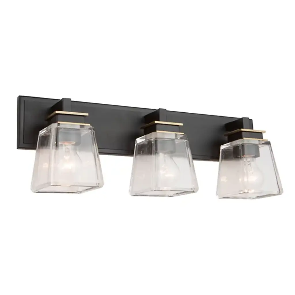 The Tayla Vanity Light from Huxe brings a sleek and traditional silhouette to bathroom spaces. Adorned with contrasting colors and materials, this piece brings an elegant and tasteful appeal that immediately uplifts the décor of the room. A set of clear glass shades mount in parallel to a clean rectangular backplate at the end of brief, sharply-angled arms. The lamp within each shade provides an even glow that spreads with ease throughout the space.