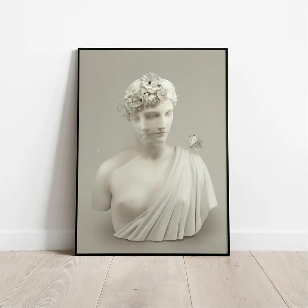 Téa is a tribute to the goddesses of Olympus. This majestic sculpture of Téa stands proudly, crafted from dazzlingly pure white marble.Téa captivates the viewer with a captivating ambivalence between symbols of femininity, such as flowers, a butterfly, and a face with androgynous features.Positionable as desired in any room of the house, this wall painting brings a captivating presence and a touch of unique poetry to your decor.Téa can be paired with the Éléna Collector Portrait to create an evocative duo when hung side by side on your wall.Painting - Design: Rachel & Benoît ConversMaterials: high pressure laminate frame (HPL) with printing on compressed paperDimensions: H.85 × L.64 × W.4 cm - Weight: 4.8 kgLimited series of 300 pieces, numbered and accompanied by a certificate of authenticity signed by the author