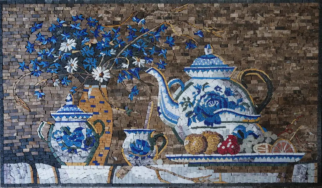 Introducing the "Tea Party - Handcut Mosaic," a stunning piece of artistry that brings a touch of elegance and a whimsical charm to any space. This exquisite marble mosaic captures the delightful essence of a delightful tea party, featuring a beautifully crafted blue tea cup positioned gracefully beside an inviting plate of fresh, vibrant fruits. Handmade with meticulous attention to detail, each piece of this mosaic is carefully cut from high-quality marble stones, ensuring that no two artworks are exactly alike. The intricate design showcases the skill and artistry of our craftsmen, resulting in a unique masterpiece that transforms any wall into a focal point of beauty and sophistication. Whether you're looking to enhance your kitchen, dining area, or any living space, the "Tea Party - Handcut Mosaic" offers an aesthetic finish that blends seamlessly with various decor styles. Its rich colors and detailed imagery evoke a sense of warmth and serenity, making it perfect for creating an inviting atmosphere for gatherings or quiet moments alone.Installation is a breeze, allowing you to easily incorporate this artwork into your mural or stand-alone display. With its timeless appeal and high-quality craftsmanship, the "Tea Party - Handcut Mosaic" is not just a decorative piece—it’s an expression of your love for art and the finer things in life. Embrace the charm of a classic tea party and elevate your home decor with this stunning mosaic. Indulge in the beauty of handcrafted elegance today!