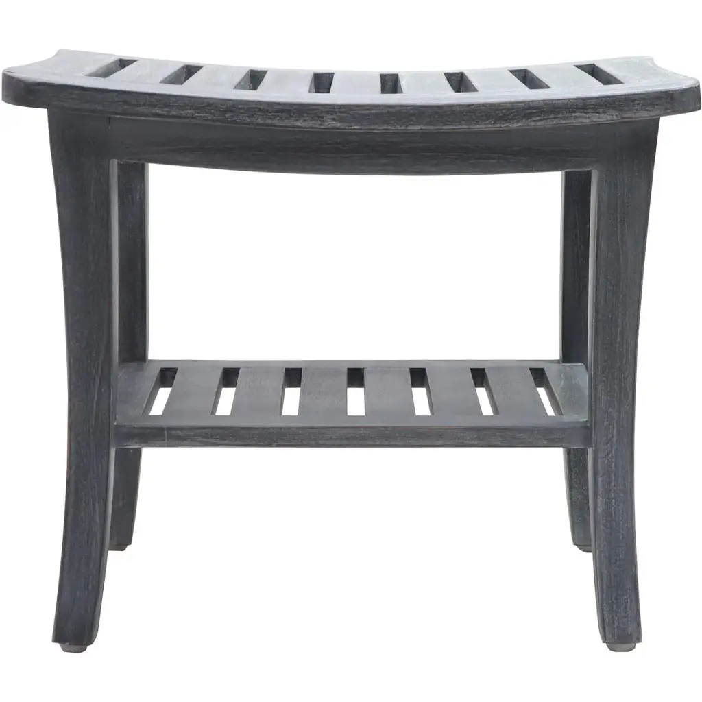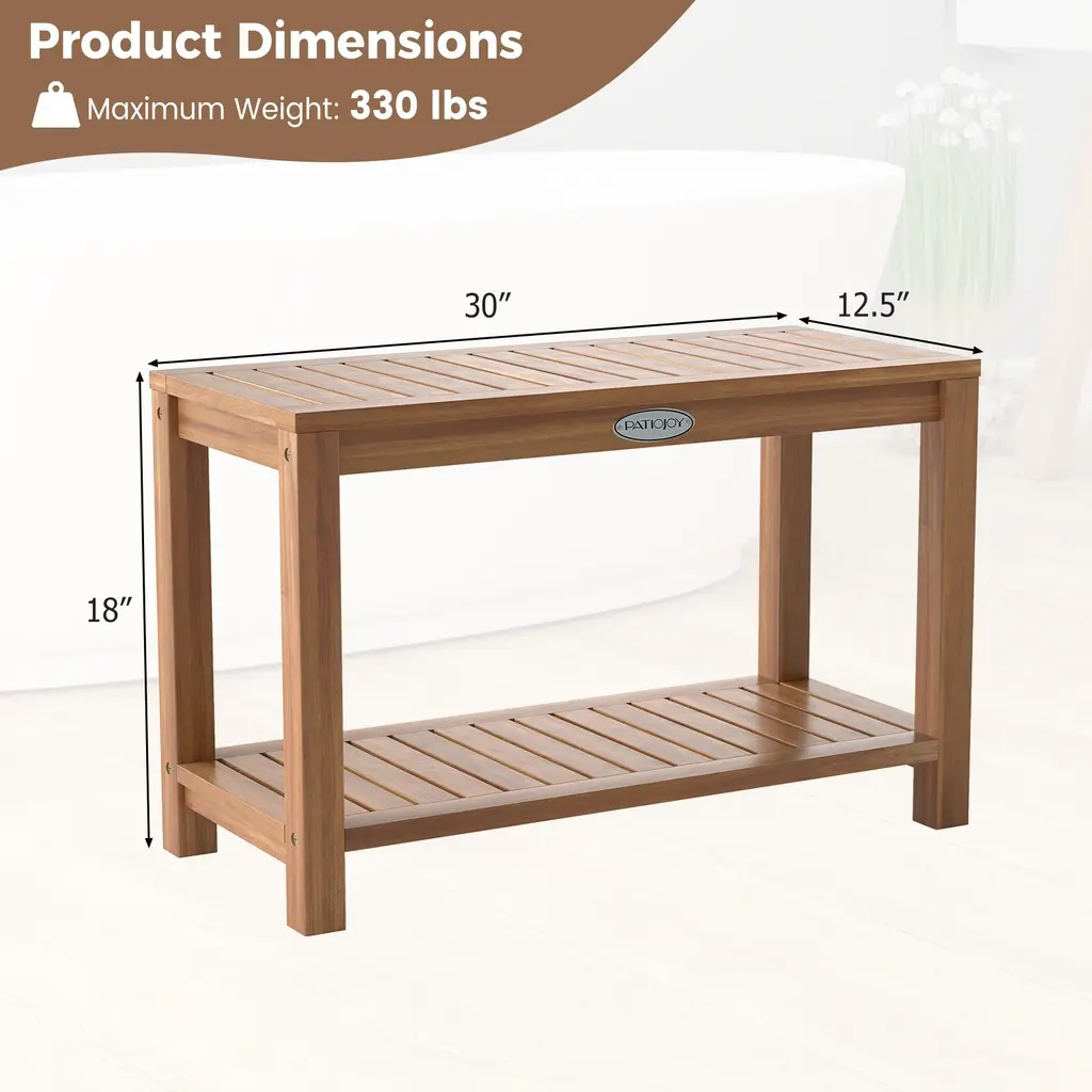 SpecificationsKey Features● Teak Wood Frame: The shower bench is made of teak wood, which is renowned for its exceptional sturdiness, natural beauty and durability. More than that, the use of water-based painting ensures extended service life and easy maintenance.● 2-tier Storage Space: Equipped with a 2-tier storage shelf, the shower stool is perfect for keeping your bathroom essentials within easy reach, such as towels, toiletries, and more. Therefore, you can embrace the beauty of organization.● Multipurpose Design: In addition to its primary function as a shower bench, the versatile piece can also be utilized as a shoe bench, sofa side, end of bed table or entryway storage shelf to suit your specific requirements.● Considerate Details: Each tier of the inside shower bench is slatted to avoid water accumulation thus keeping the seat dry. Moreover, the bath spa stool features thick boards, ensuring a reliable weight capacity of 330 lbs.