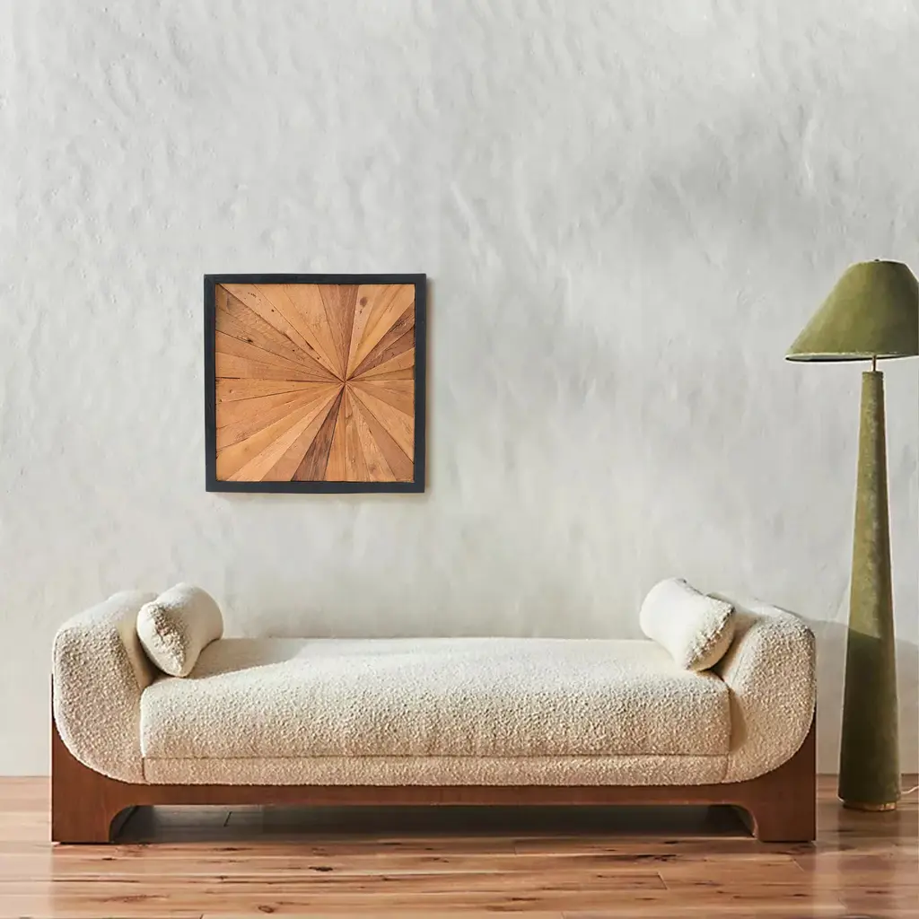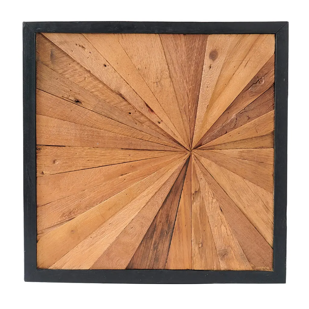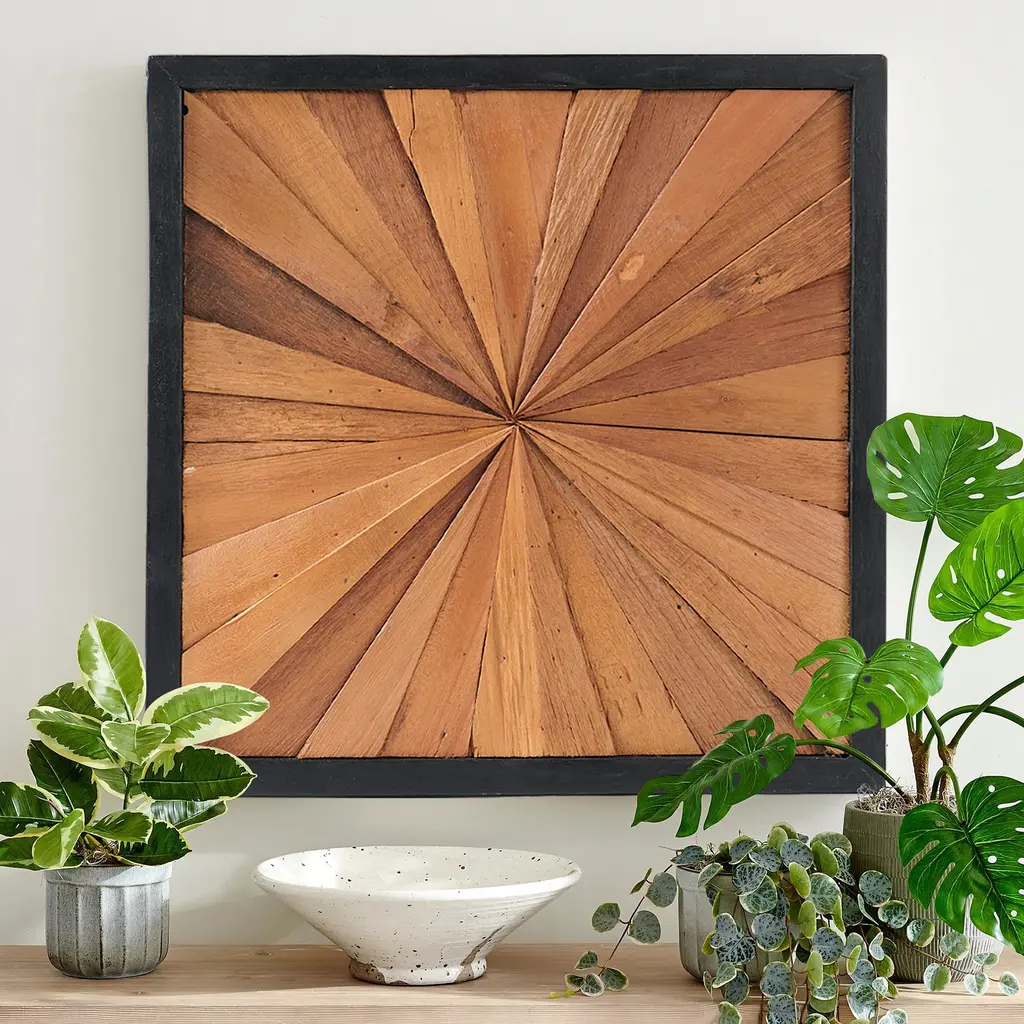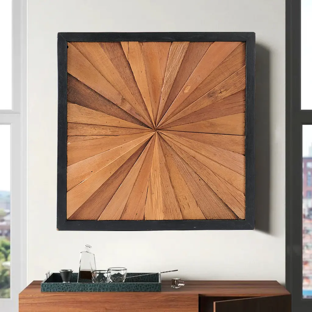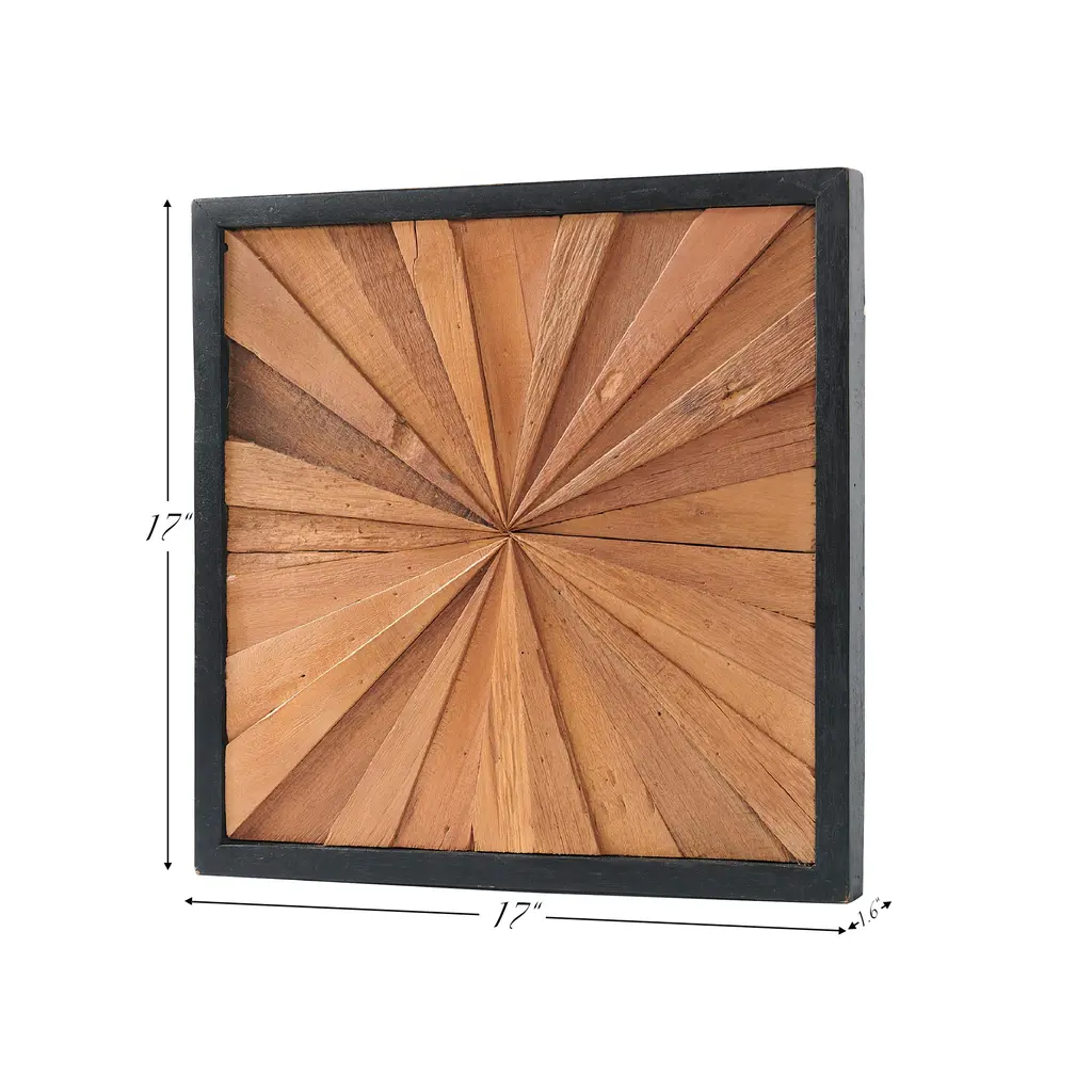 PANEL SIZE: 17" x 17" x 1.6" Inches. The wall decor is a beautiful piece that adds a natural and rustic touch to any space. Each piece is uniquely crafted, showcasing a distinctive shape. ARTISTIC: Crafted from teak wood, the design features a sunburst pattern created by a series of triangular wood panels arranged in a radial fashion. The varying shades of brown bring a sense of depth and dimension, while the black frame accentuates the geometric design. PLACEMENT: Versatile in placement, these wall art pieces are perfect for grouping together to create a stunning focal point. They also stand out individually, adding character and charm to any room. LIFESTYLE: Designed to effortlessly enhance any wall, whether in the living room, bedroom, or hallway, these wooden wall decors bring warmth and sophistication to your surroundings. CARE: Simply wipe clean with a dry cloth. Avoid using bleach or harsh chemical solutions to preserve the original color and quality of the wood.