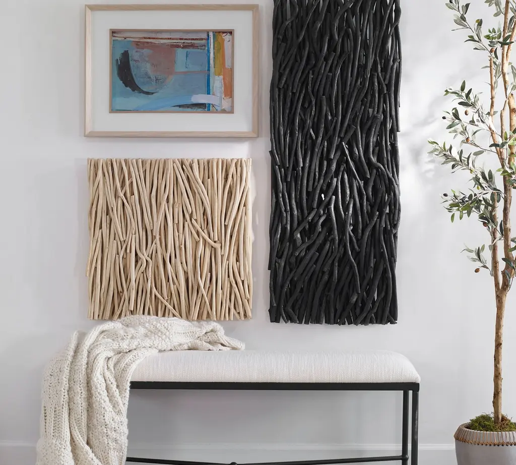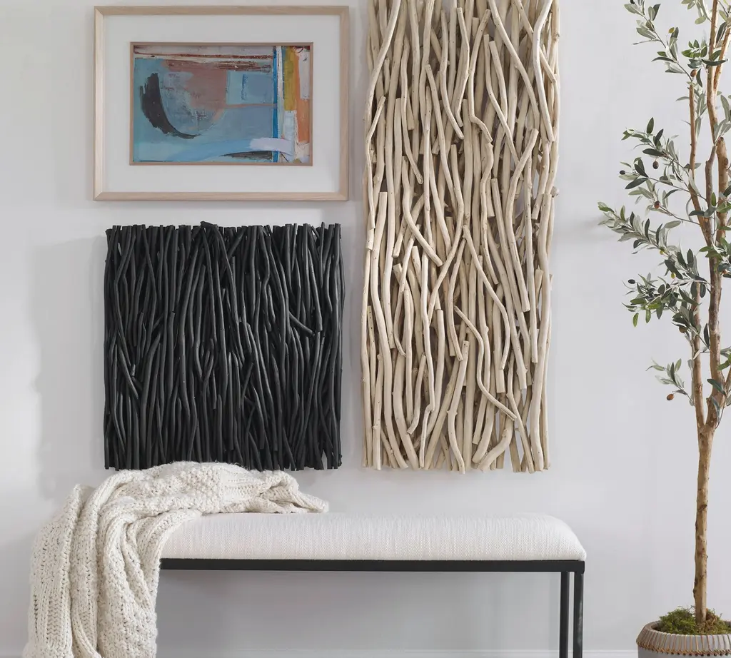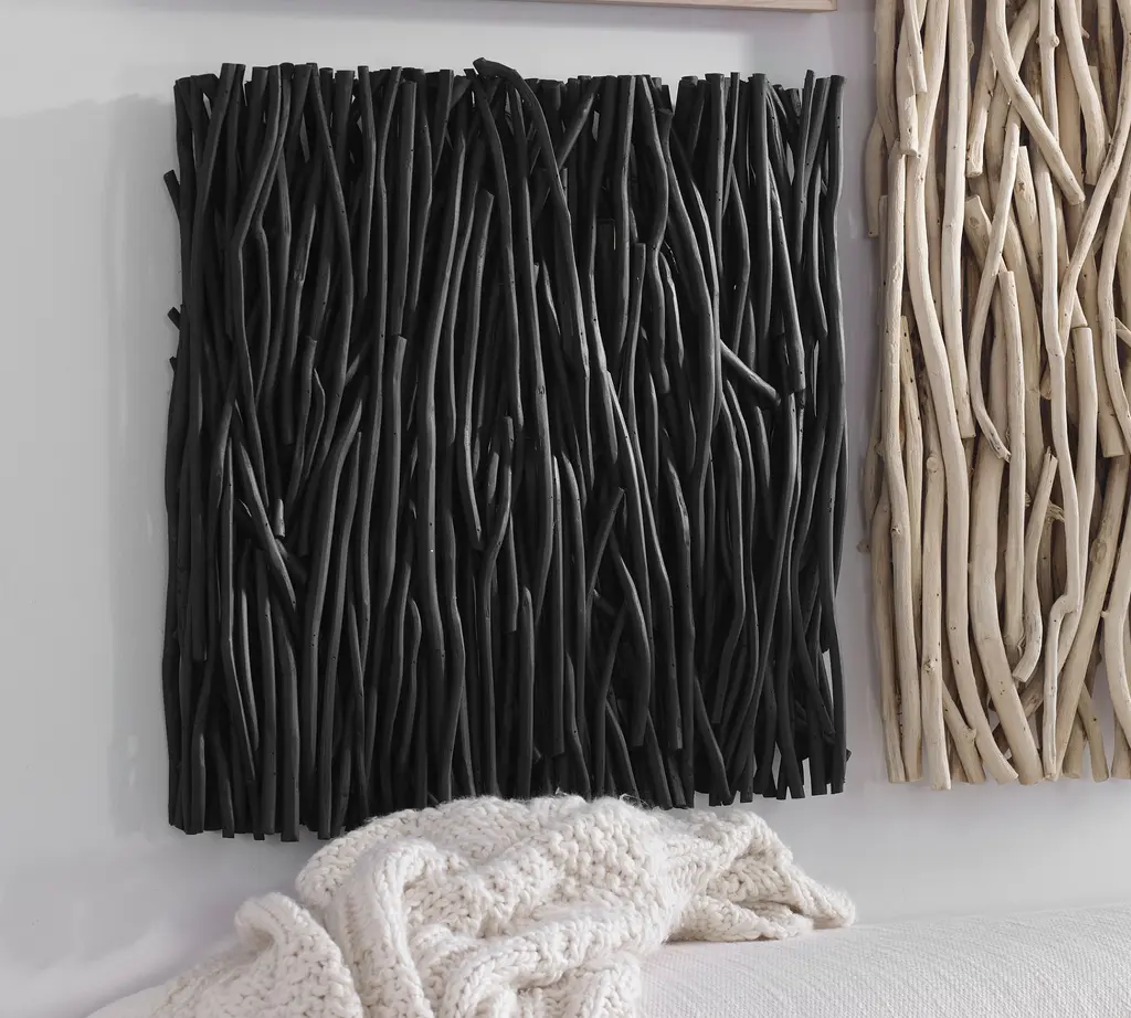 Abstract but organic, this wall panel is made of tangled strands of teak wood. Choose your neutral finish and shape to add subtle, richly textural sculpture to your walls. We like to cluster multiple shapes and mix up the finishes to make a big, modern statement.
