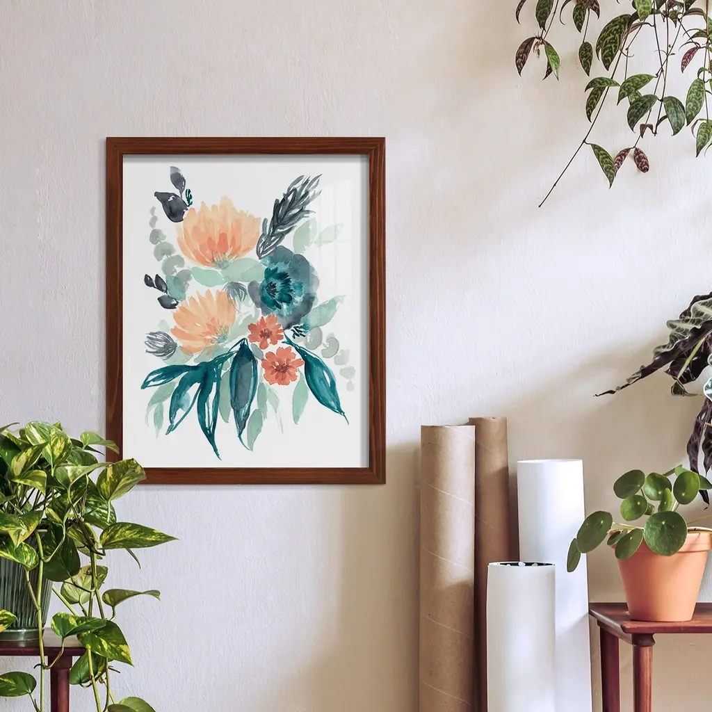 Teal & Peach Bouquet I -EZ SWITCH Framed Print w/glass-Cherry Red A delightful, framed print. Featuring a solid wood frame with real wood glass. This premium print is giclee quality. In addition, every frame features a removable back and table top stand. This allows you to change your art in the future or to just stand the art on a table for a new look. We are sure you'll enjoy our new series of EZ SWITCH Framed Art. Solid Wood Frame Real Glass Removable / Replaceable Art Built in Tabletop Stand Sizes range from 4x6 up to 12x15 - buy just one or pair them up as sets as you see fit.