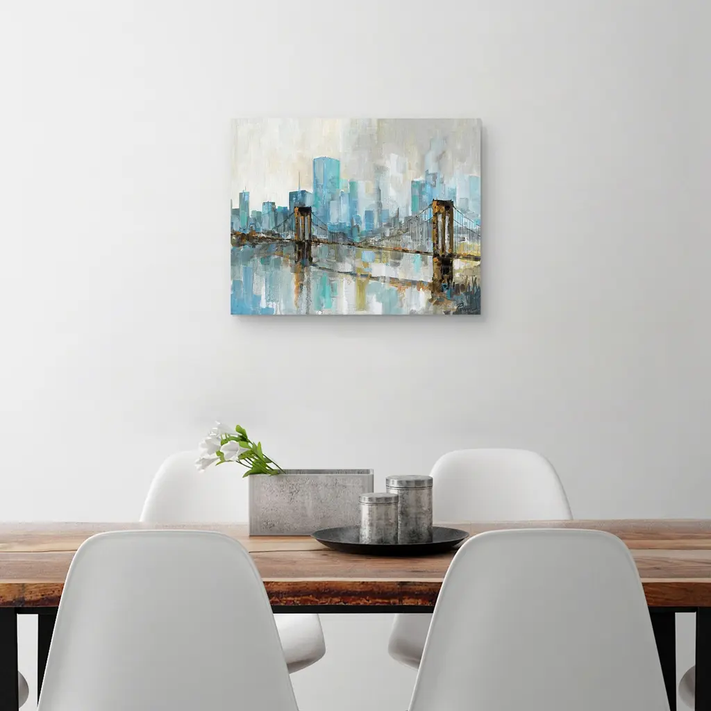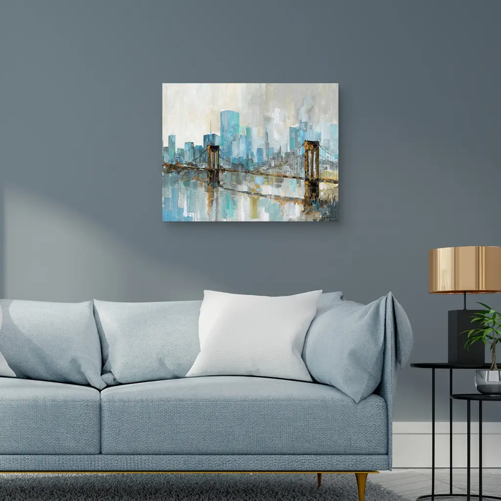 Whether it's the Brooklyn Bridge or the Manhattan Bridge, this tantalizing teal painting print details the city that never sleeps in an abstract manner with a color palette of teal, blue, brown, beige, and white. Offering a reflective moment amid the noise and cacophony of the city, this canvas art print brings a snapshot of urban life right into your home. Produced with full-bleed printing that covers the entirety of the canvas, your new masterpiece is made with state-of-the-art technology that provides museum-quality prints. With quality craftsmanship that guarantees a professional look, this giclee print on canvas is also lightweight and easy to hang.