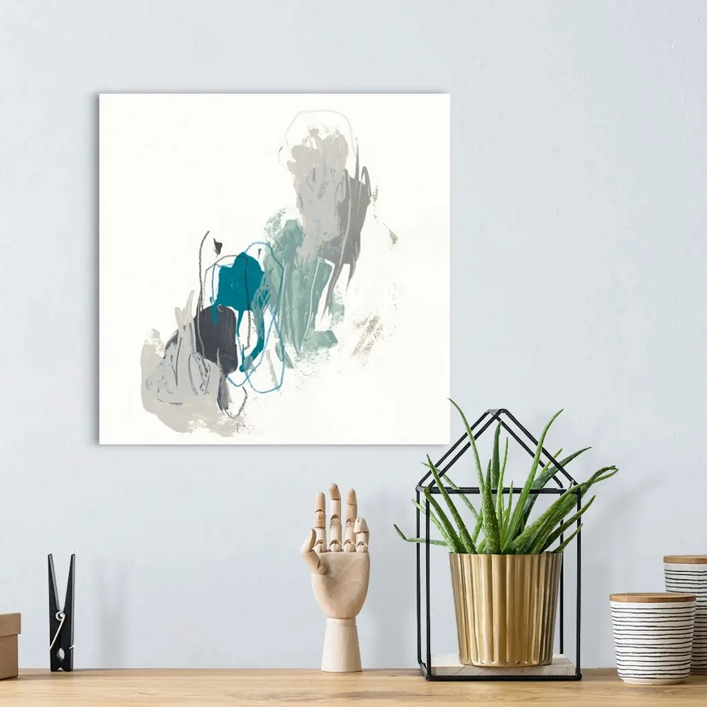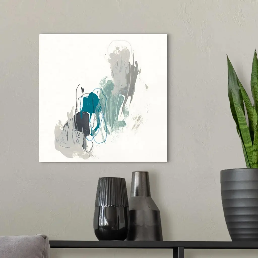 Square abstract painting in cool tones of gray, teal and black with overlaying fine gray and blue lines in circular shapes.