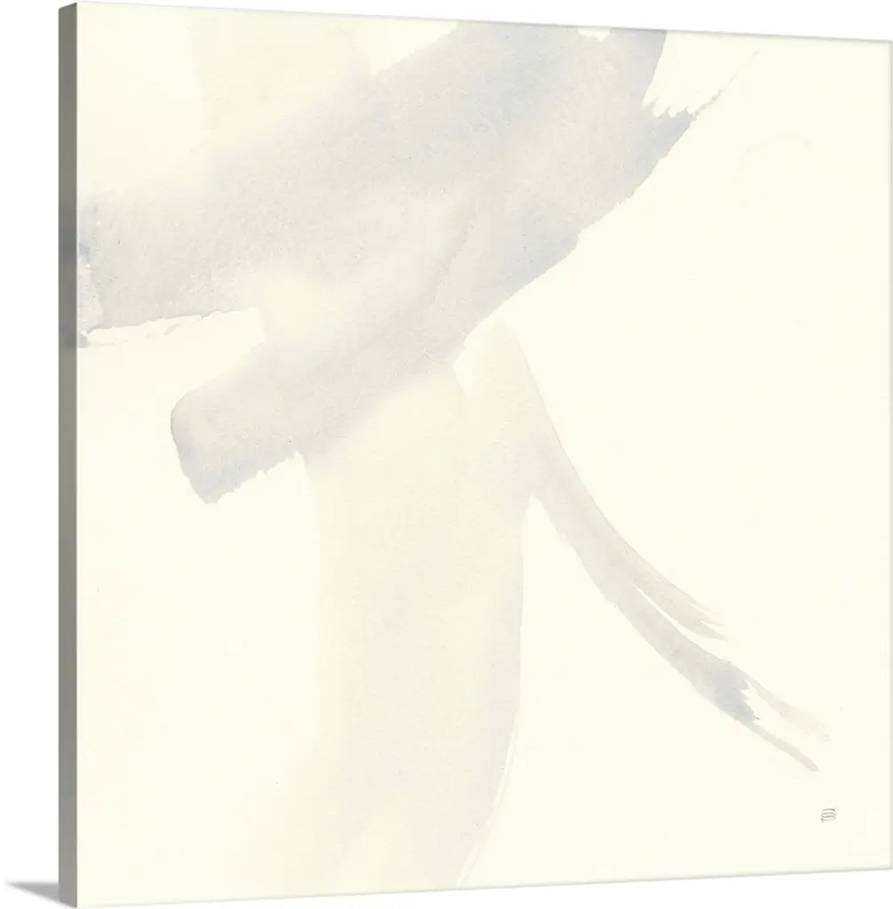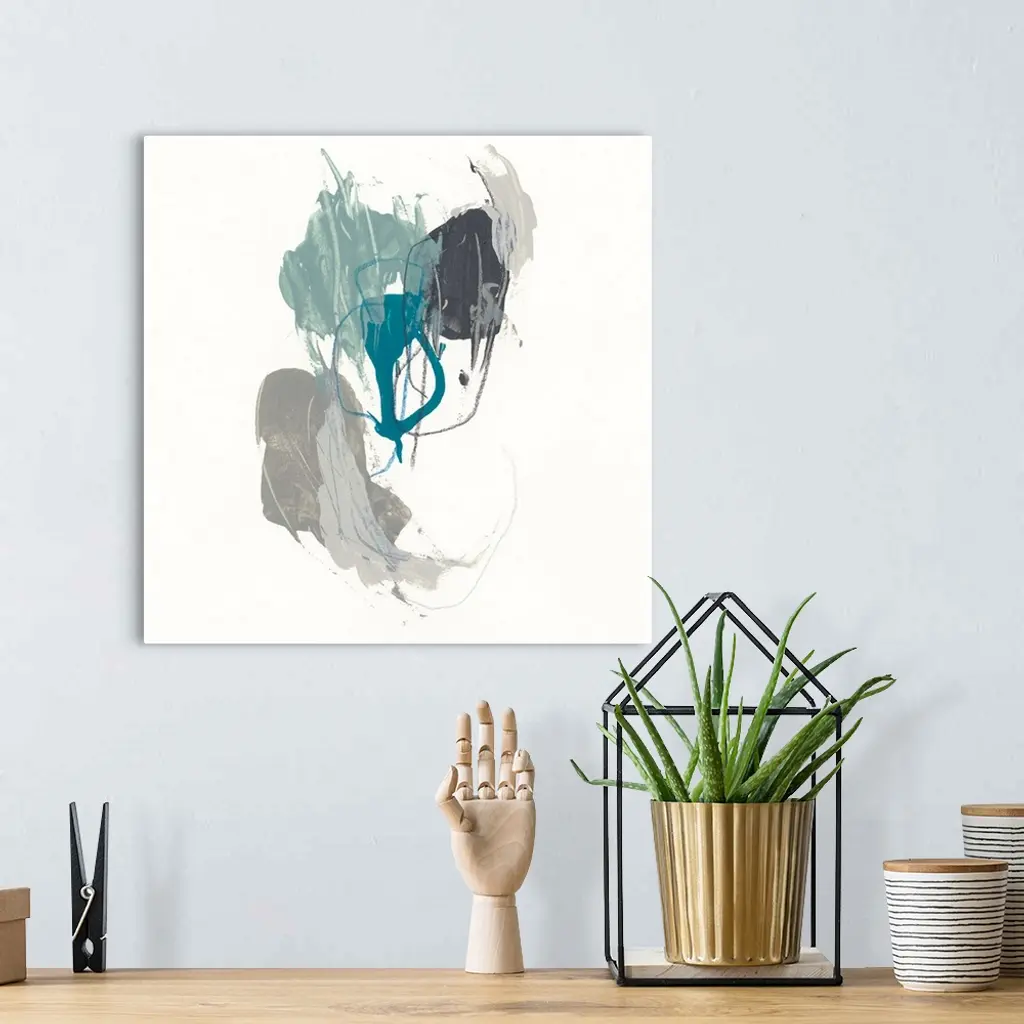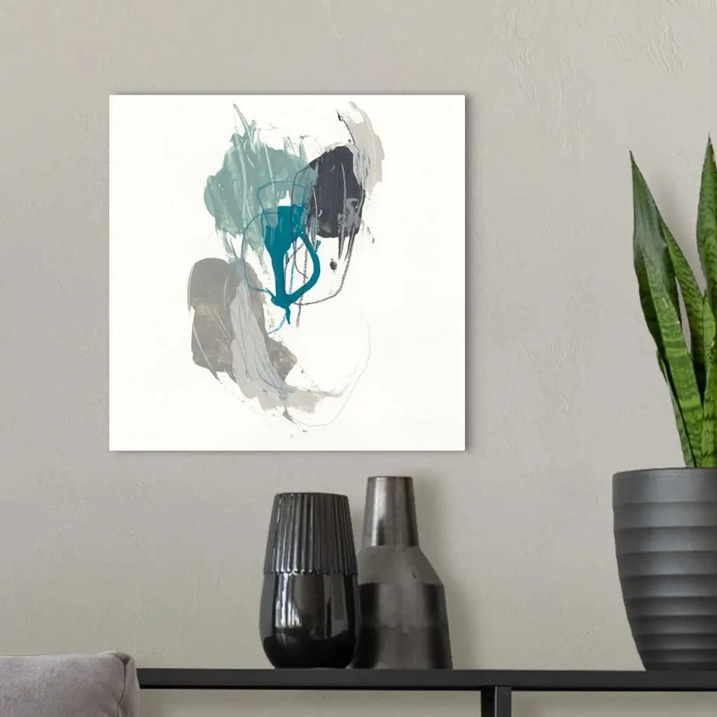 Square abstract painting in cool tones of gray, teal and black with overlaying fine gray and blue lines in circular shapes.
