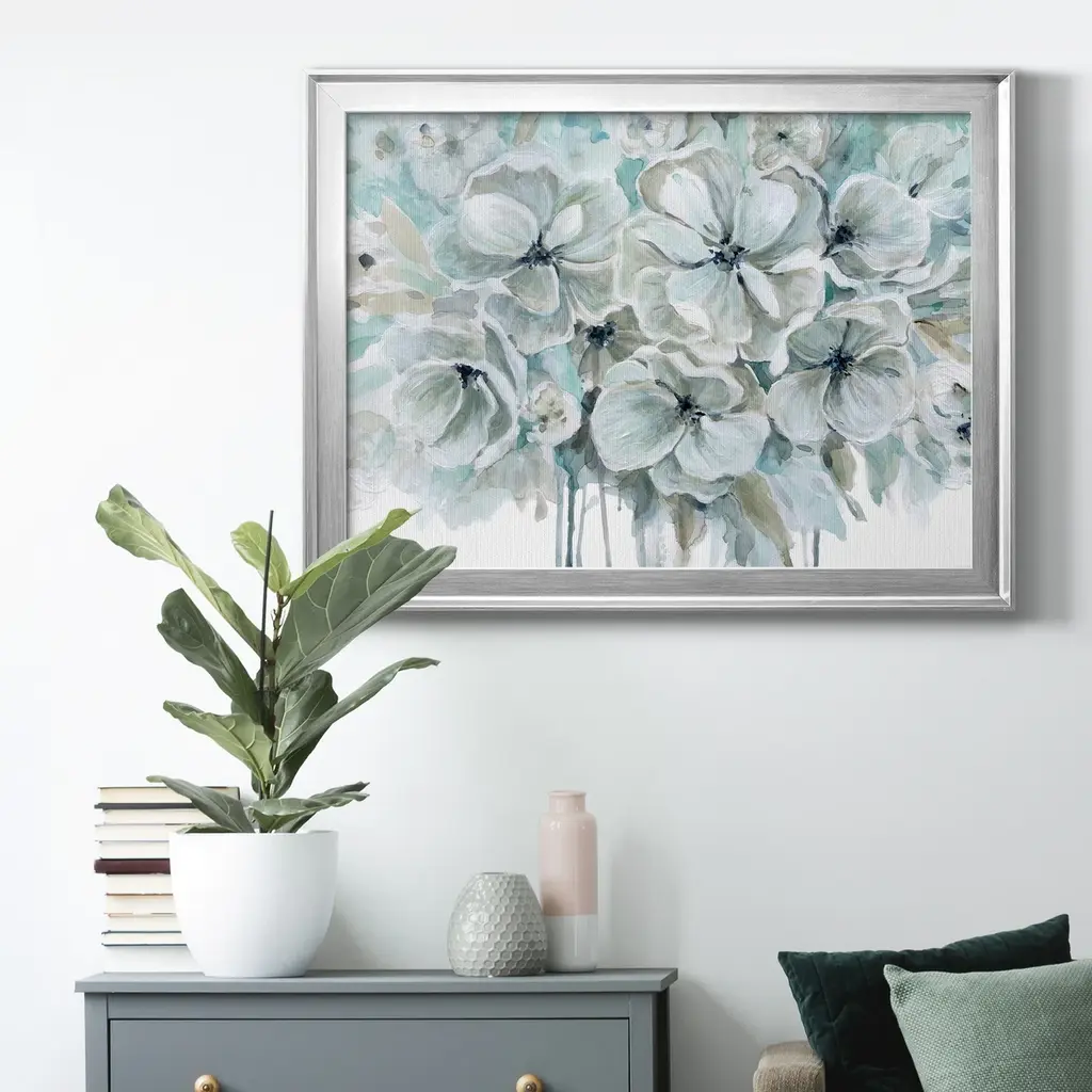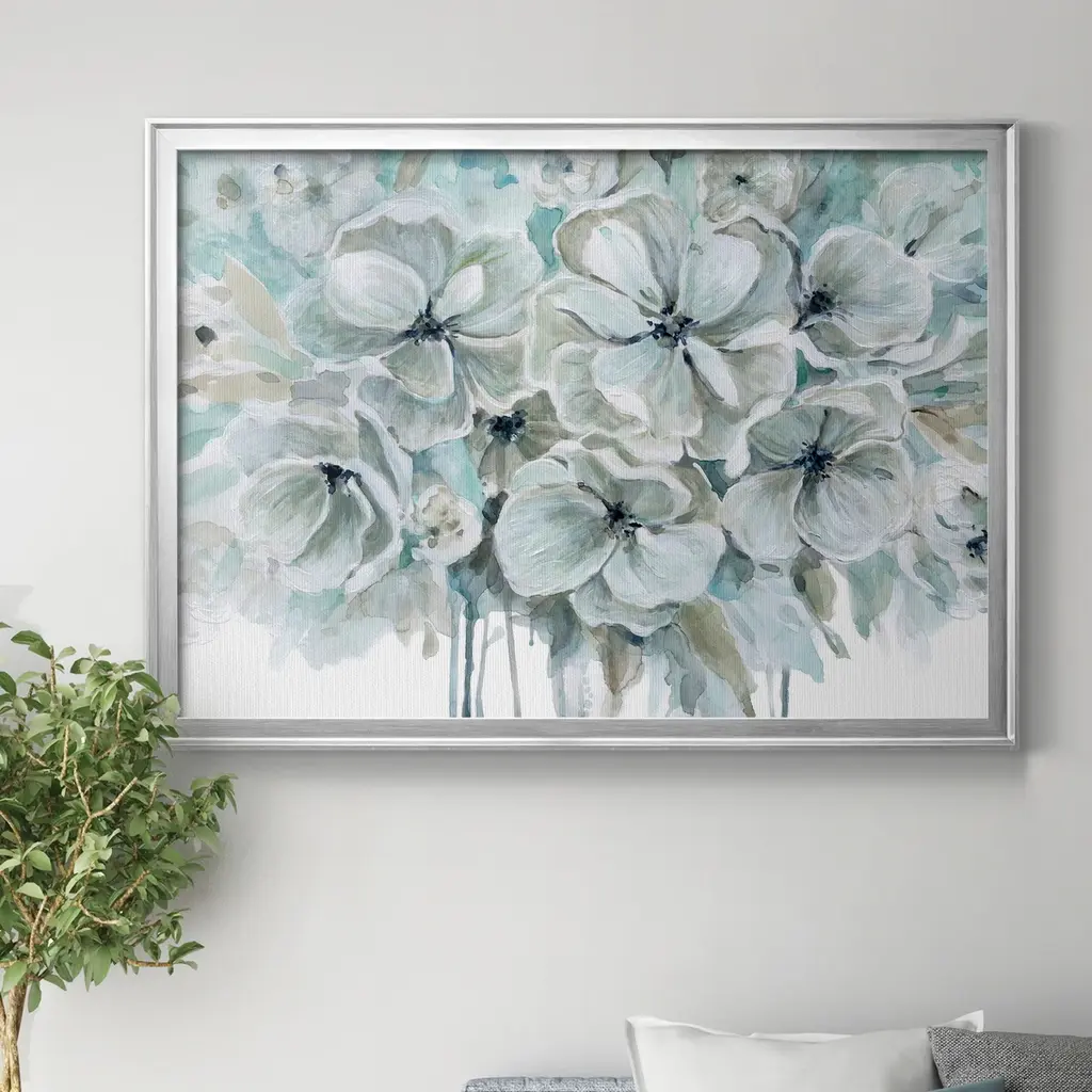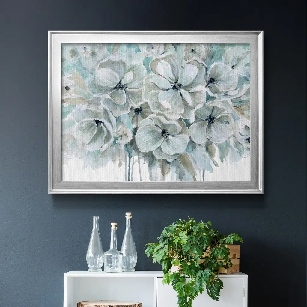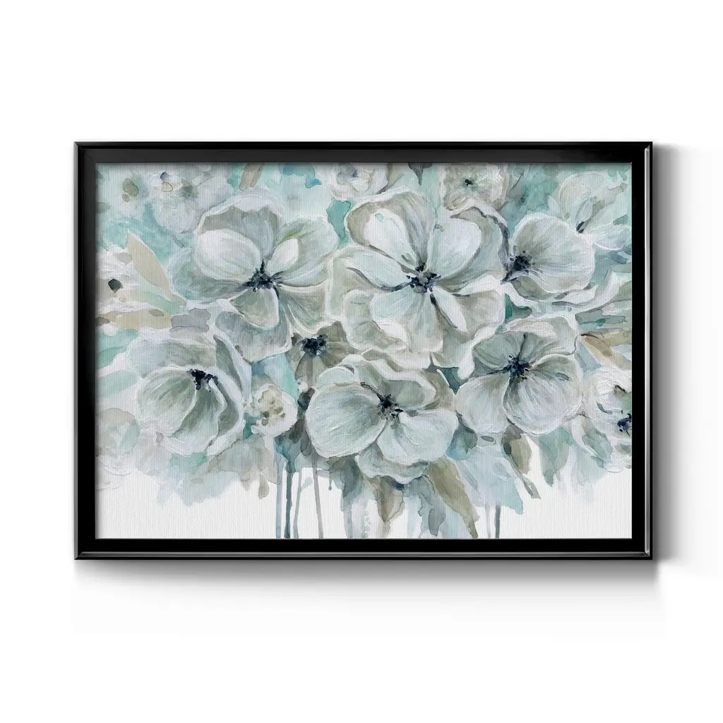 Teal Harmony I Premium Framed Canvas - Ready to Hang A Premium Framed Canvas created to last. Framed in distressed wood and available in an array of sizes and colors Featuring a beveled a solid wood stretcher bar, each piece comes ready to hand 4 SIZES AVAILABLE 30.5''X42.5'' - Overall Size 26.5'X36.5'' - Overall Size 22''x30'' - Overall Size 18''x24'' - Overall Size Each piece is made to order. Each piece comes with hanging hardware. Made in the USA Ready to Hang Giclee Paper Print Acrylic Glass Beveled Matt Board