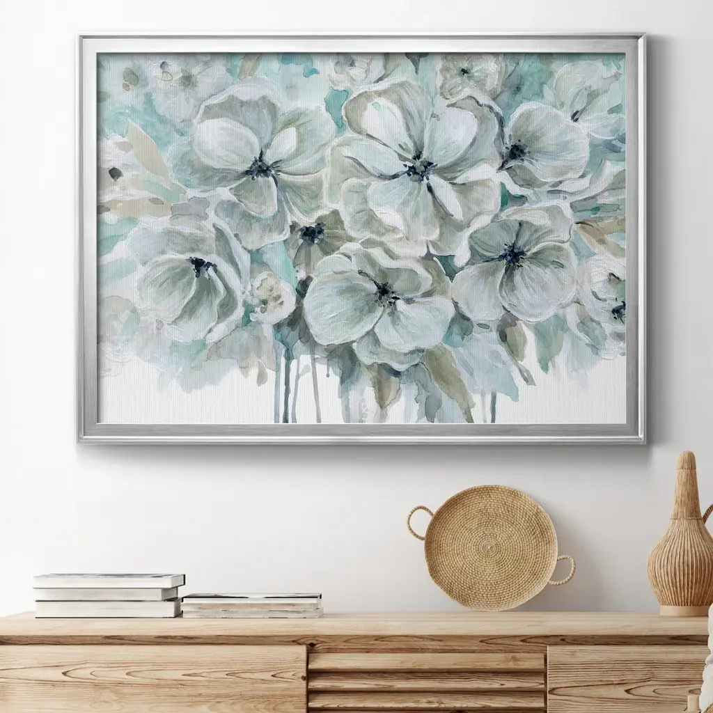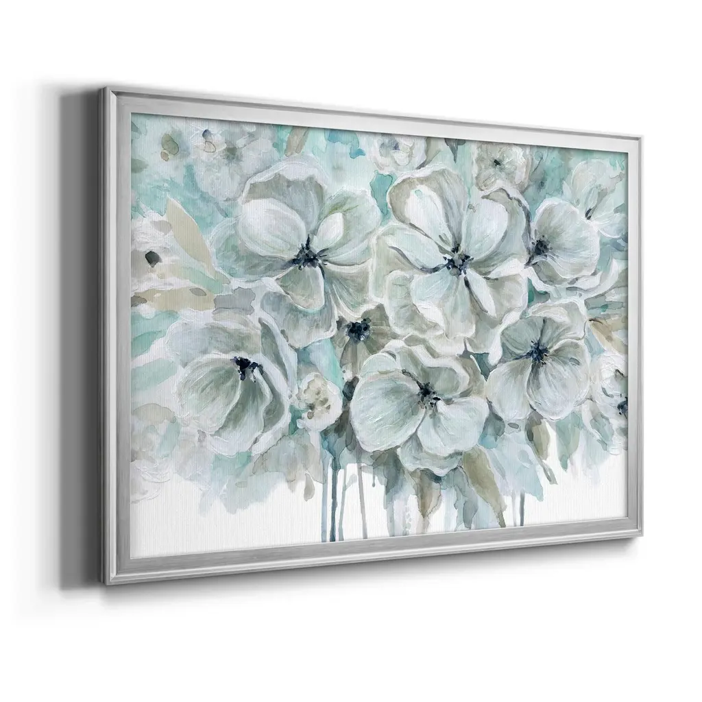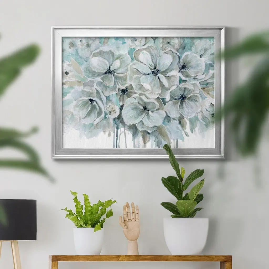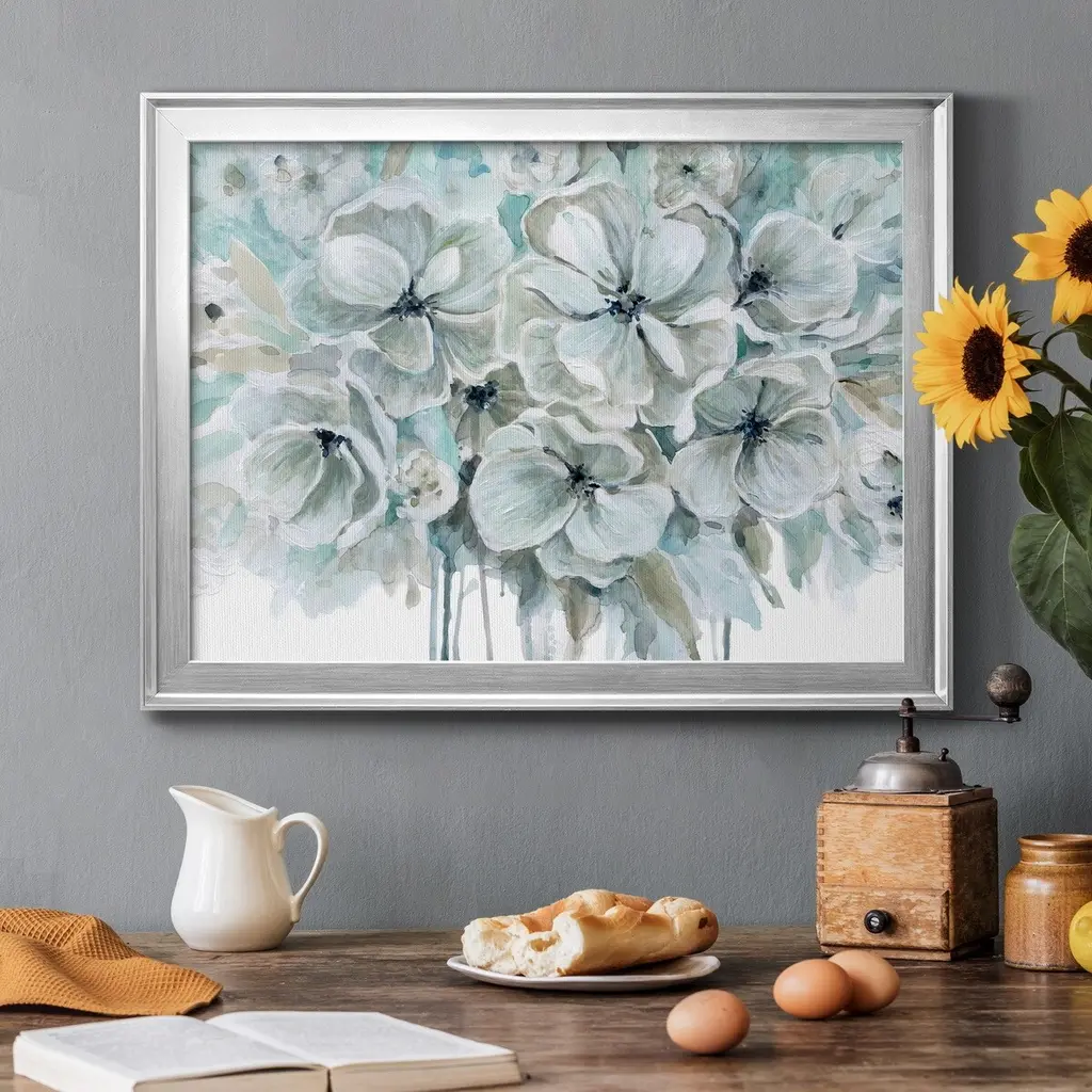 Teal Harmony I Premium Framed Canvas - Ready to Hang A Premium Framed Canvas created to last. Framed in distressed wood and available in an array of sizes and colors Featuring a beveled a solid wood stretcher bar, each piece comes ready to hand 4 SIZES AVAILABLE 30.5''X42.5'' - Overall Size 26.5'X36.5'' - Overall Size 22''x30'' - Overall Size 18''x24'' - Overall Size Each piece is made to order. Each piece comes with hanging hardware. Made in the USA Ready to Hang Giclee Paper Print Acrylic Glass Beveled Matt Board