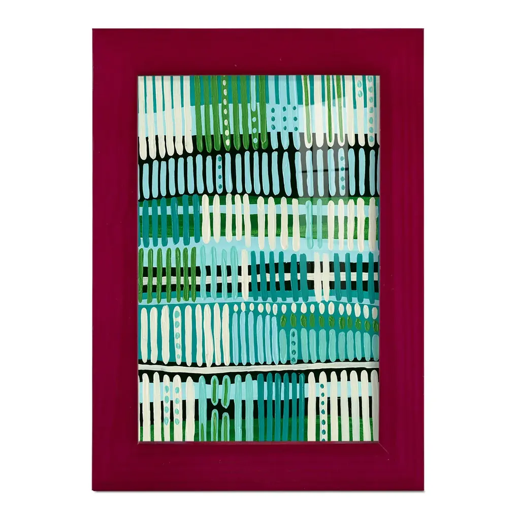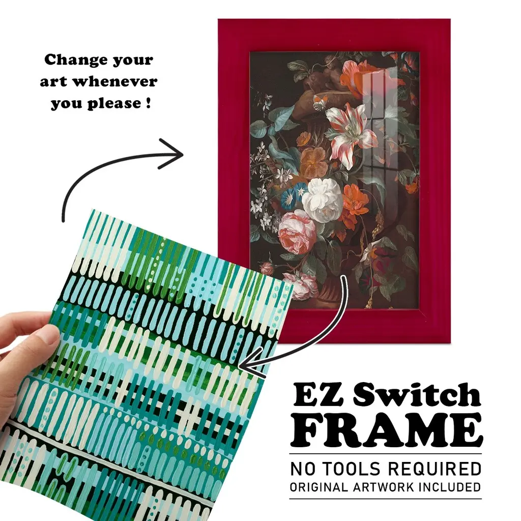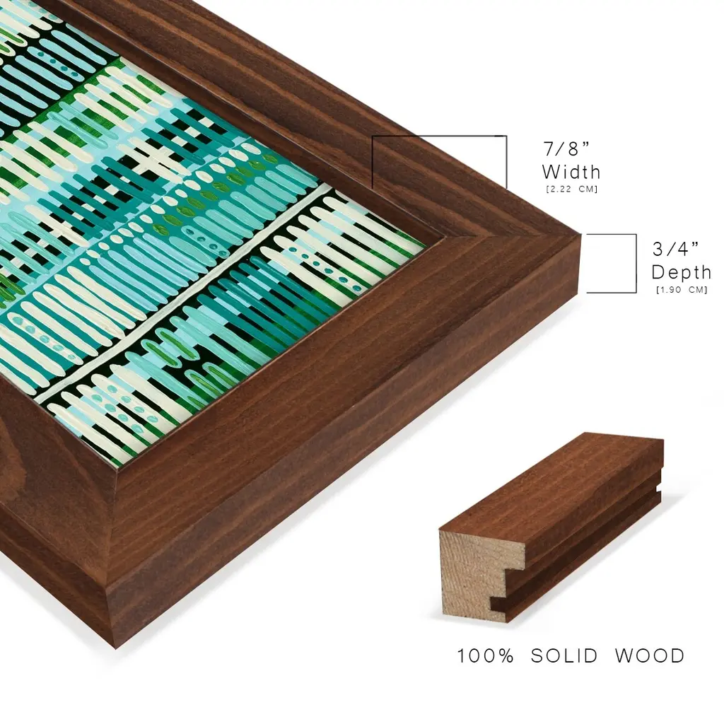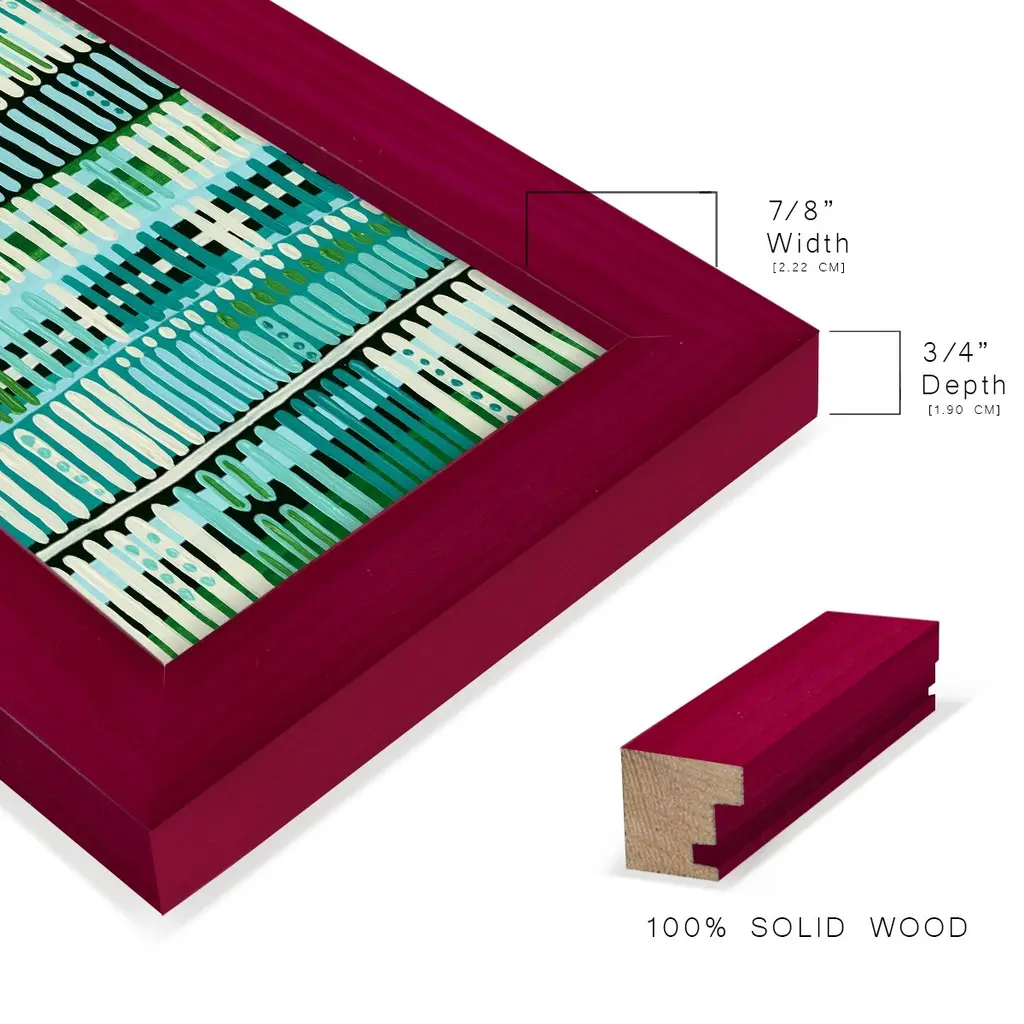 Teal Pattern II -EZ SWITCH Framed Print w/glass-Cherry Red A delightful, framed print. Featuring a solid wood frame with real wood glass. This premium print is giclee quality. In addition, every frame features a removable back and table top stand. This allows you to change your art in the future or to just stand the art on a table for a new look. We are sure you'll enjoy our new series of EZ SWITCH Framed Art. Solid Wood Frame Real Glass Removable / Replaceable Art Built in Tabletop Stand Sizes range from 4x6 up to 12x15 - buy just one or pair them up as sets as you see fit.