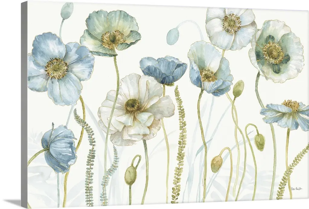 Contemporary painting of blue and light pink poppy flowers on a rustic white wood paneled background.