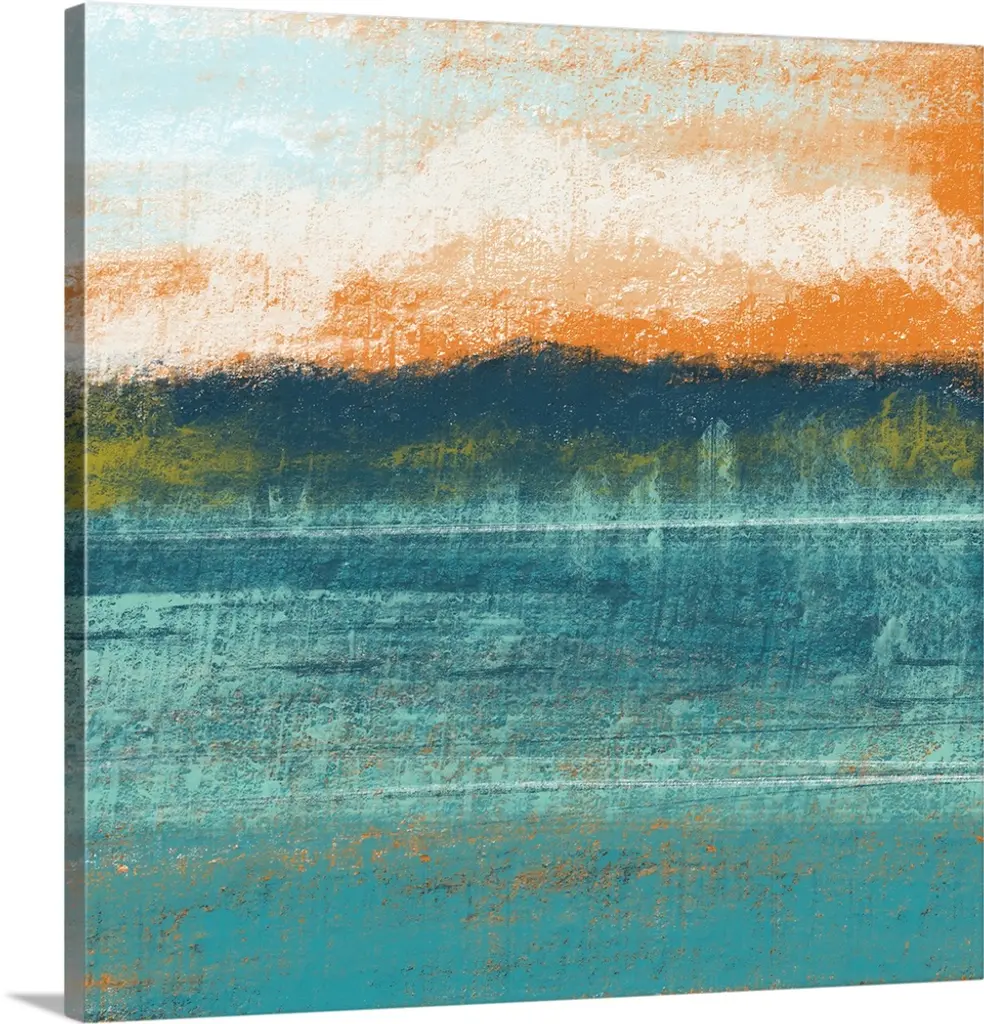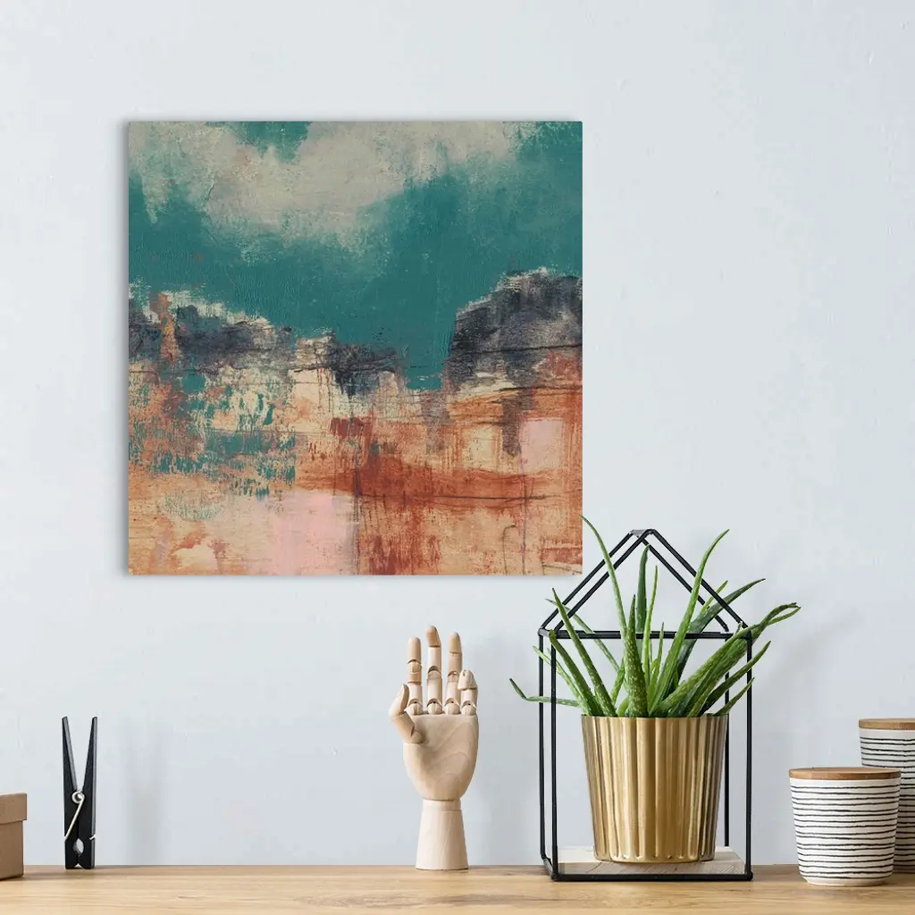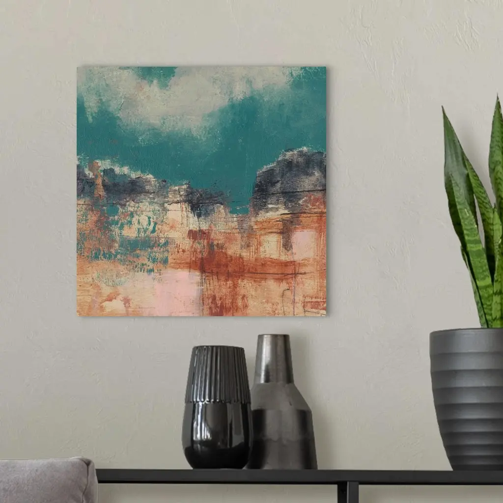 This square landscape painting features a rocky canyon formation with a vibrant teal sky dappled above.