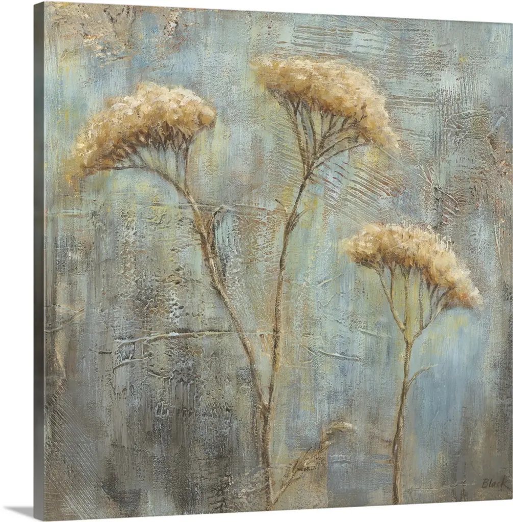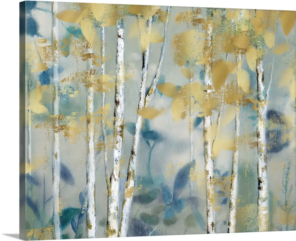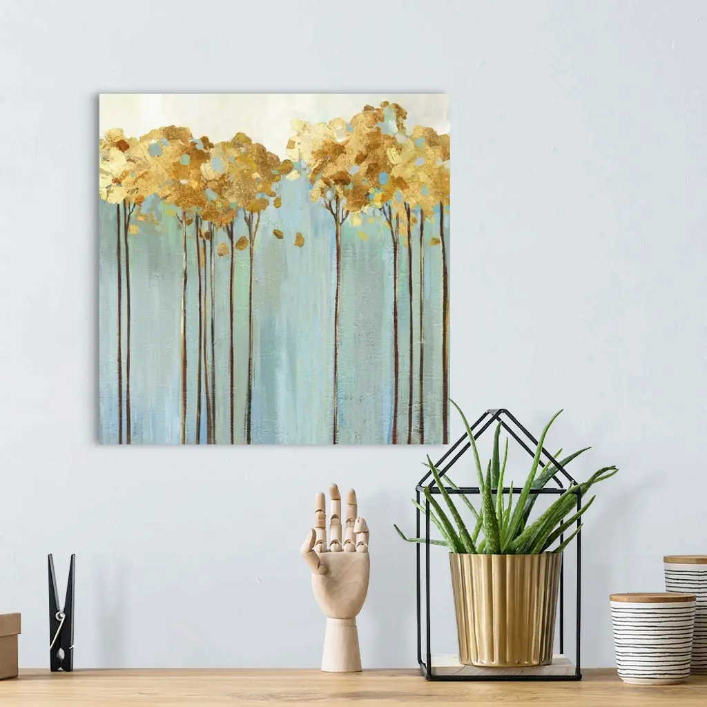 Contemporary painting of a row of slender trees with golden leaves over pale blue and cream.