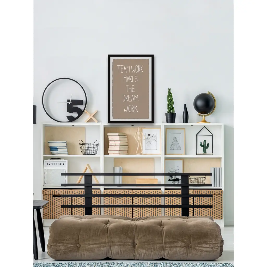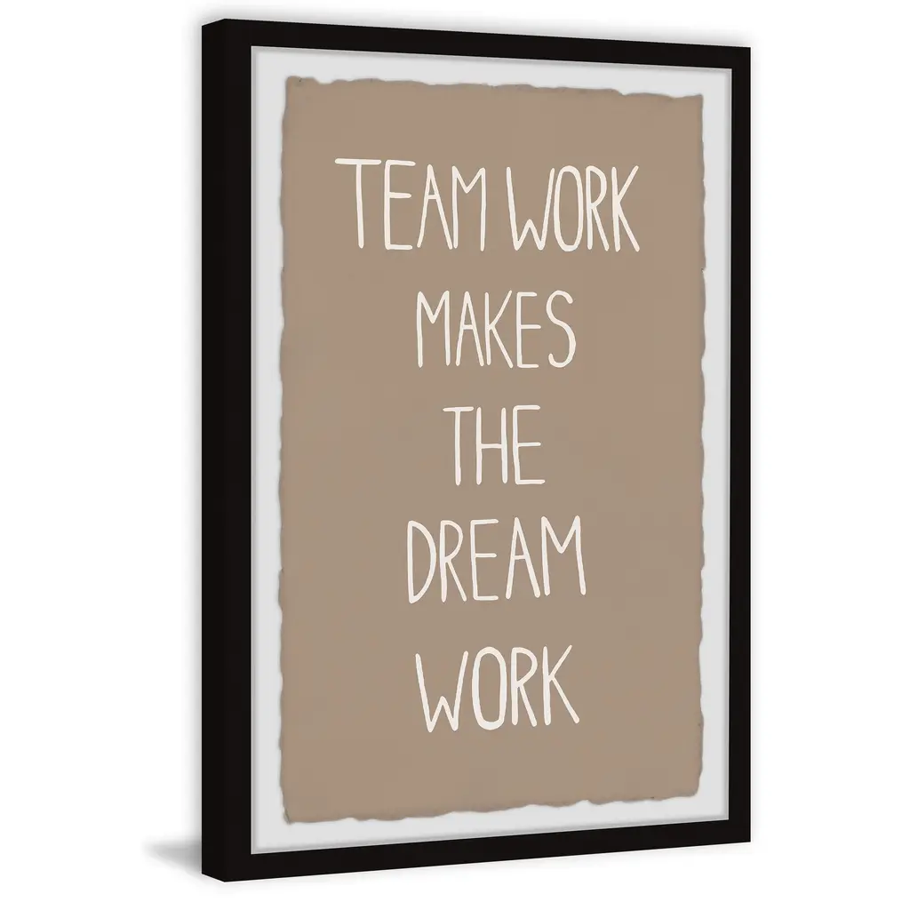 Inspire those in your home to come together with this textual art print that says: Team work makes the dream work. Proudly printed in the USA, this piece is printed on high quality archive paper and professionally hand-framed. With wall-mounting hooks included, this artful accent is ready to hang up as soon as it reaches your front door. • Top quality Giclee print on high resolution Archive Paper • Hand cut deckled edges • High quality durable non-warping frame • Finished under shatter resistant plexiglass • Arrives ready to hang • Includes a certificate of authenticity • Printed in the USA