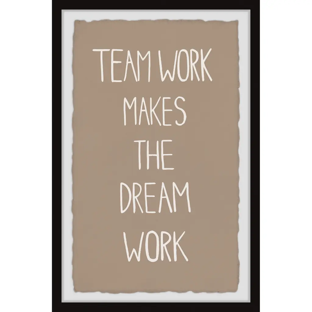 Inspire those in your home to come together with this textual art print that says: Team work makes the dream work. Proudly printed in the USA, this piece is printed on high quality archive paper and professionally hand-framed. With wall-mounting hooks included, this artful accent is ready to hang up as soon as it reaches your front door. • Top quality Giclee print on high resolution Archive Paper • Hand cut deckled edges • High quality durable non-warping frame • Finished under shatter resistant plexiglass • Arrives ready to hang • Includes a certificate of authenticity • Printed in the USA