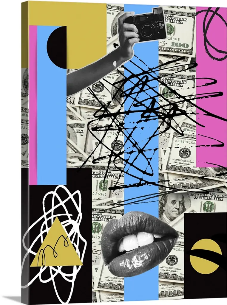 A photograph featuring a woman's face is layered with banknotes from around the world scrawled with handwritten notes. In a technicolor scheme, this piece creates a feeling of edginess to complement modern and contemporary interiors. Printed onto smooth plexiglass this artwork has a sleek, glossy finish and is part of our curated collaboration with Cobra Art.