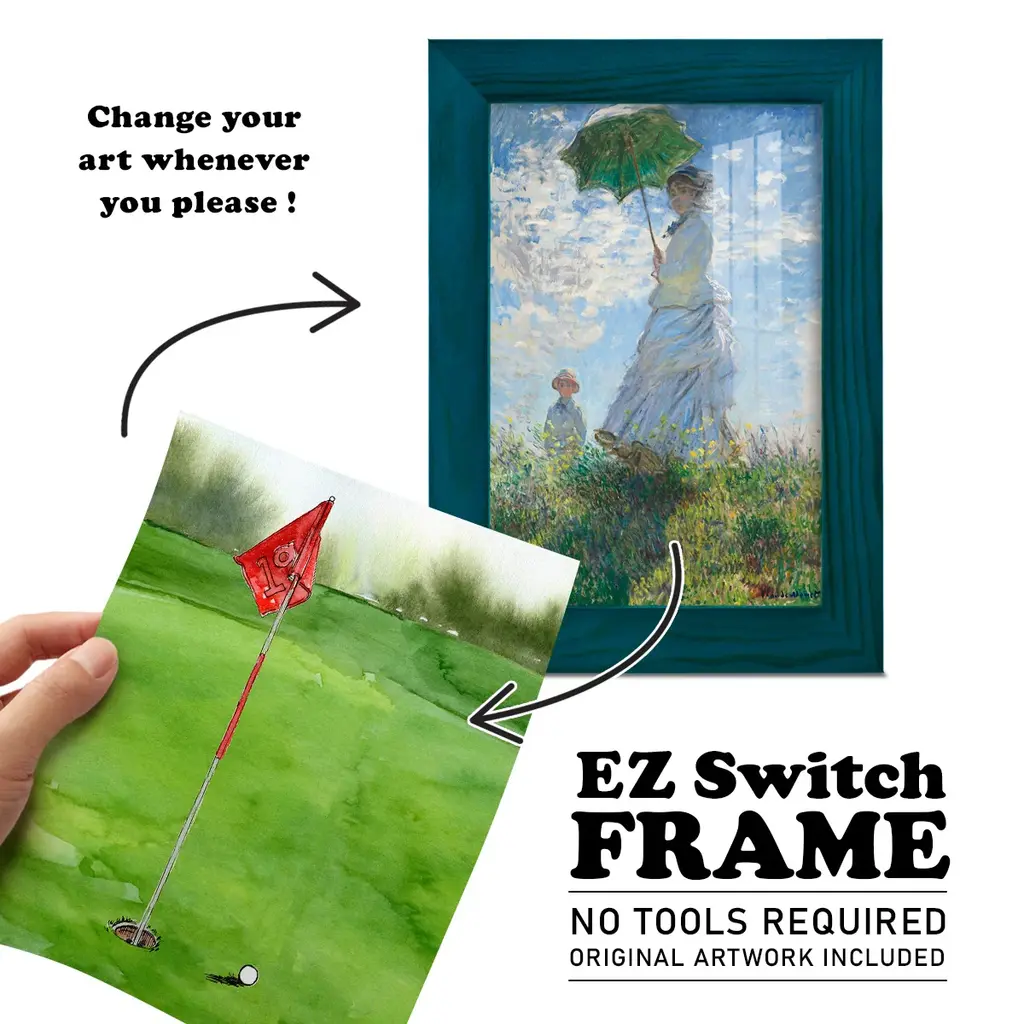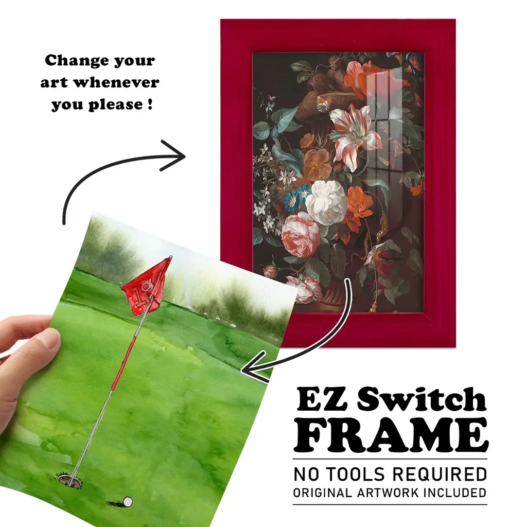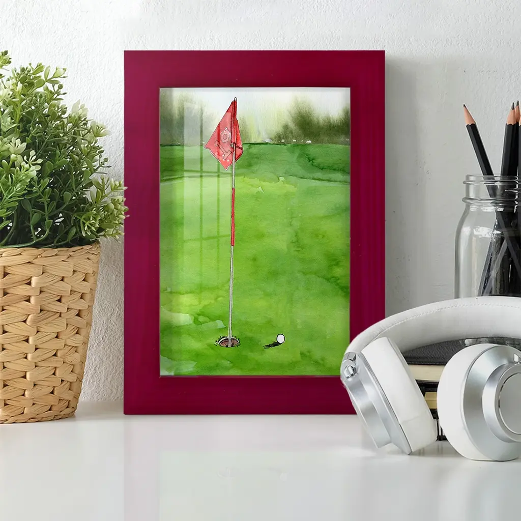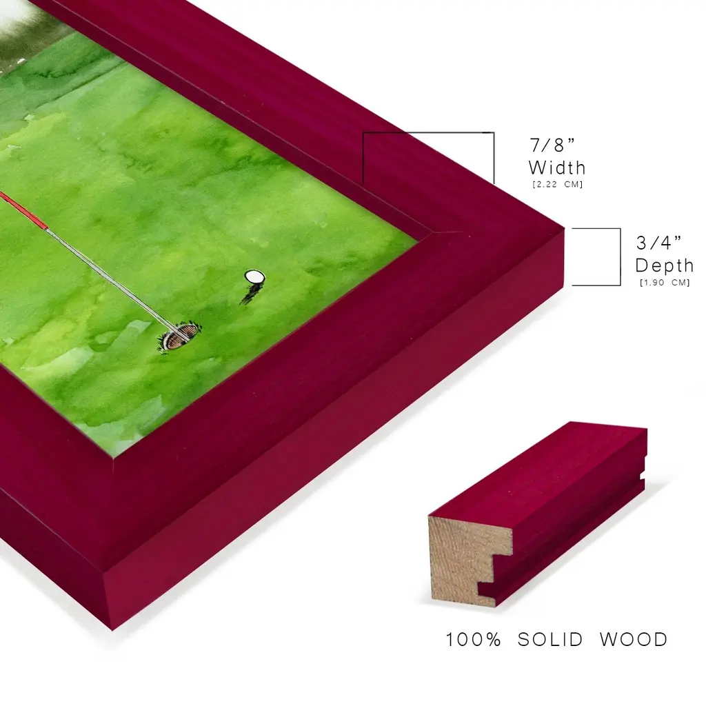 Tee Off Time I -EZ SWITCH Framed Print w/glass-Cherry Red A delightful, framed print. Featuring a solid wood frame with real wood glass. This premium print is giclee quality. In addition, every frame features a removable back and table top stand. This allows you to change your art in the future or to just stand the art on a table for a new look. We are sure you'll enjoy our new series of EZ SWITCH Framed Art. Solid Wood Frame Real Glass Removable / Replaceable Art Built in Tabletop Stand Sizes range from 4x6 up to 12x15 - buy just one or pair them up as sets as you see fit.