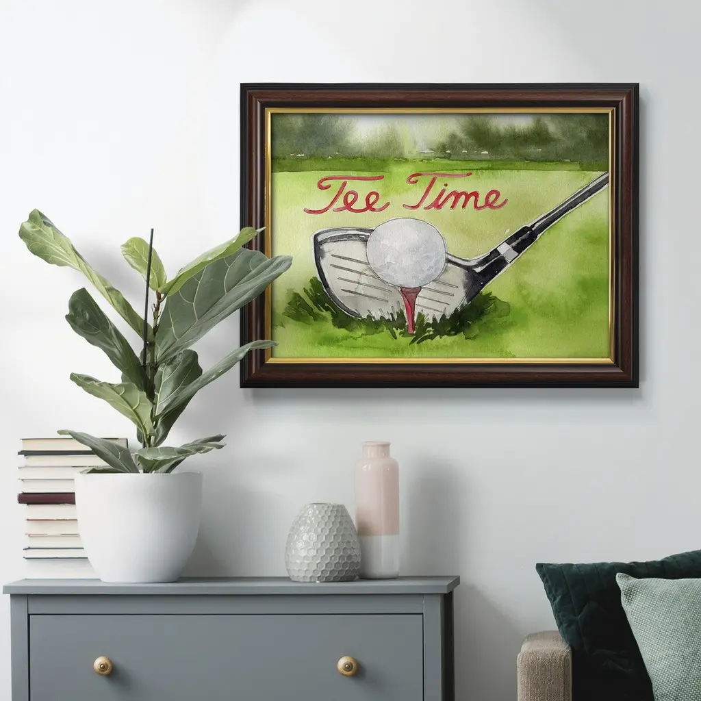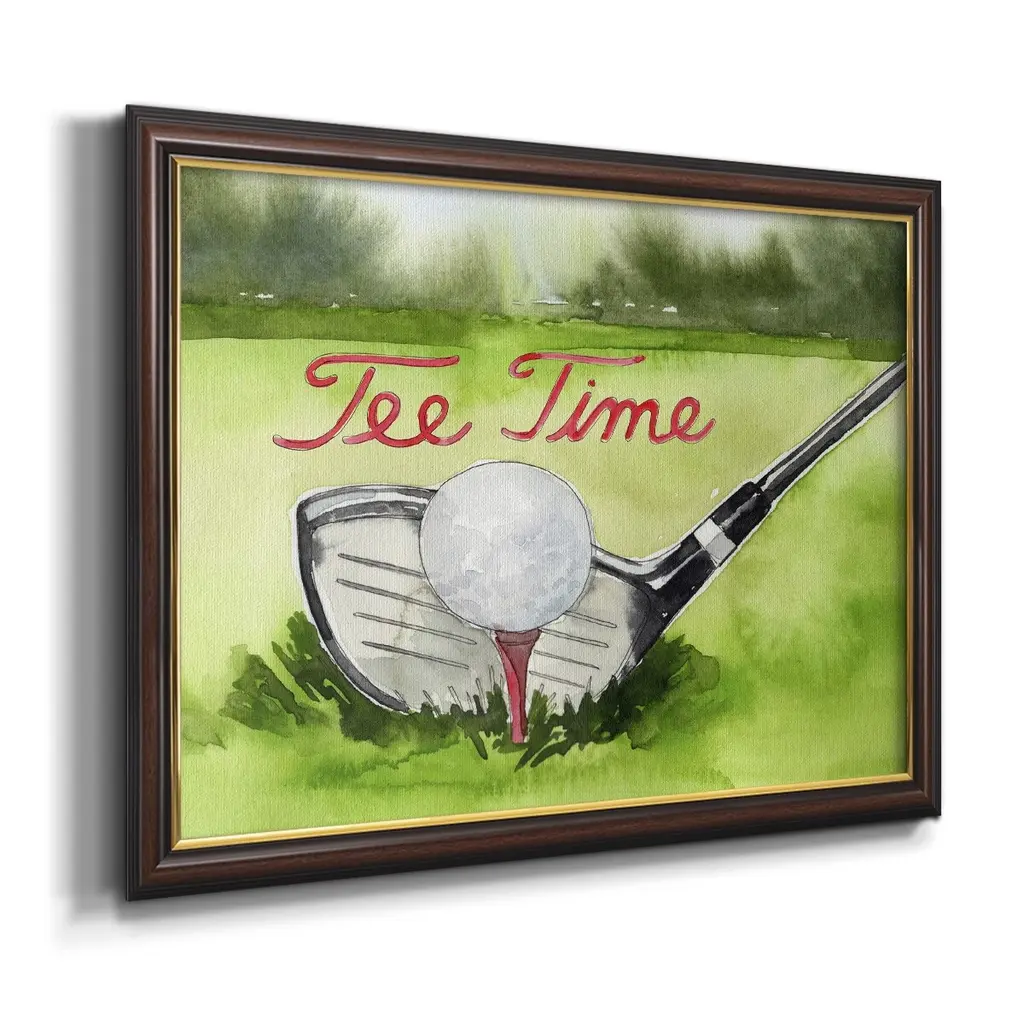 Tee Off Time III Premium Framed Canvas- Ready to Hang A Premium Framed Canvas created to last. Framed in distressed wood and available in an array of sizes and colors Featuring a beveled a solid wood stretcher bar, each piece comes ready to hand 3 SIZES AVAILABLE 16''X20'' - Overall Size 18'X27'' - Overall Size 24''x36'' - Overall Size Each piece is made to order. Each piece comes with hanging hardware. Made in the USA Ready to Hang Giclee Paper Print Acrylic Glass Beveled Matt Board